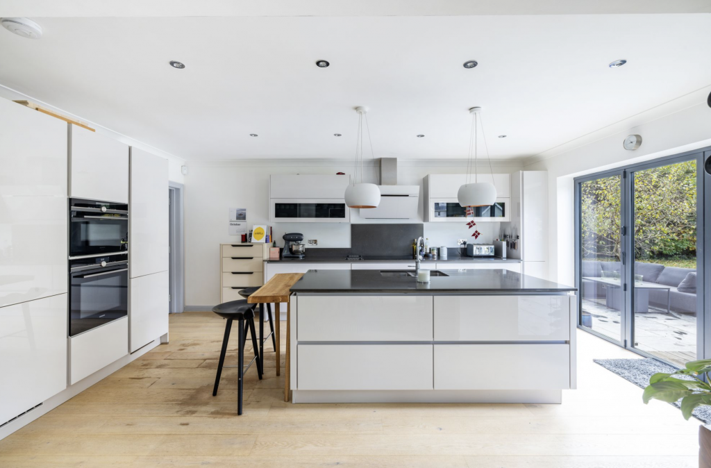 “The stunning open plan kitchen/diner is located at the rear and provides views over the 100 foot+ garden, this is a great place to entertain in. The light stone worktops complement the crittall doors and herringbone floor. The glazed French doors from the sitting room into kitchen, mean that light floods into both rooms throughout the day.