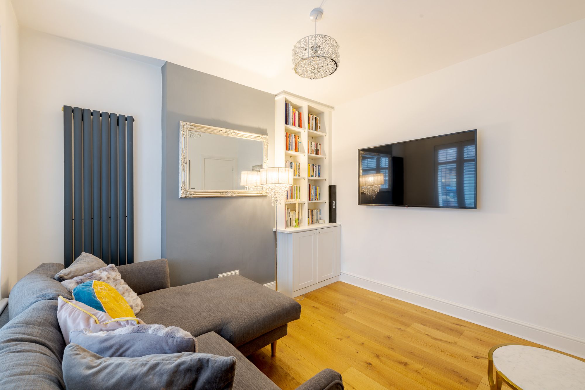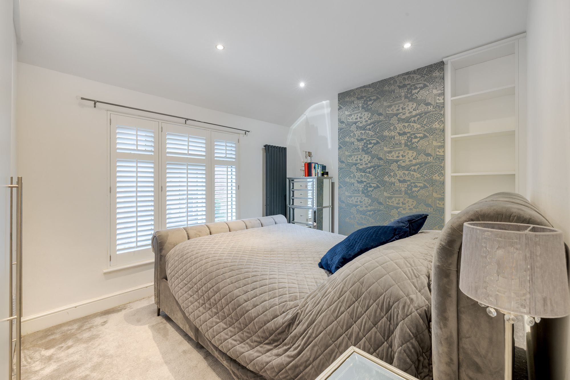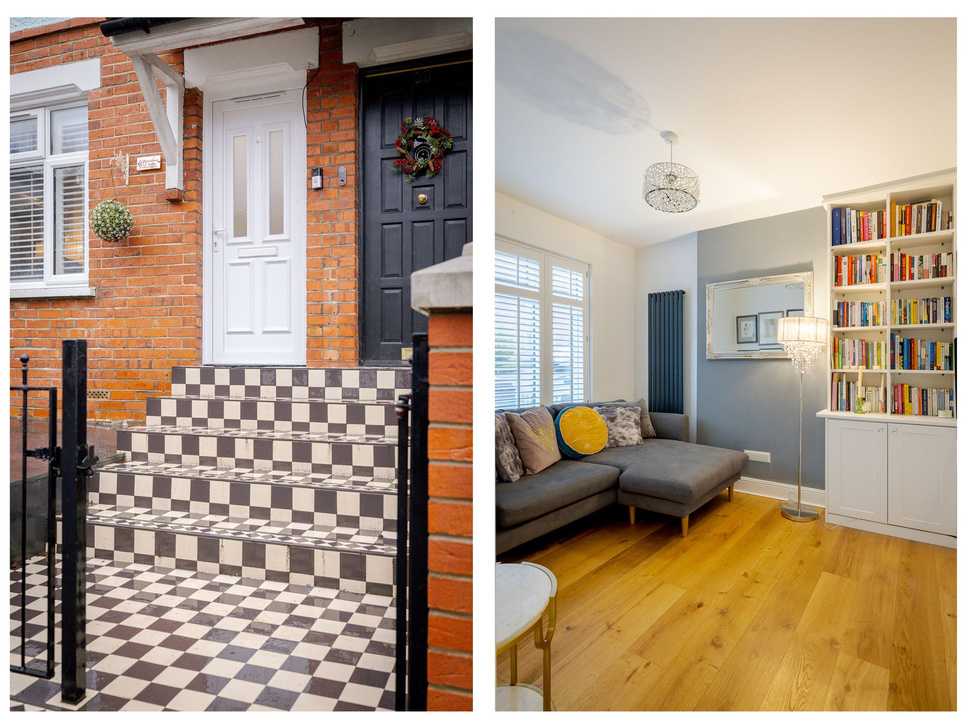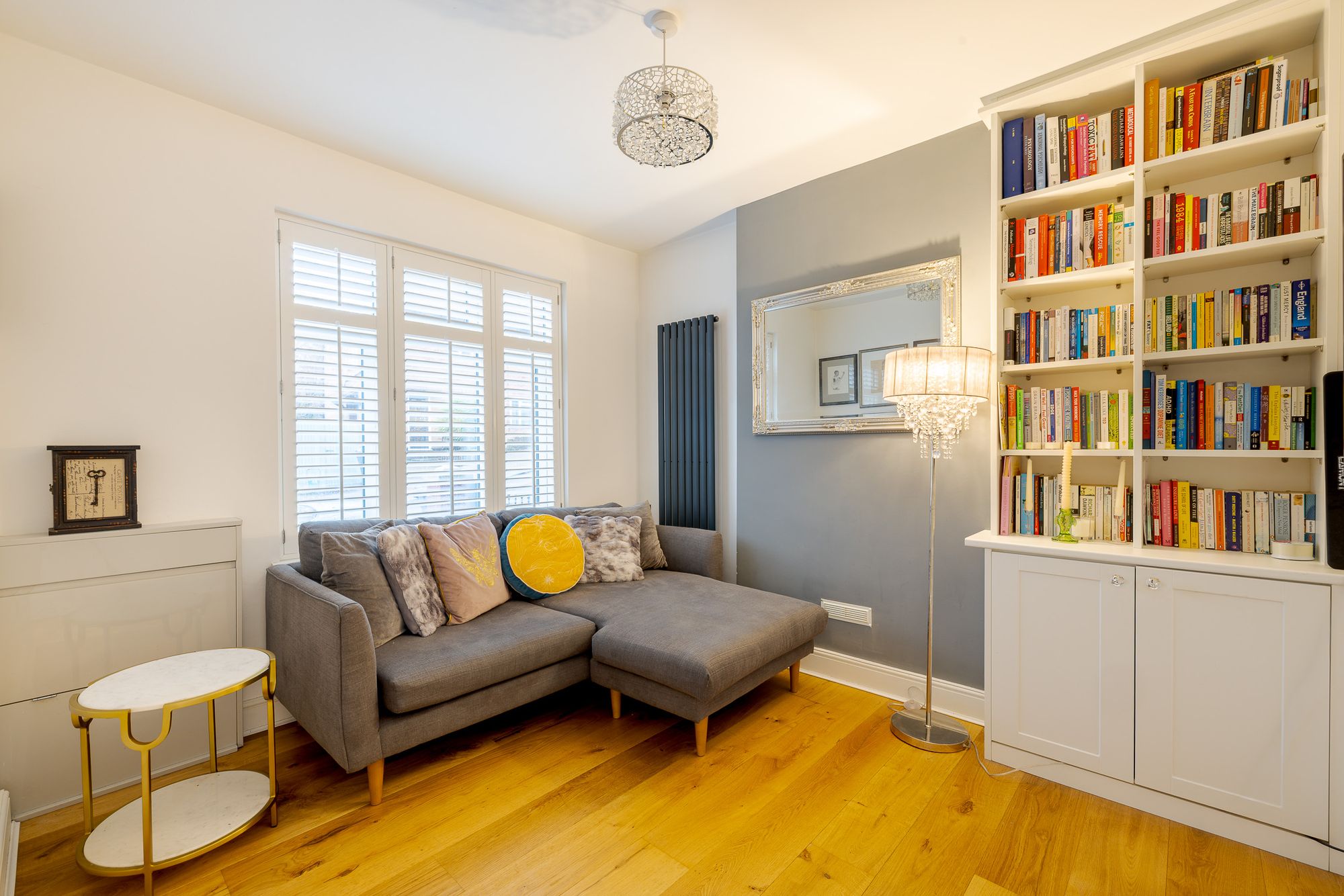 A Victorian mosaic tiled pathway and Brazilian slate frontage create an immediate sense of arrival. Inside, the entrance hall provides useful space for coats and shoes, setting the tone for the well-organised accommodation throughout. Positioned at the front of the house, the living room features engineered oak flooring, custom shutters and bespoke built-in shelving and cabinetry, creating a refined yet comfortable living space.