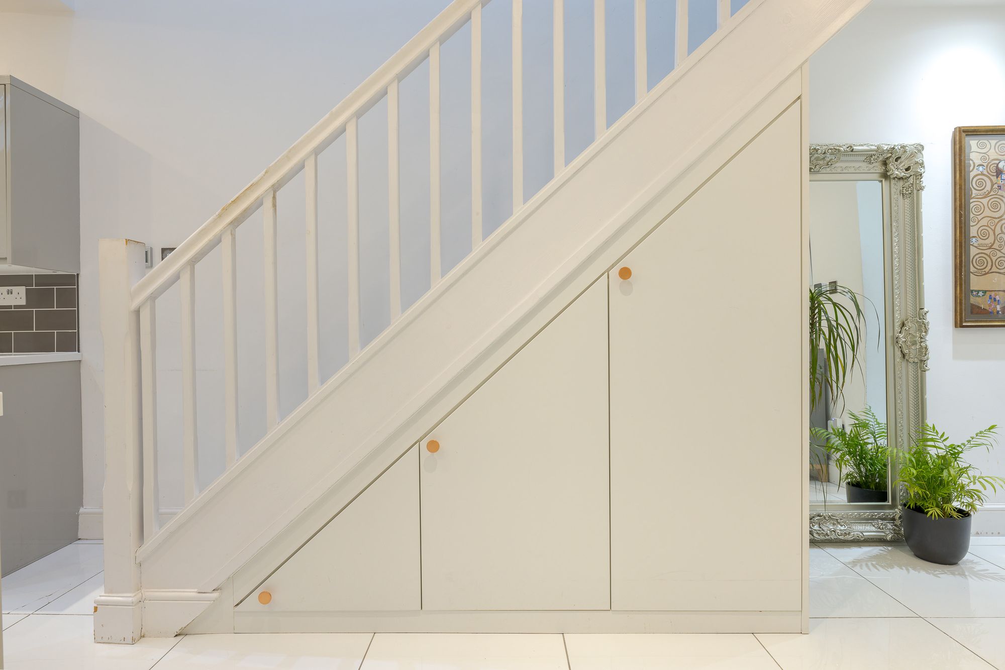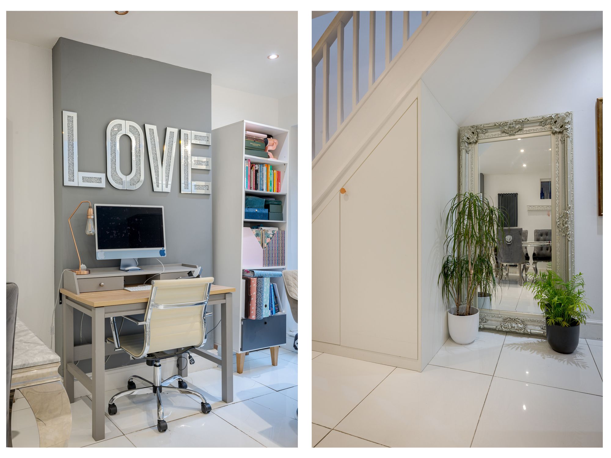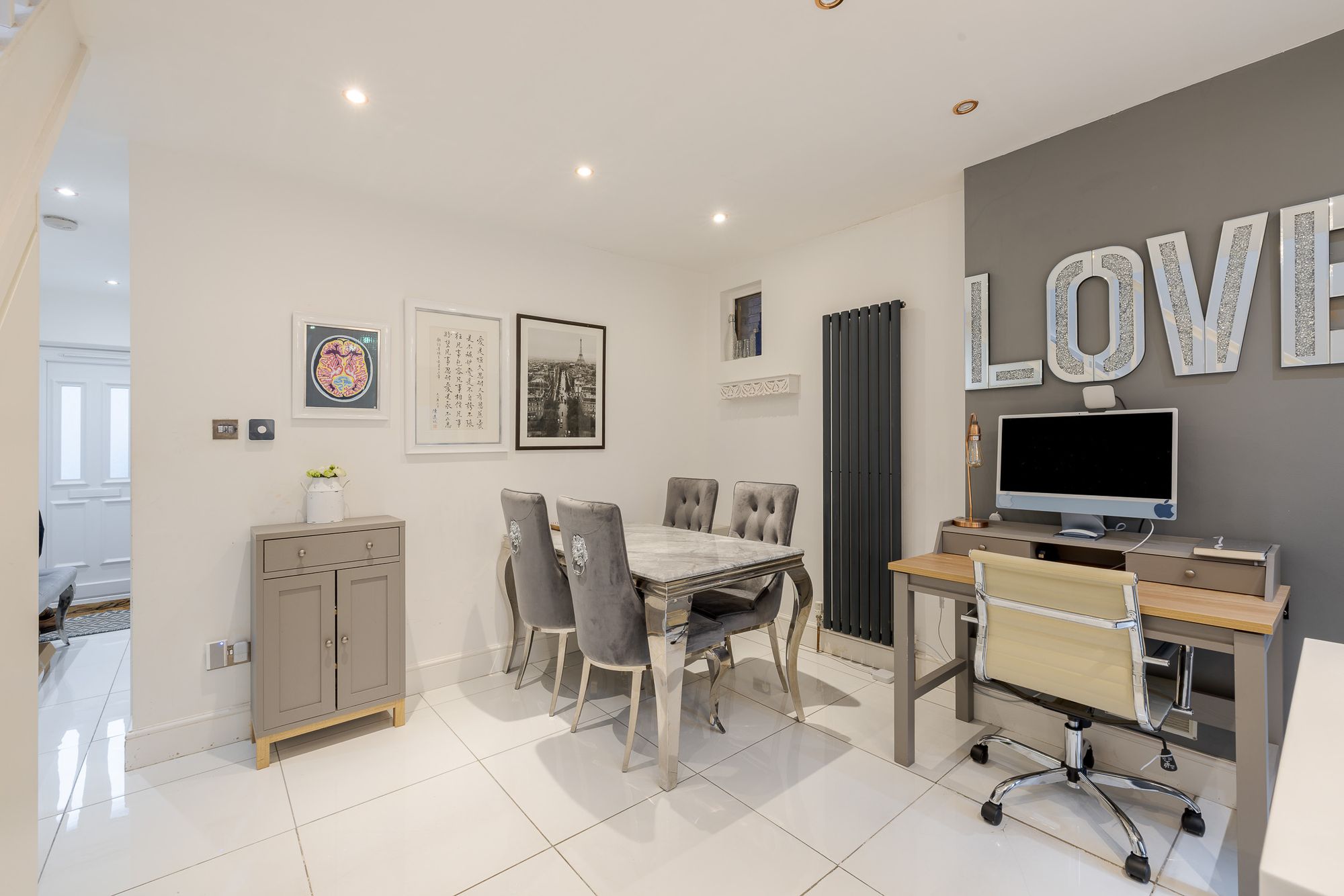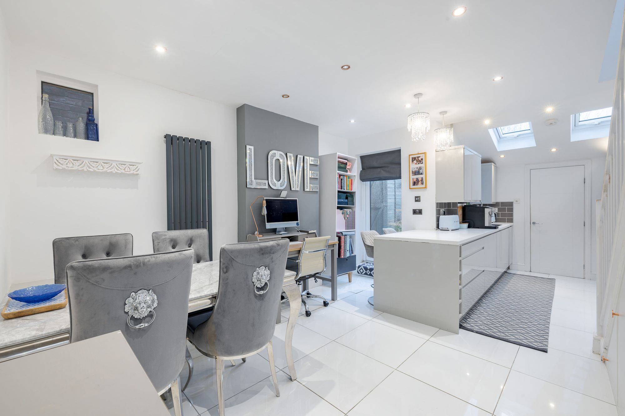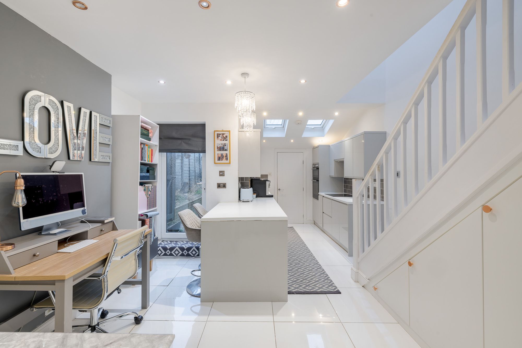 A Victorian mosaic tiled pathway and Brazilian slate frontage create an immediate sense of arrival. Inside, the entrance hall provides useful space for coats and shoes, setting the tone for the well-organised accommodation throughout. Positioned at the front of the house, the living room features engineered oak flooring, custom shutters and bespoke built-in shelving and cabinetry, creating a refined yet comfortable living space.