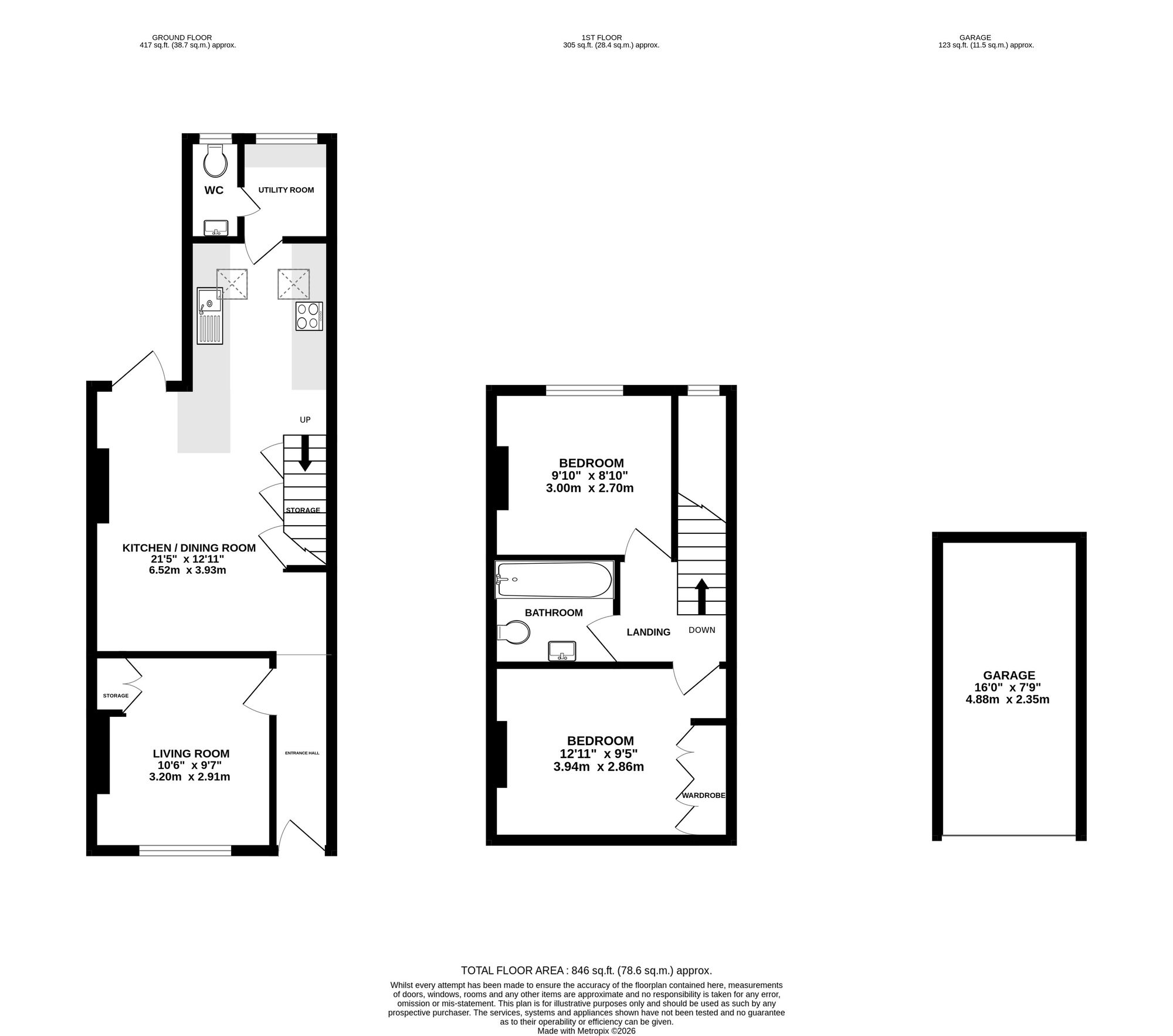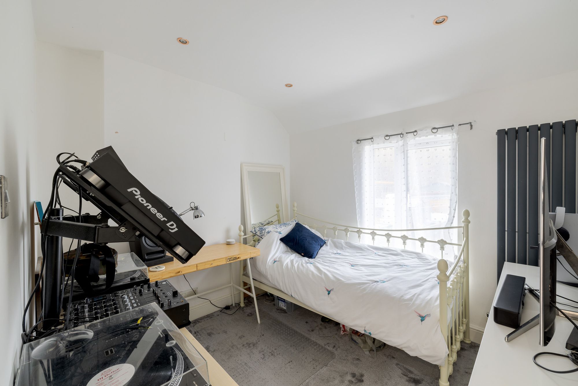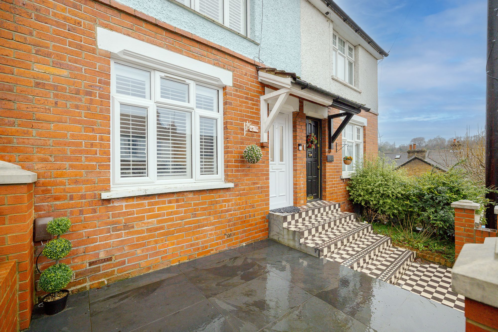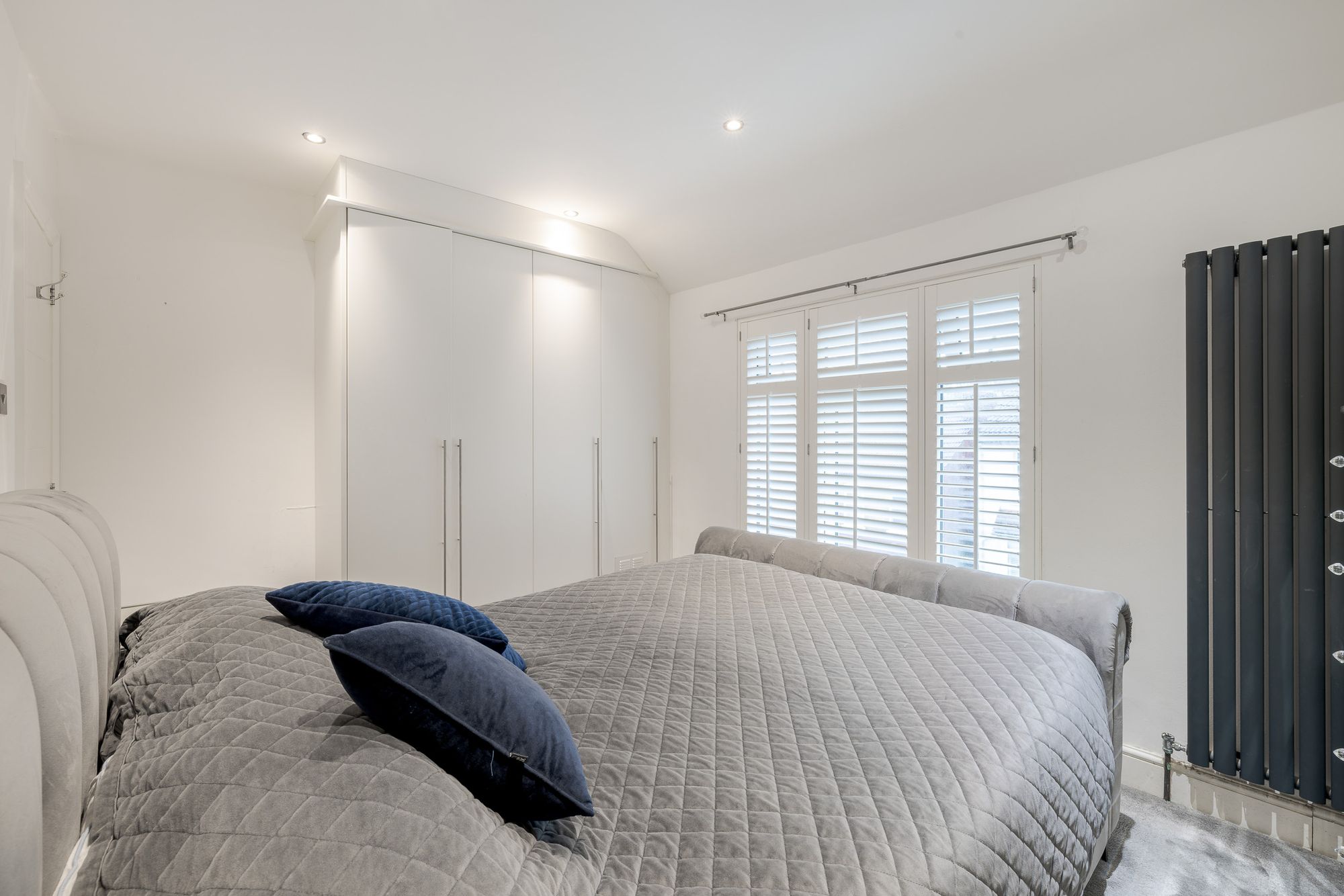 Upstairs are two generous double bedrooms, including a principal bedroom with built-in wardrobes and custom shutters. A contemporary family bathroom completes the first floor, finished with stylish feature tiling. The loft has been fitted with new flooring, an upgraded access hatch and a pull-down ladder, providing excellent storage and clear future potential for conversion, subject to the necessary consents. A Velux window is already in place.