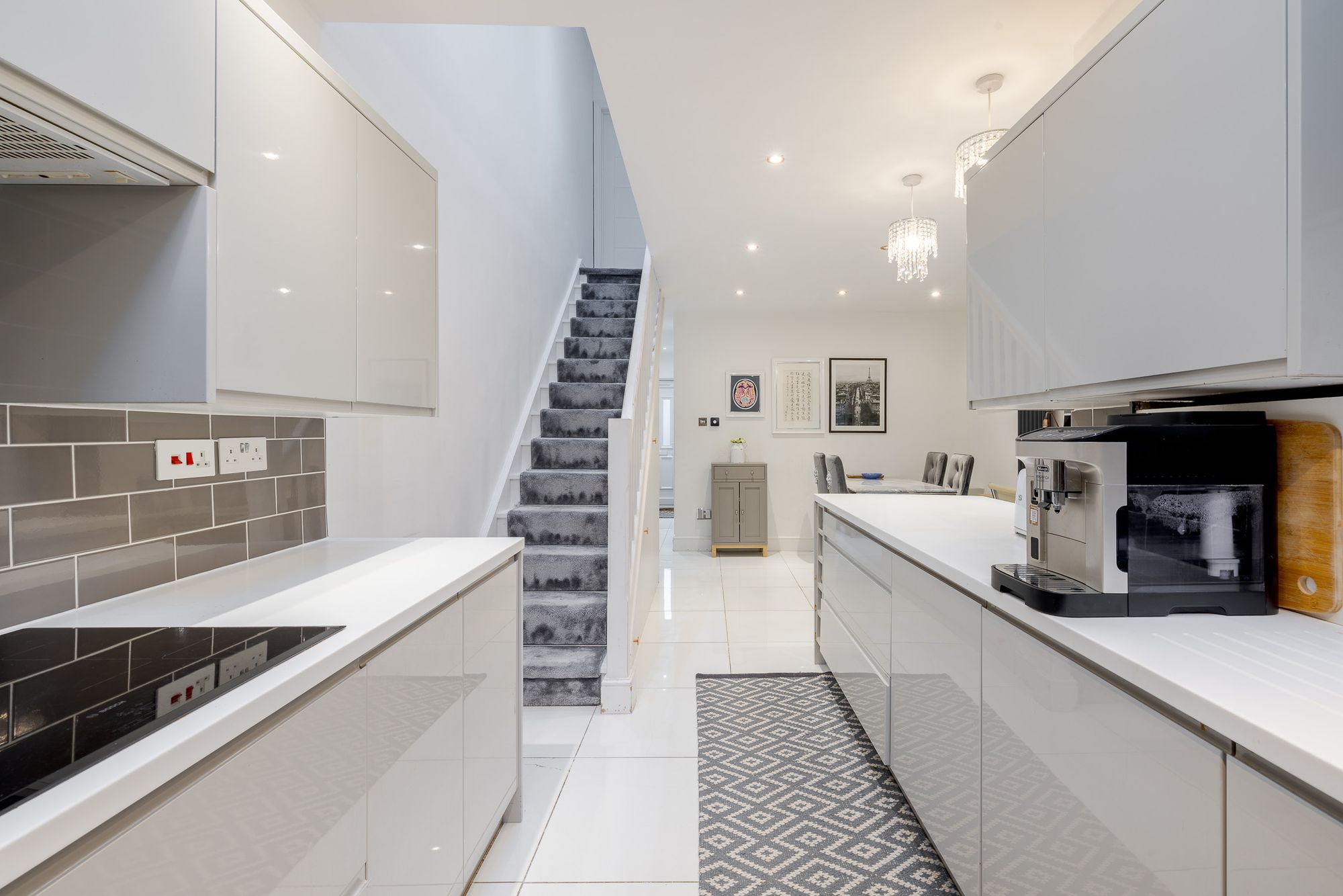 To the rear, the property opens into a bright open-plan kitchen and dining area filled with natural light. Finished with tiled flooring, quartz worktops, a breakfast bar and integrated Bosch appliances, the space is well suited to both everyday living and entertaining. Underfloor heating adds further comfort, while direct access to the garden patio creates a seamless indoor–outdoor connection. Off the kitchen is a practical utility room with additional cupboard space and housing for the boiler, along with a convenient ground-floor WC. Bespoke storage beneath the stairs further maximises functionality.