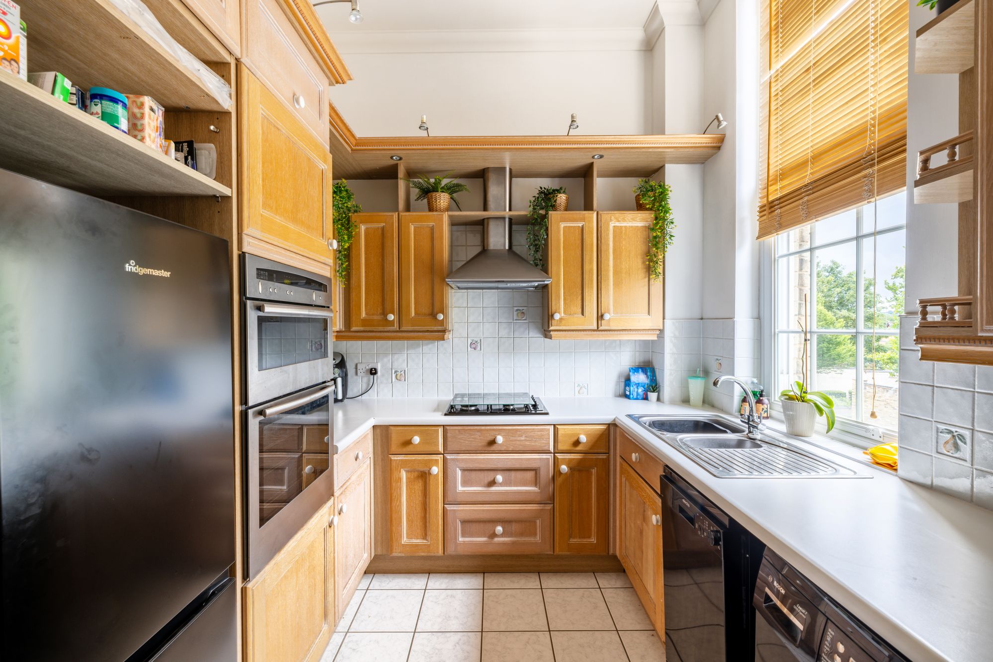 The shaker style kitchen, adjacent to the living area, is a chef’s delight, equipped with integrated and freestanding appliances, ensuring functionality and style meet effortlessly. An abundance of versatile cabinet space ensures all culinary essentials are neatly stored away.