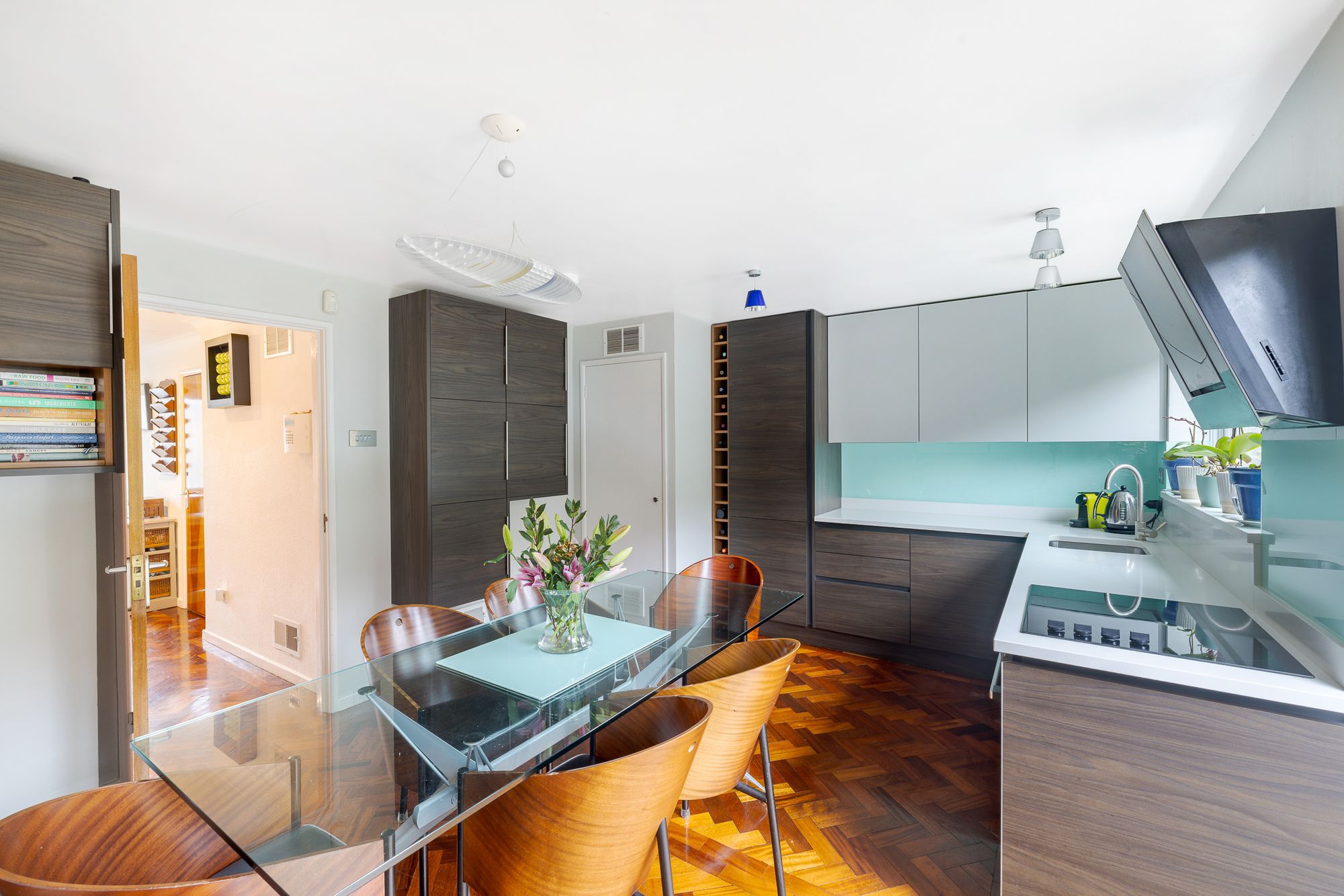 Upon entering, a welcoming entrance hall leads to the newly refurbished kitchen, thoughtfully designed with integrated appliances and ample storage. There is generous space for a dining table, creating a wonderful social hub for everyday living and entertaining. French doors open directly onto the rear garden, allowing natural light to flood the space. Beautiful parquet flooring runs seamlessly throughout the ground floor, adding warmth and character. A convenient downstairs W/C and integral garage complete this level.