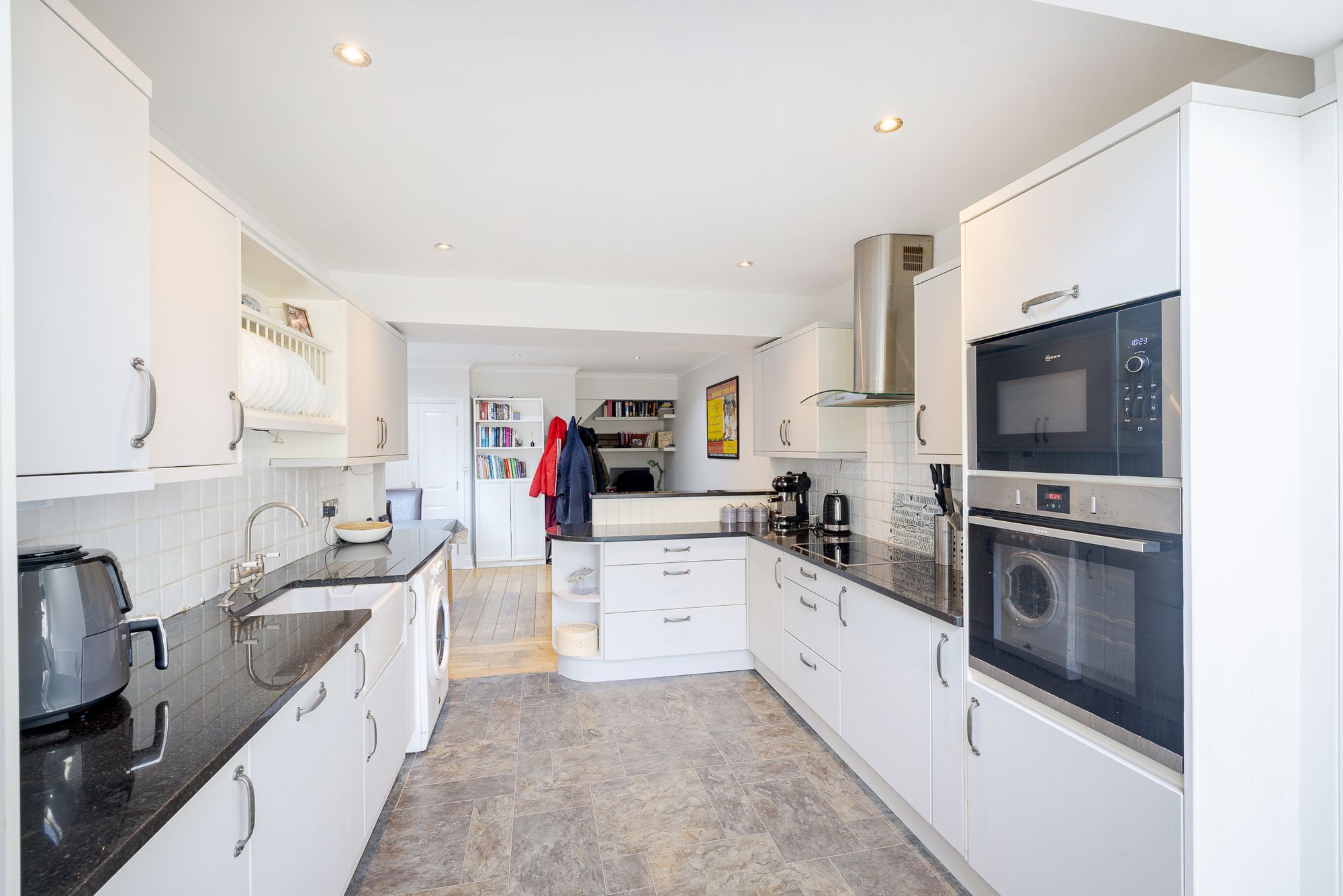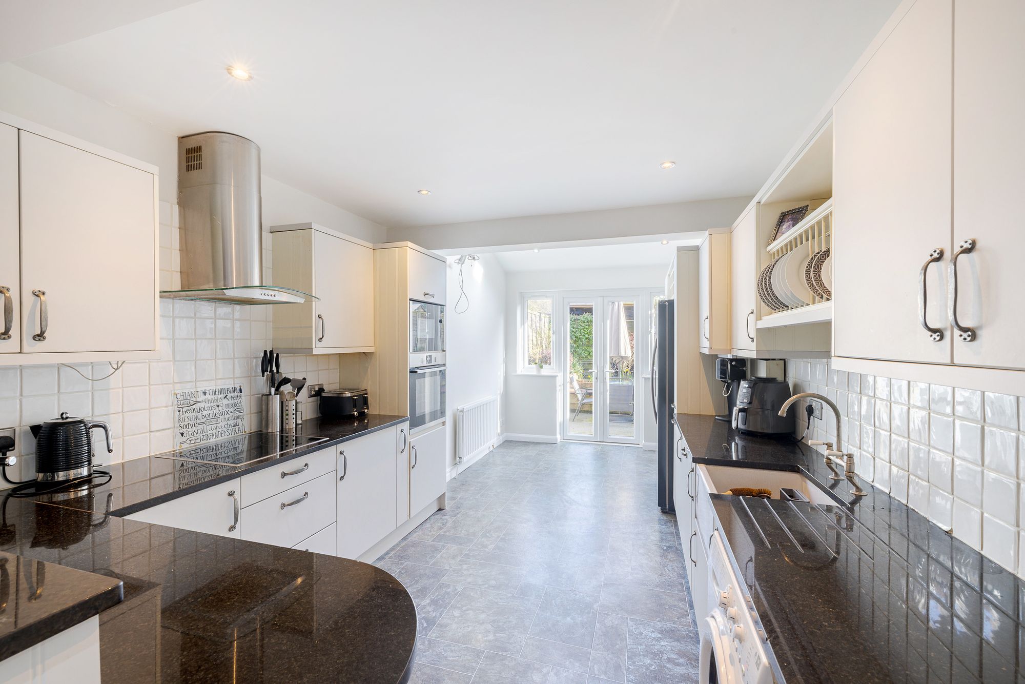 The recently refurbished kitchen is finished to a high standard, boasting a breakfast bar peninsula, built in appliances, and sleek quartz work surfaces. French doors open directly onto the rear garden, enhancing the indoor outdoor flow.