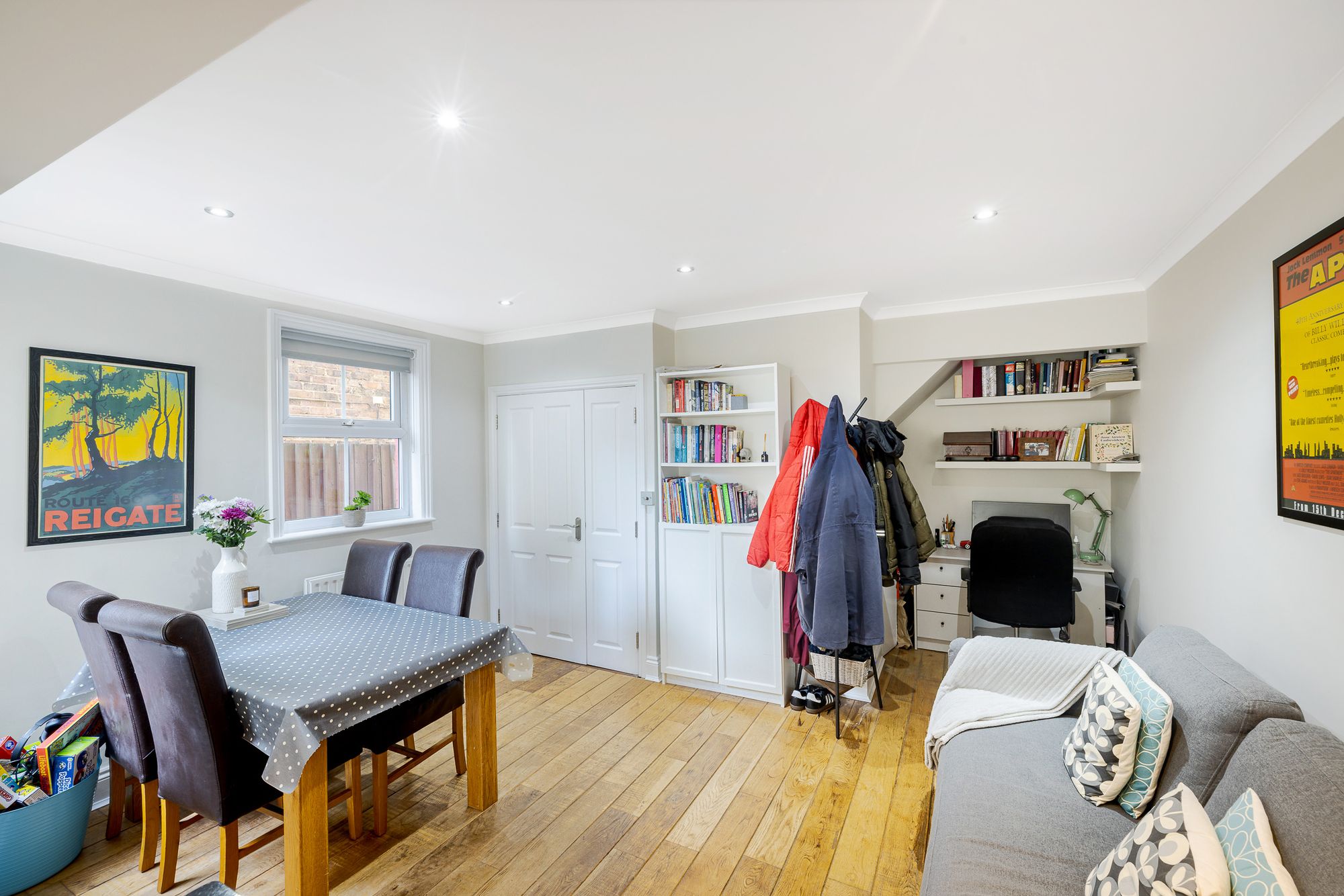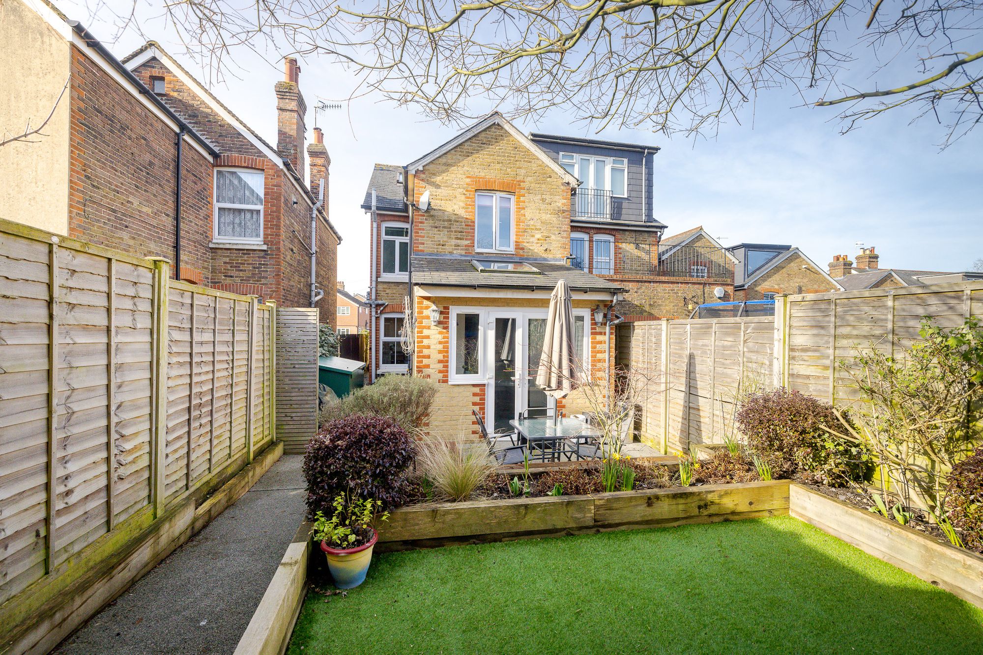 Stylish three bedroom home in Reigate. Modern kitchen, three floors, two bathrooms, study, garden, parking. Close to schools, parks, and station.