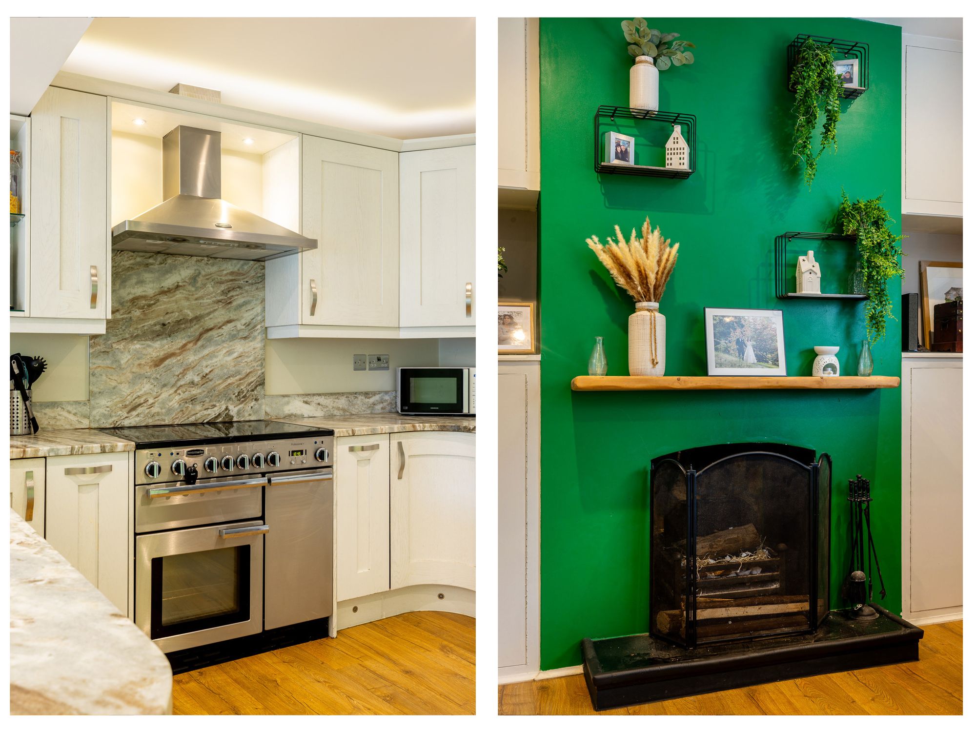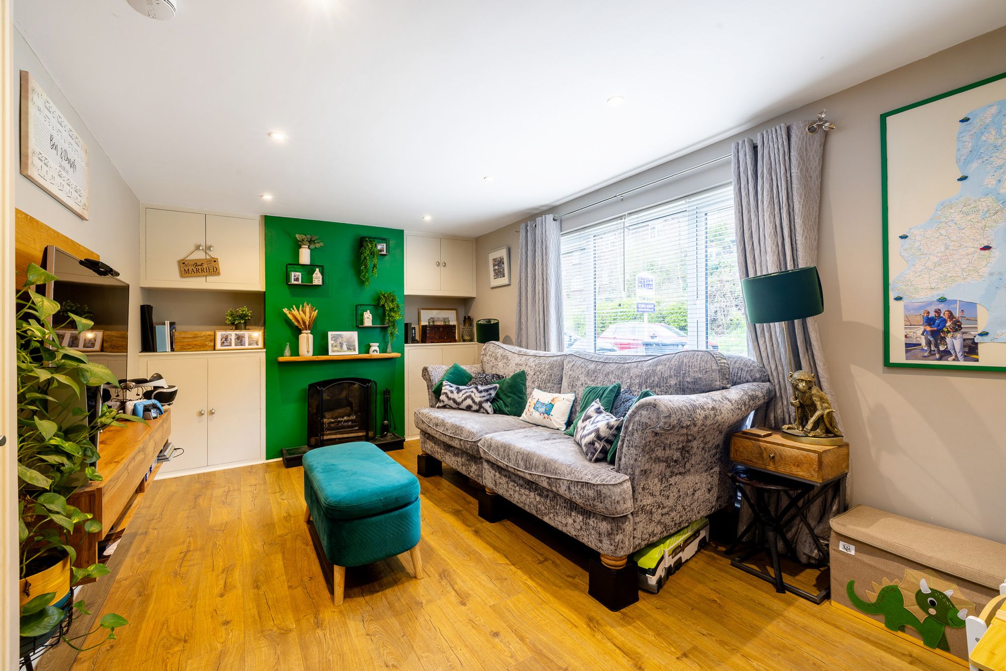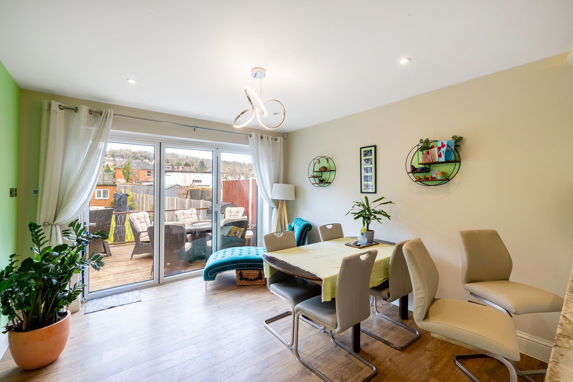 On the ground floor, the home offers a welcoming entrance hall with space for coats and shoes, along with useful under-stairs storage. The living room is bright and inviting, centred around a charming feature fireplace. To the rear, a stunning open-plan kitchen and dining area creates the heart of the home, fitted with solid stone worktops and integrated appliances. Bi-fold doors from the dining area open out onto a raised decking area, seamlessly blending indoor and outdoor living.