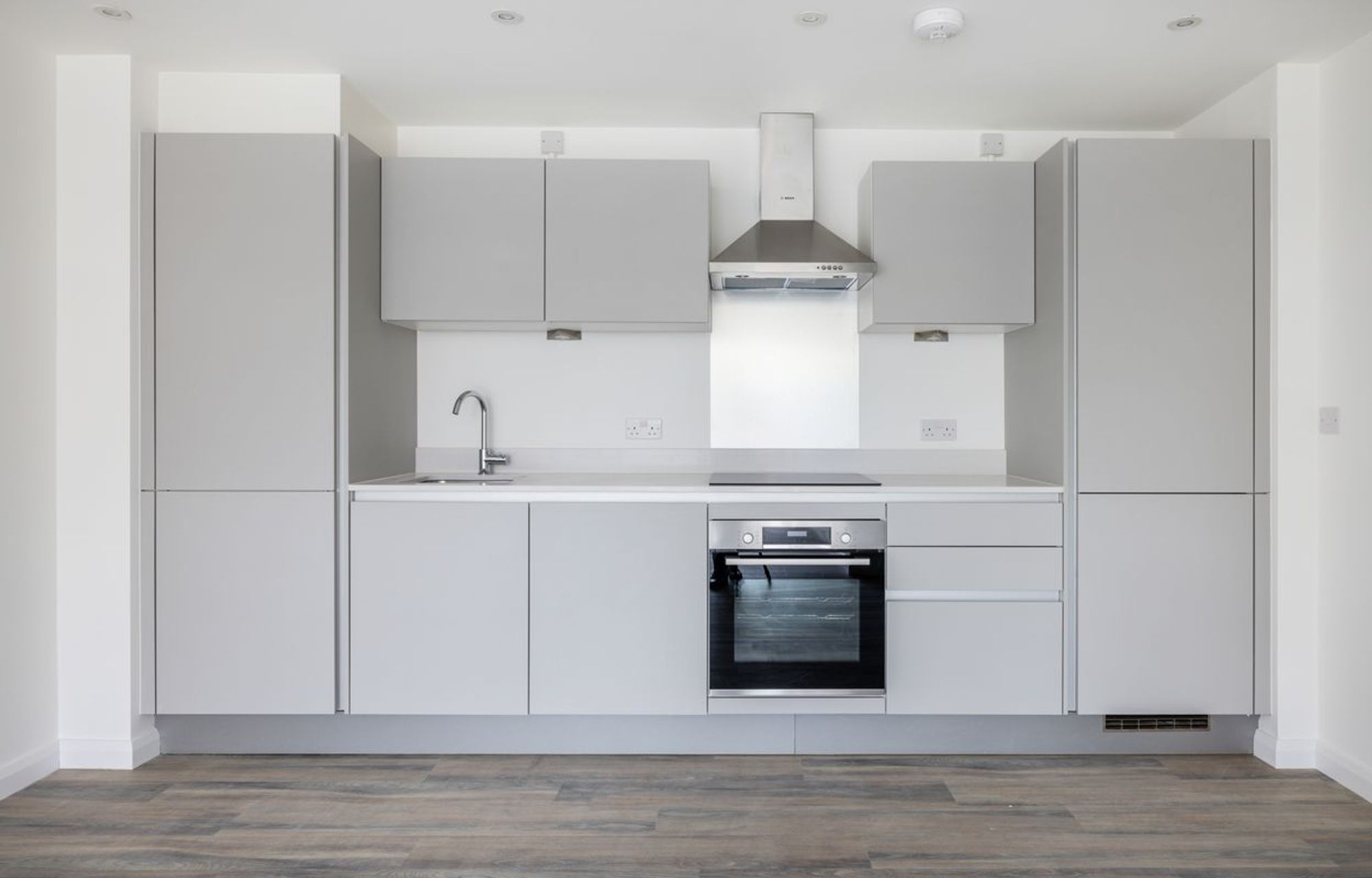 As you walk through the front door there is an entrance hallway with a storage cupboard. You will notice the Amtico flooring beneath your feet, which flows through to the open plan kitchen/dining/living room. The contemporary kitchens are by German designer NOLTE, with handleless light grey units for a seamless finish. Complete with Silestone Blanco Norte worktops and grip rails in either white or stainless steel. Integrated with a full range of Bosch appliances for ease to include a single oven, fridge/freezer, washer/dryer, and a chimney hood. These modern bathroom suites have been designed with white Portland sanitary-ware and finished with grey wall and floor tiles. Comprising of a wall-hung single basin with drawer, perfect for storing toiletries out of sight. Warm your towels on the chrome heated towel rail ready for you when you get out the bath. The bath is complete with a glass shower screen and shower head, with a thermostatic bath and shower mixer. The wall hung WC has a rapid flushing cistern and soft closing seat. Lastly, the bedroom is a good sized double, decorated in a neutral colour palette with grey carpet.