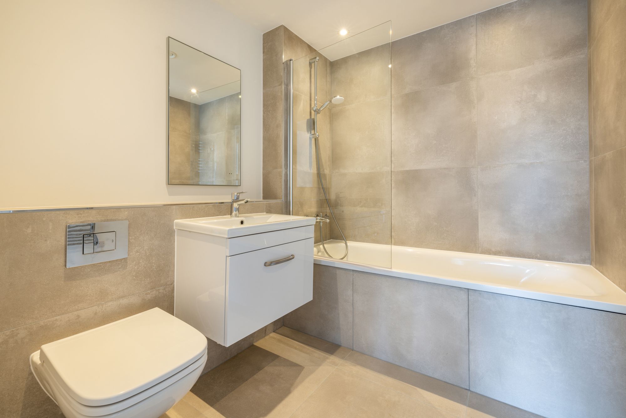 The modern bathroom has been designed with white Portland sanitary-ware and finished with grey wall and floor tiles. Comprising of a wall-hung single basin with vanity unit, perfect for storing toiletries out of sight. The bath is complete with a glass shower screen and shower head, with a thermostatic bath and shower mixer.