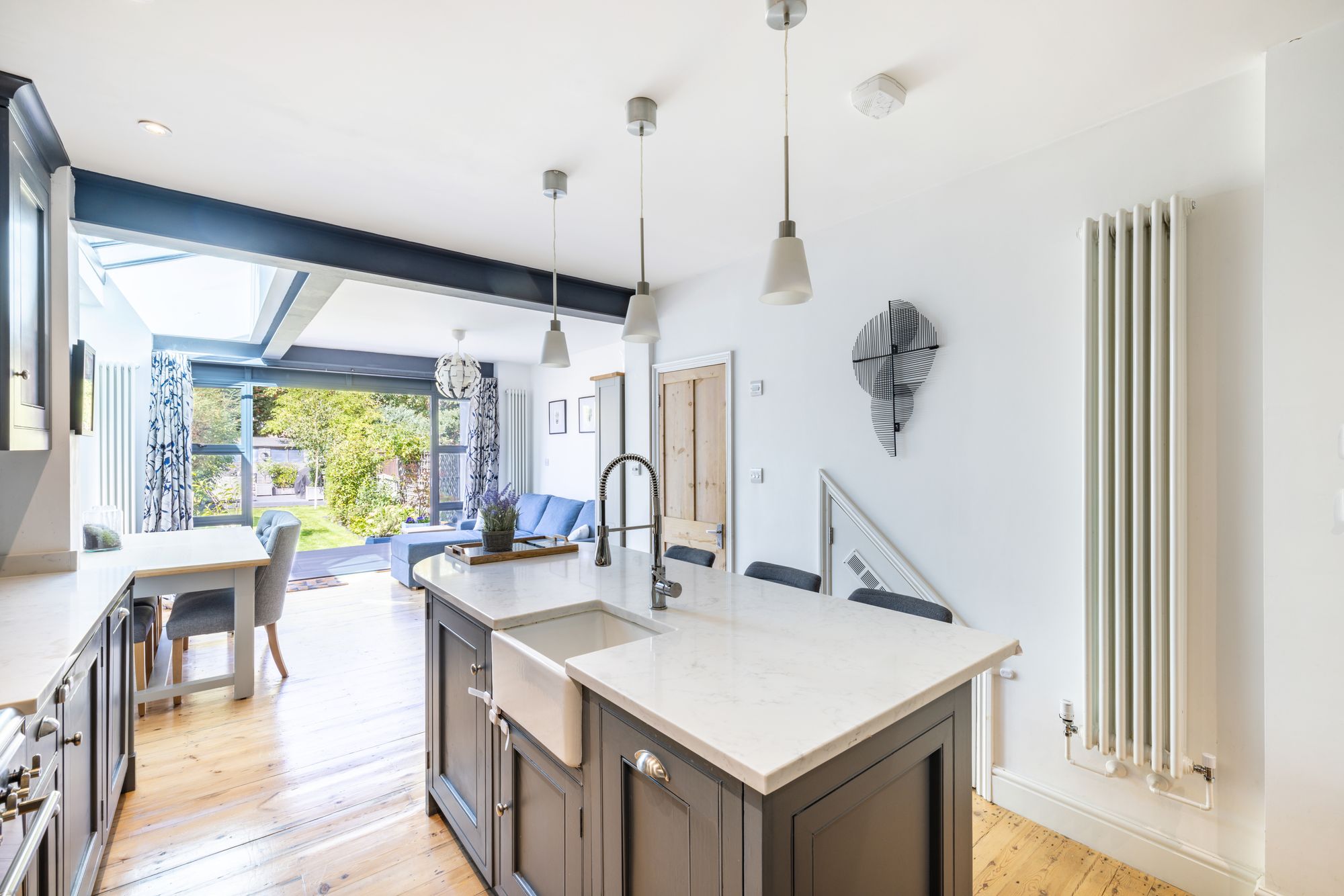 The property opens with a welcoming entrance hall leading to a bright front living room, enhanced by a square bay window. To the rear, a recently renovated kitchen features a stylish central island and flows seamlessly into a spacious dining area perfect for entertaining. The kitchen also benefits from an air conditioning unit, ensuring comfort all year round. French doors open directly onto a level rear garden, mainly laid to lawn with a decked area ideal for outdoor dining. A convenient downstairs WC completes the ground floor.