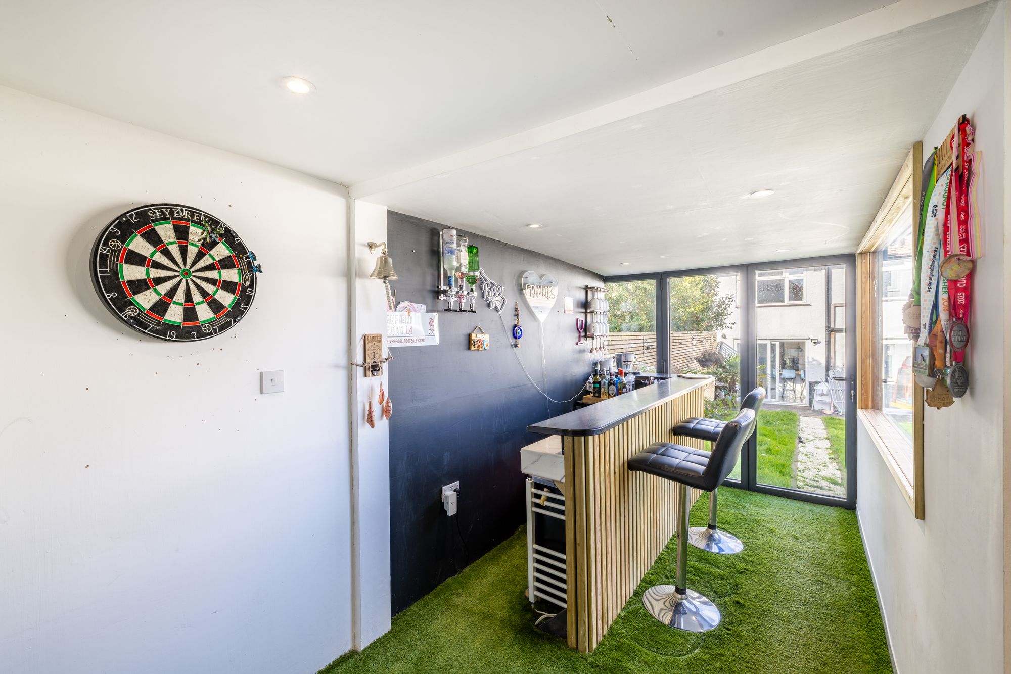 The beautifully landscaped rear garden is mainly laid to lawn, complemented by a raised decking area ideal for outdoor dining and relaxation. A versatile garden room sits at the rear, currently used as a home gym and bar area, offering great potential as an office or studio.