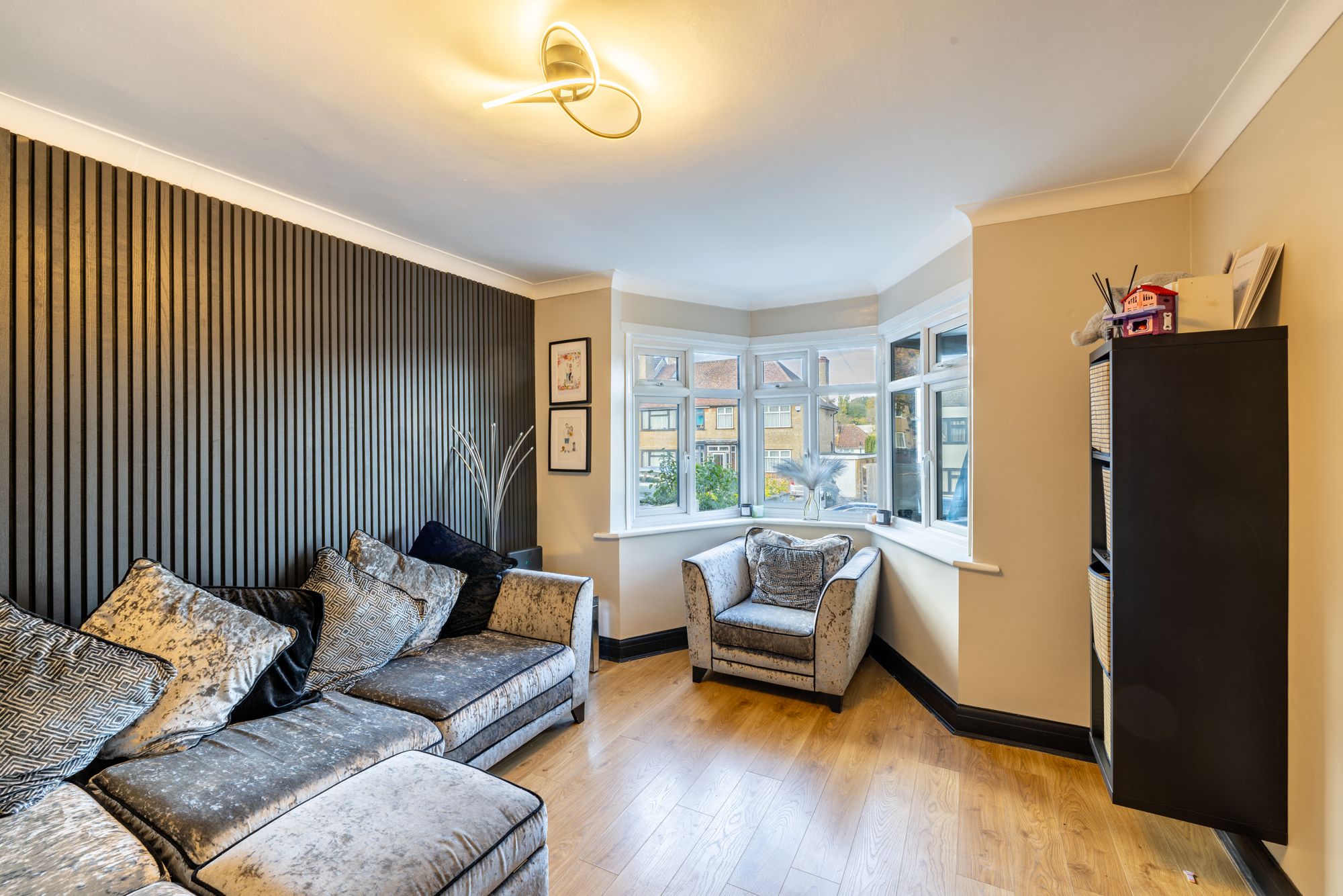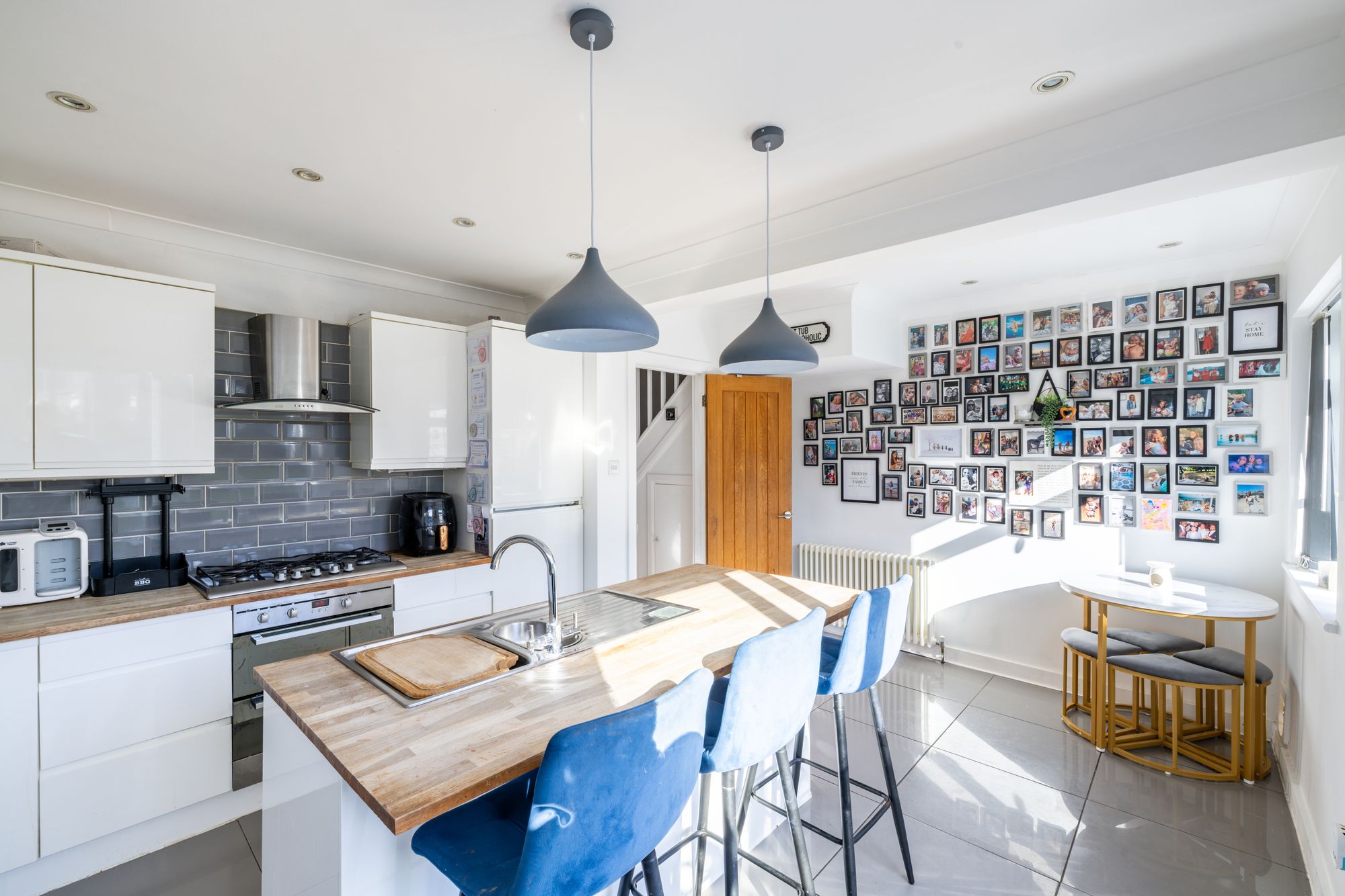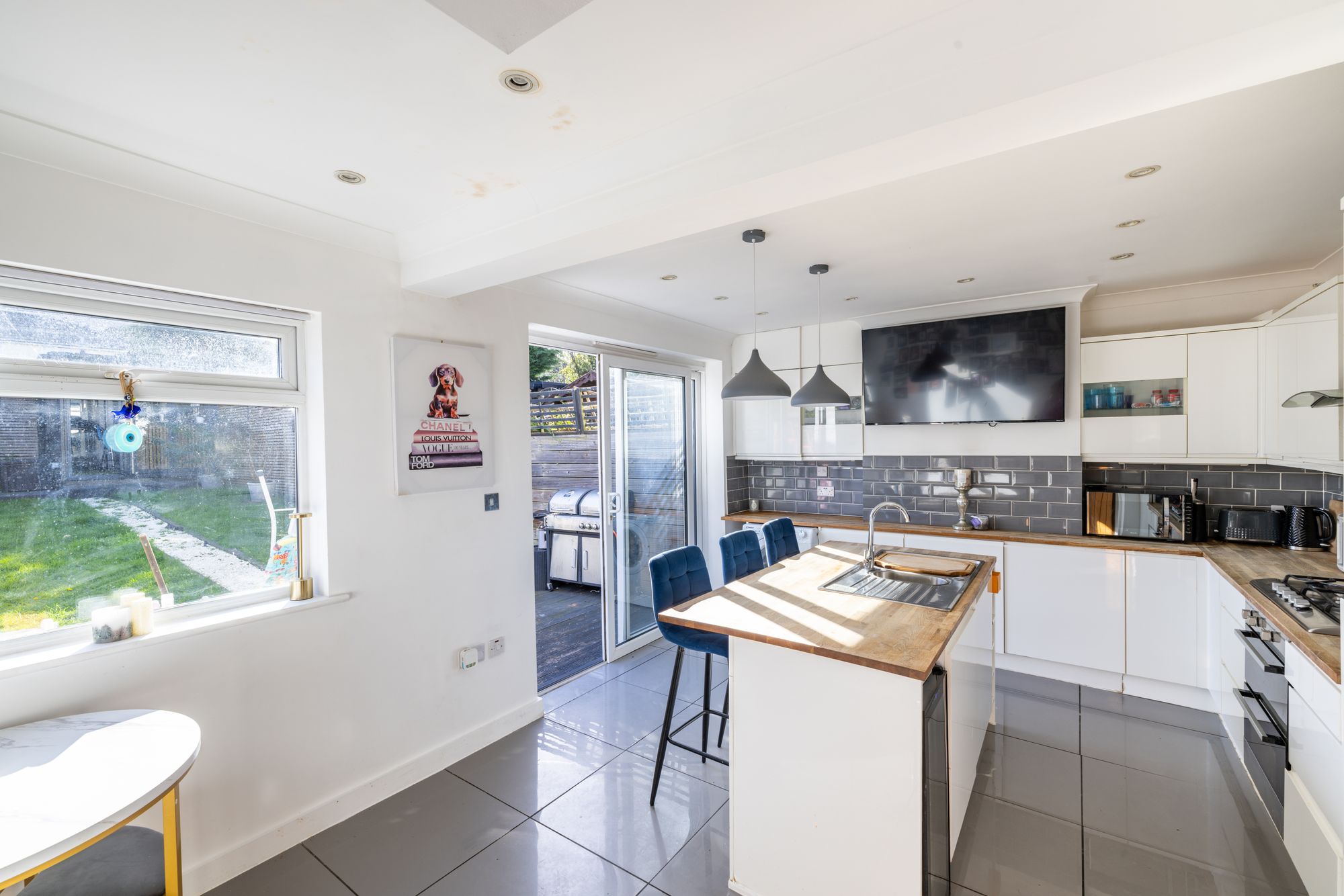 Upon entering through the welcoming porch, you are greeted by a bright hallway leading to a spacious front living room, complete with a charming bay window and an eye catching feature wood panelled wall. To the rear, the heart of the home is the contemporary kitchen/diner thoughtfully designed with a stylish feature island, ample storage, and sleek sliding glass doors opening directly onto the garden, perfect for entertaining or family gatherings.