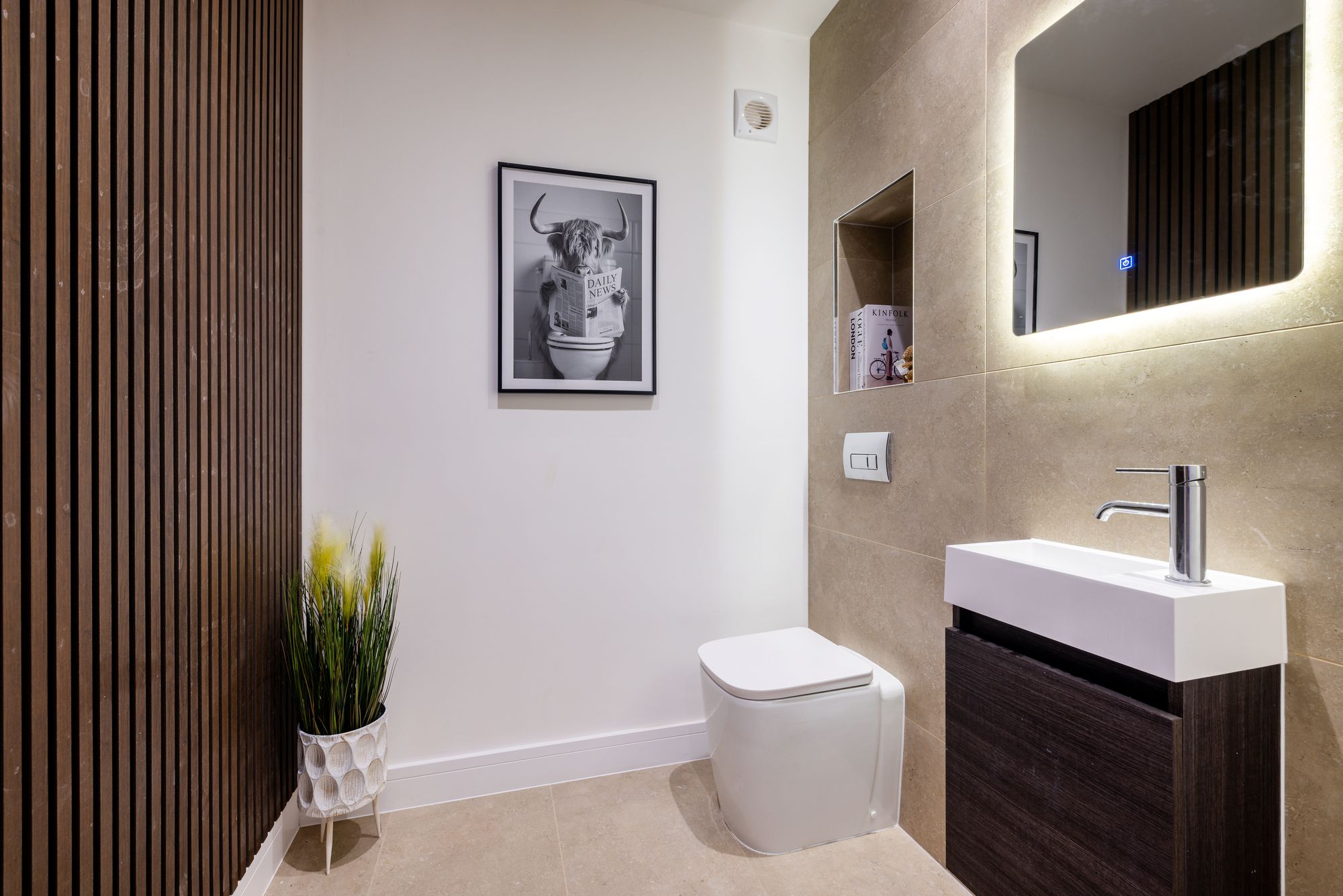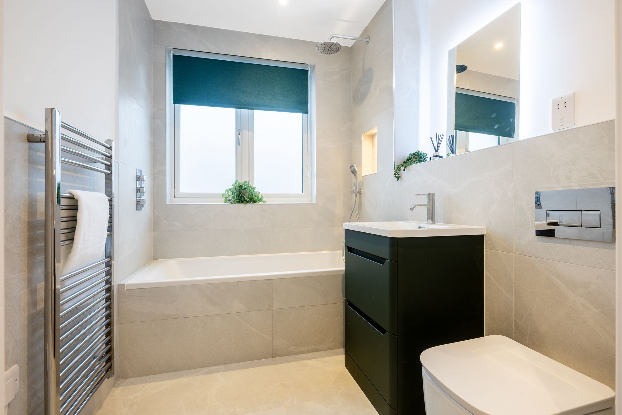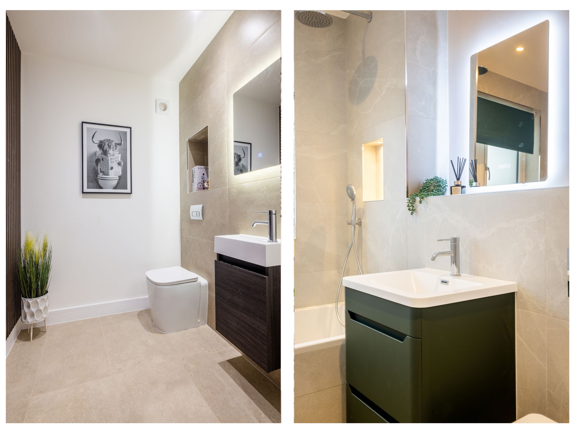 The family bathroom rivals that of a boutique hotel, exquisitely finished with sleek porcelain tiles, contemporary chrome fittings, and enhanced by a statement mirror with ambient mood lighting and integrated Bluetooth, bringing a touch of spa-like indulgence to your daily routine.