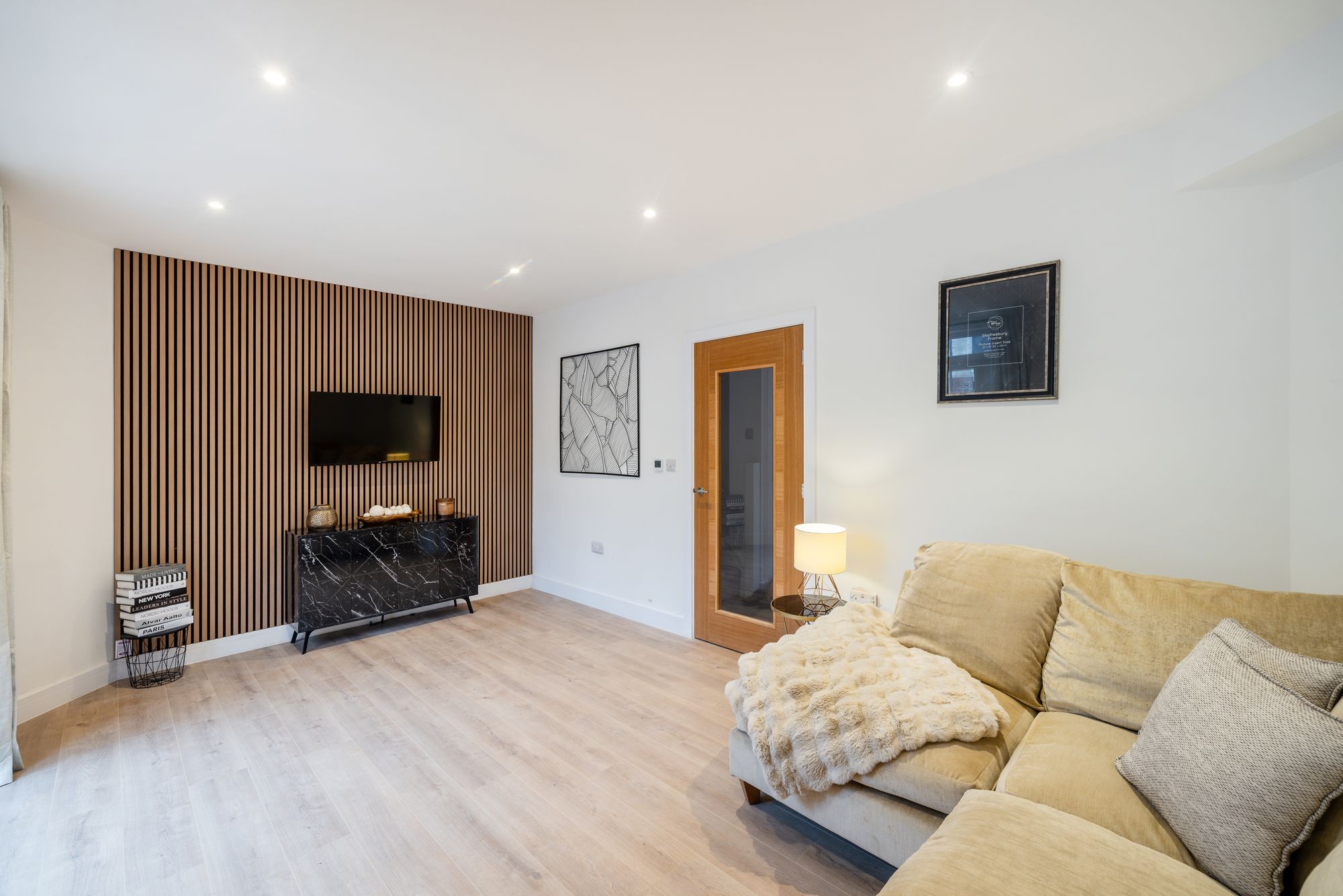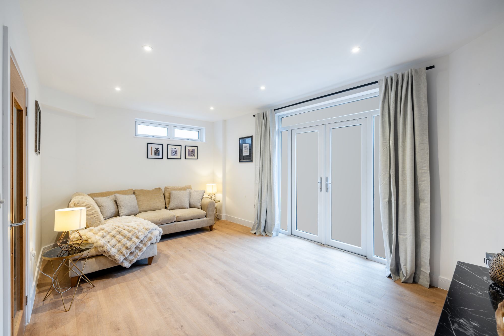 Flowing seamlessly from this space, the elegant lounge invites relaxation, bathed in natural light and opening through striking double-glazed French doors onto the private garden, perfect for al fresco dining or tranquil evenings under the sky. A beautifully appointed cloakroom completes the ground floor, finished with refined porcelain tiling and bespoke decorative panelling, elevating even the smallest spaces into something extraordinary.