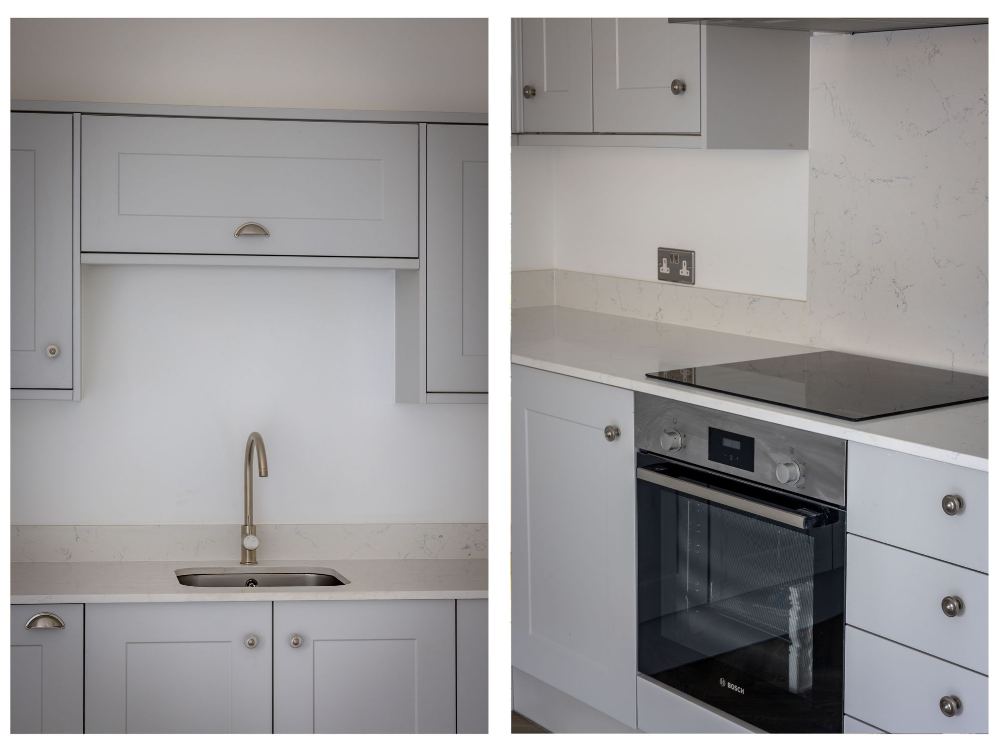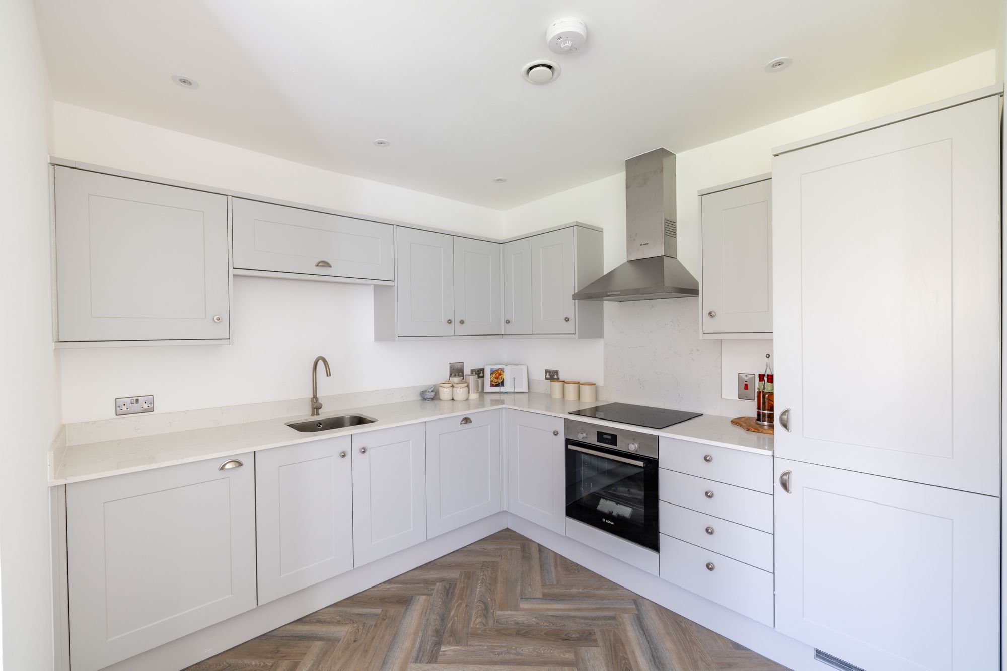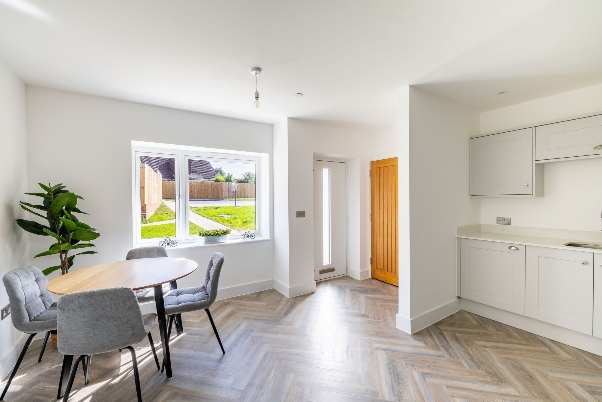 Upon entering, you’re welcomed by a generous hallway with a large storage cupboard and a handy guest WC. To the front of the home is a versatile study, perfect for remote working, a playroom, or even a fourth bedroom. The heart of the home is the stylish kitchen/dining area, fitted with modern matte grey shaker-style units, Quartz worktops, and integrated Bosch and Lamona appliances, all tied together with sleek finishes including under-unit LED lighting and a brushed chrome swan neck mixer tap.