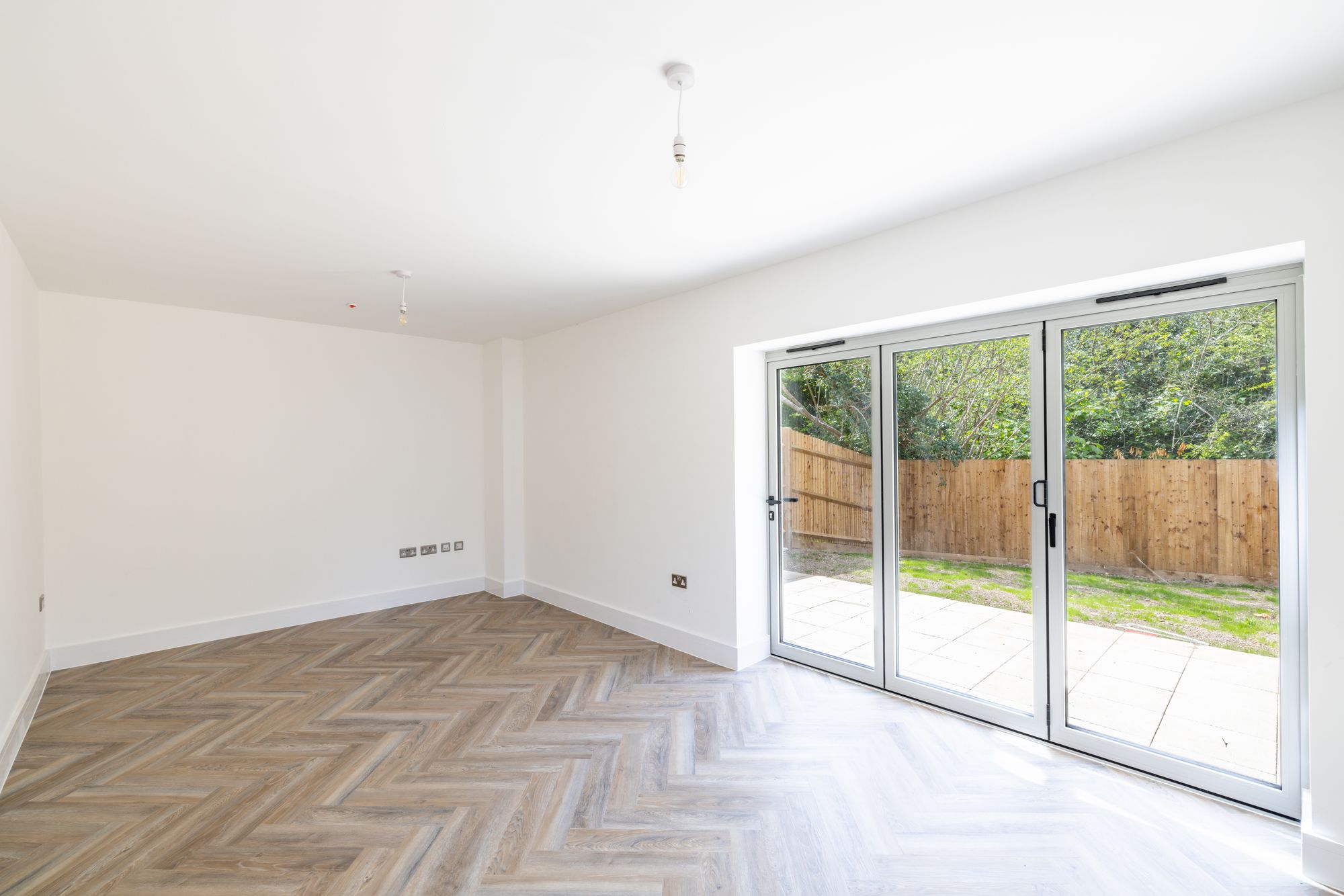 To the rear, the spacious living room is filled with natural light thanks to bifold doors that open directly onto the private garden, ideal for summer entertaining or peaceful evening relaxation with tranquil views of surrounding greenery.