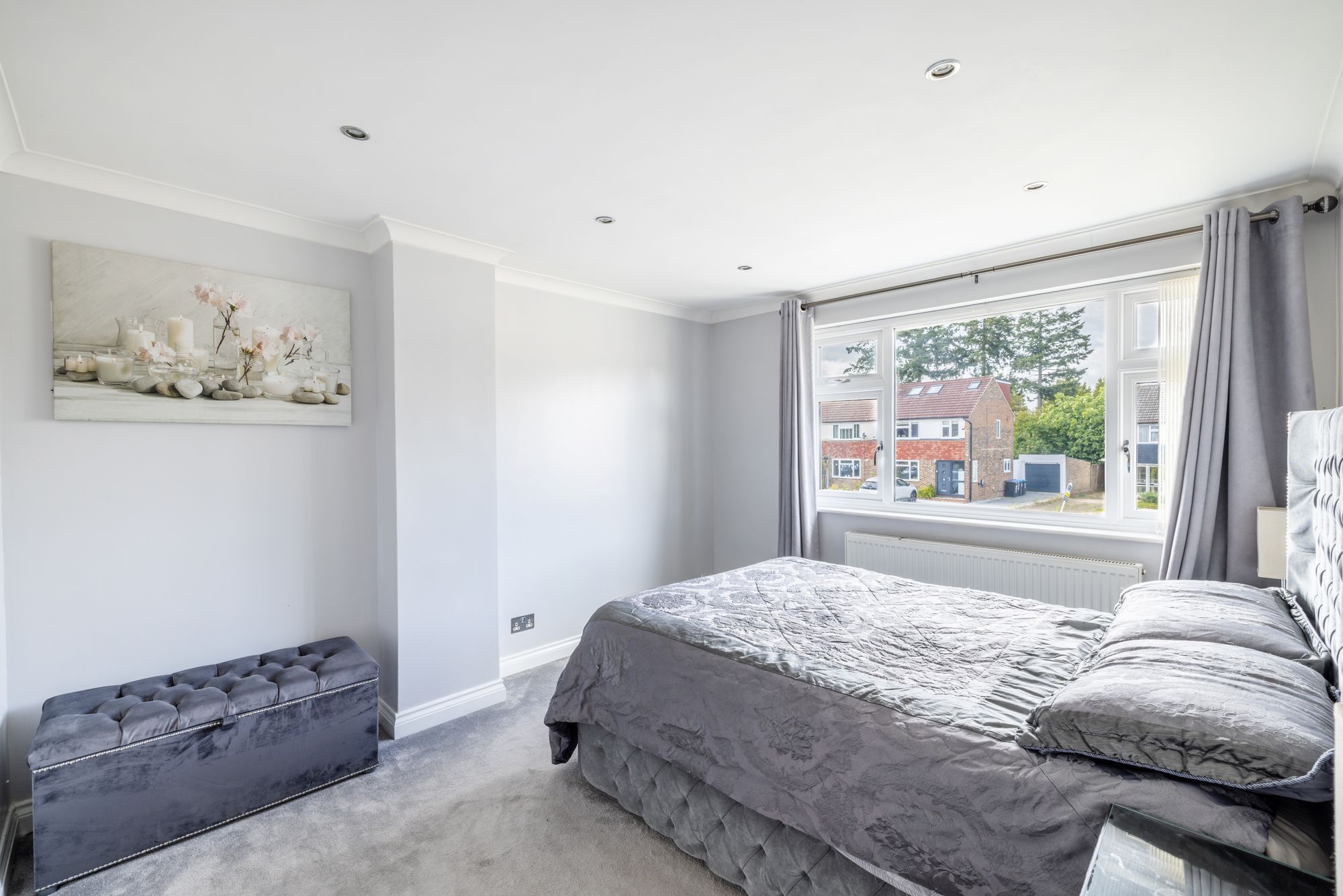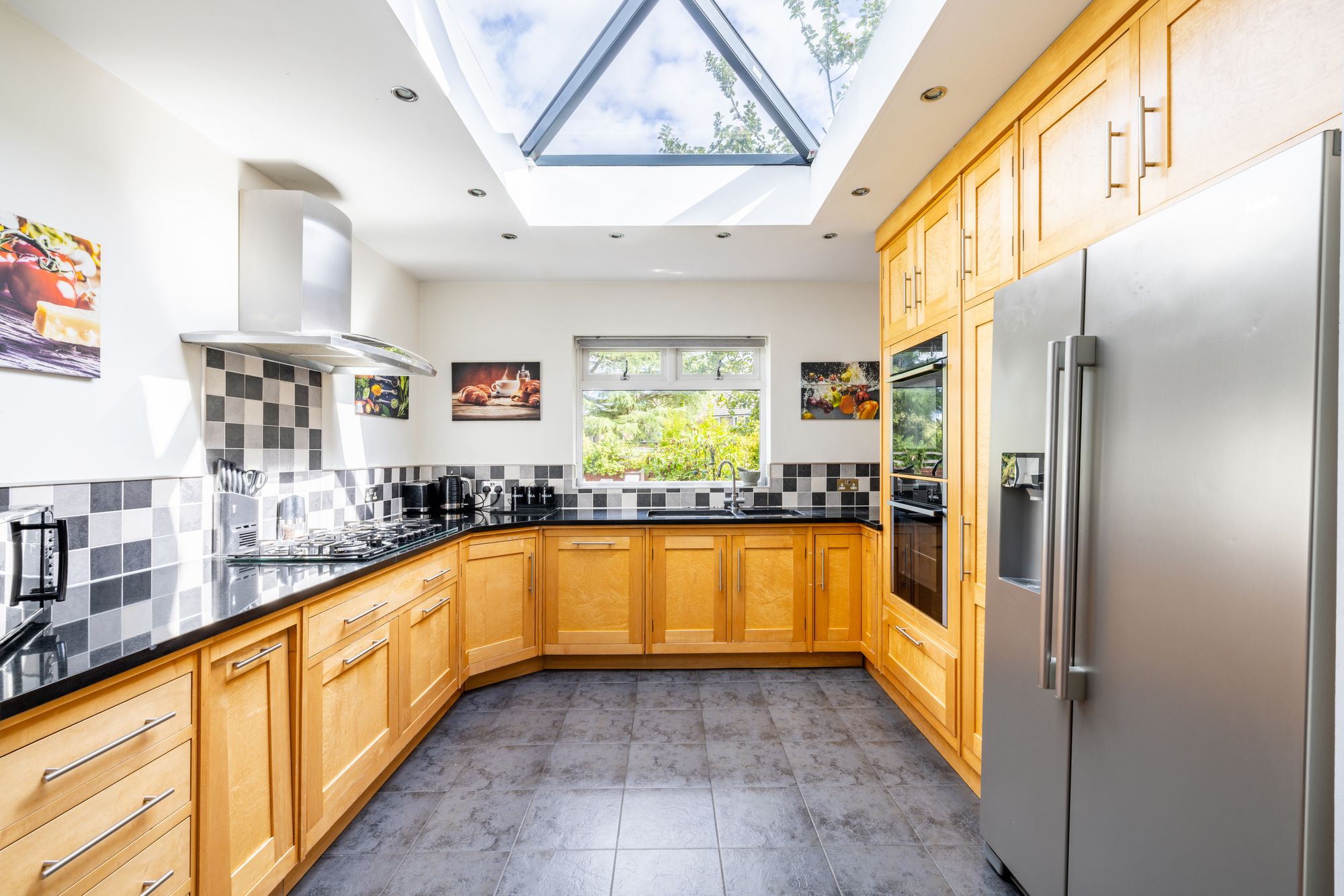 The large front living room exudes warmth, enhanced by the charming electric fireplace feature, providing a cosy ambience for relaxing evenings. Connecting seamlessly is the open plan kitchen/diner, featuring a stylish shaker-style kitchen equipped with integrated appliances and boasting a stunning skylight that bathes the space in natural light.