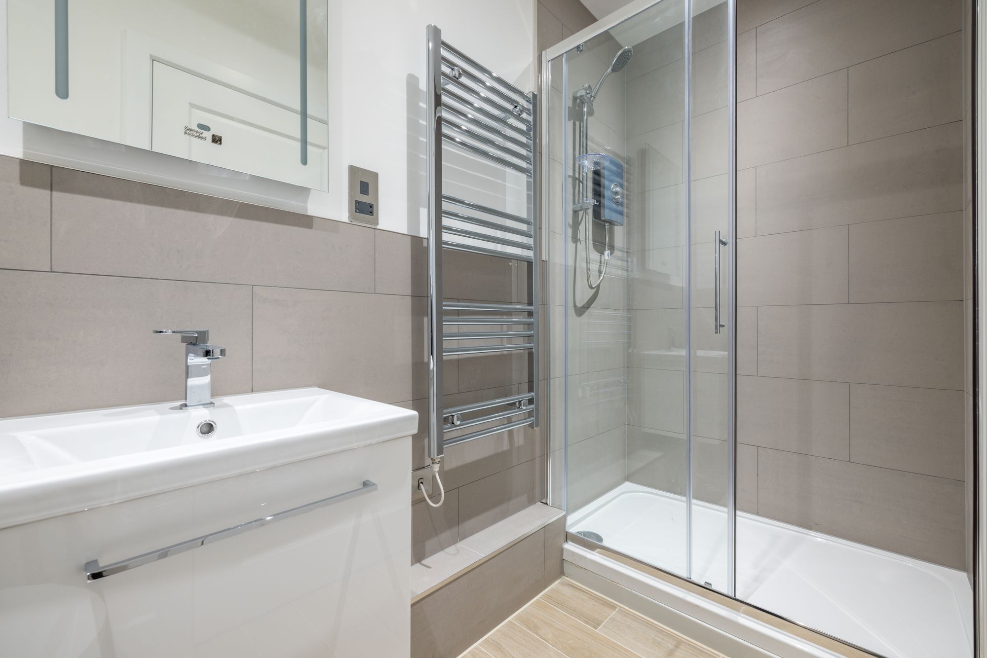 Upon entering the apartment, you’ll be greeted by an entrance hallway with a storage cupboard, ideal for stowing away coats and shoes. The open plan kitchen, dining and living room is bright and airy, thanks to the dual windows that flood the space with natural light. The modern fitted kitchen serves as a sleek backdrop to your living space. The bathroom boasts a contemporary design, featuring white sanitary ware, including a WC, shower, and sink unit. Lastly, the double bedroom is decorated in neutral tones, providing a comfortable and relaxing space.