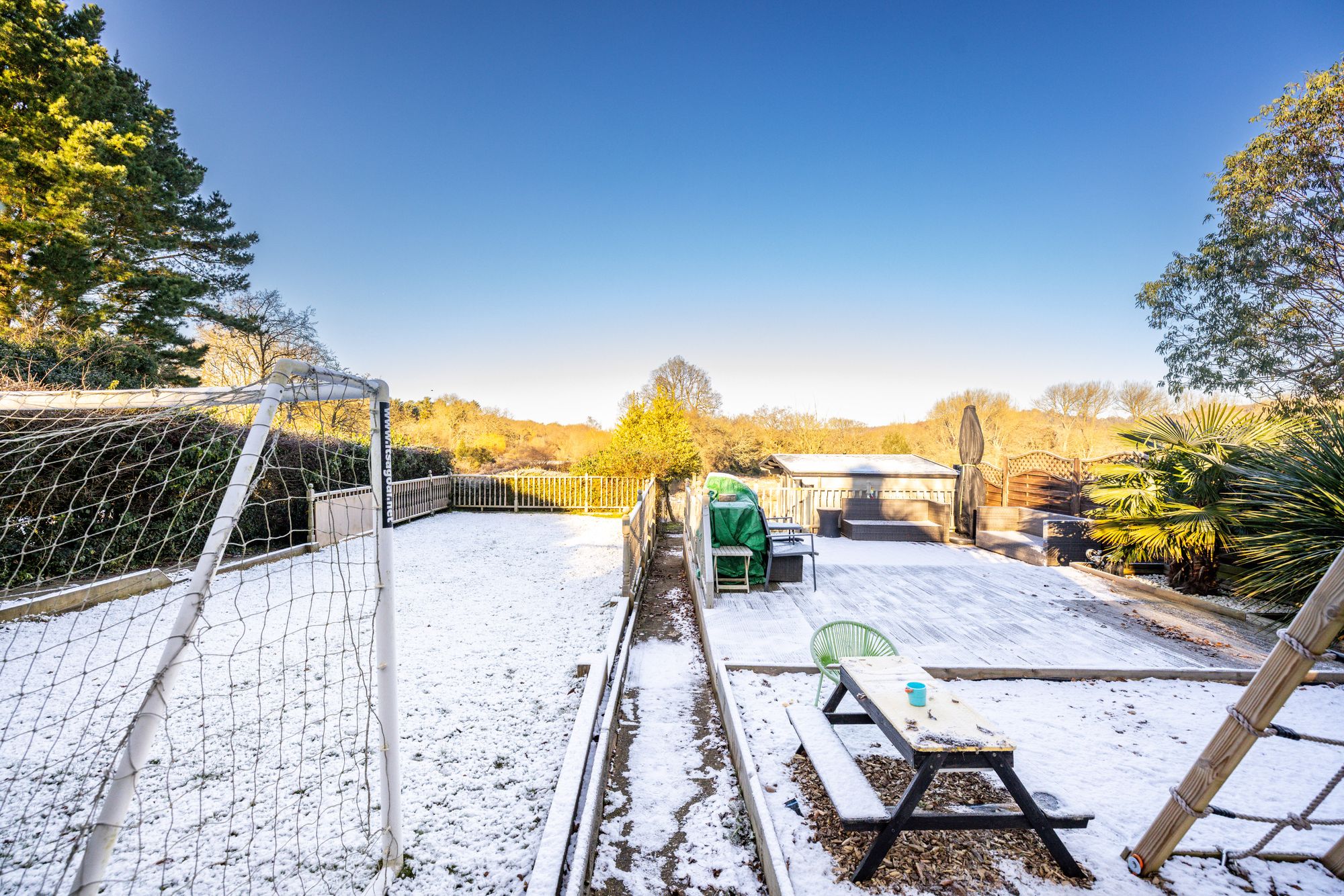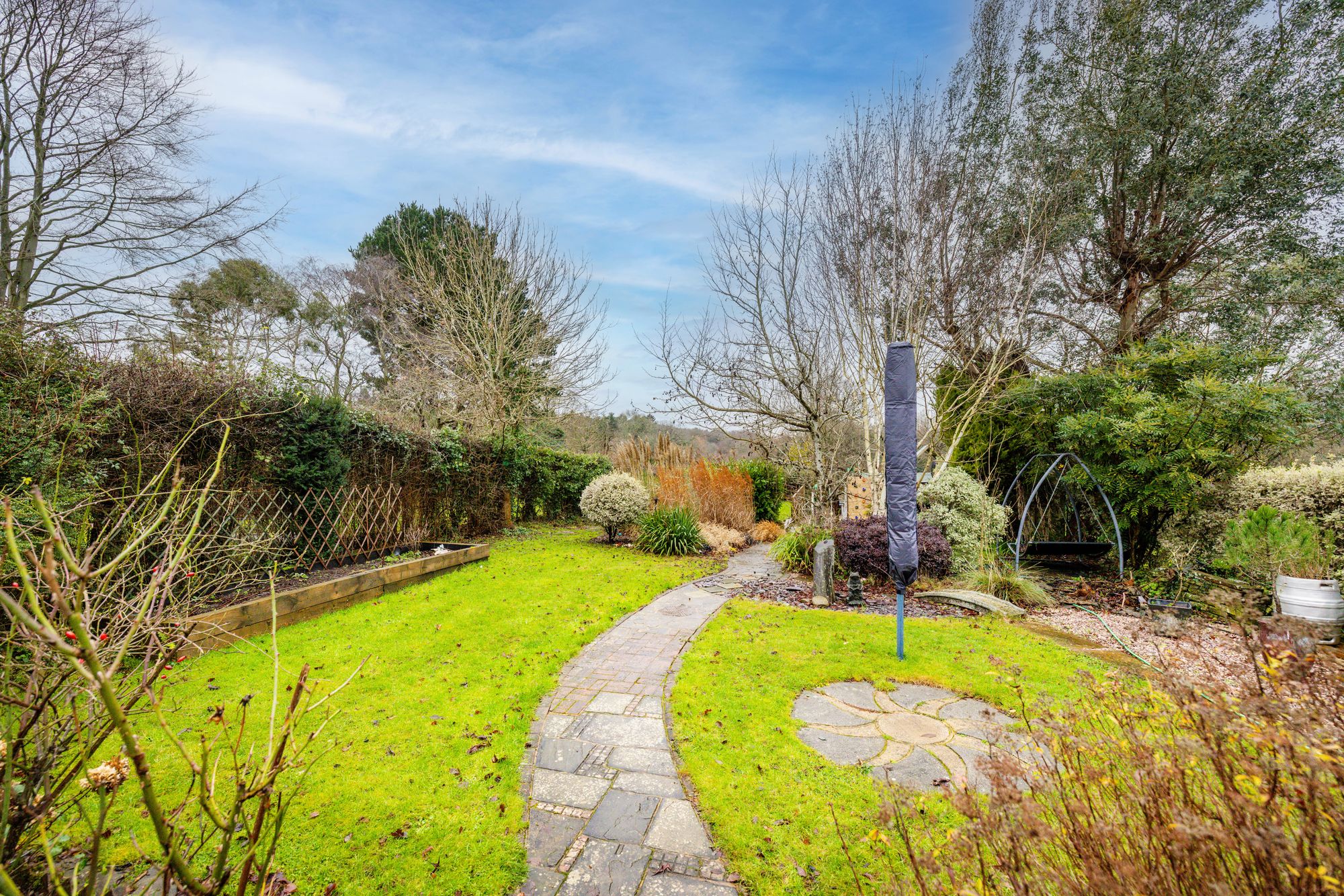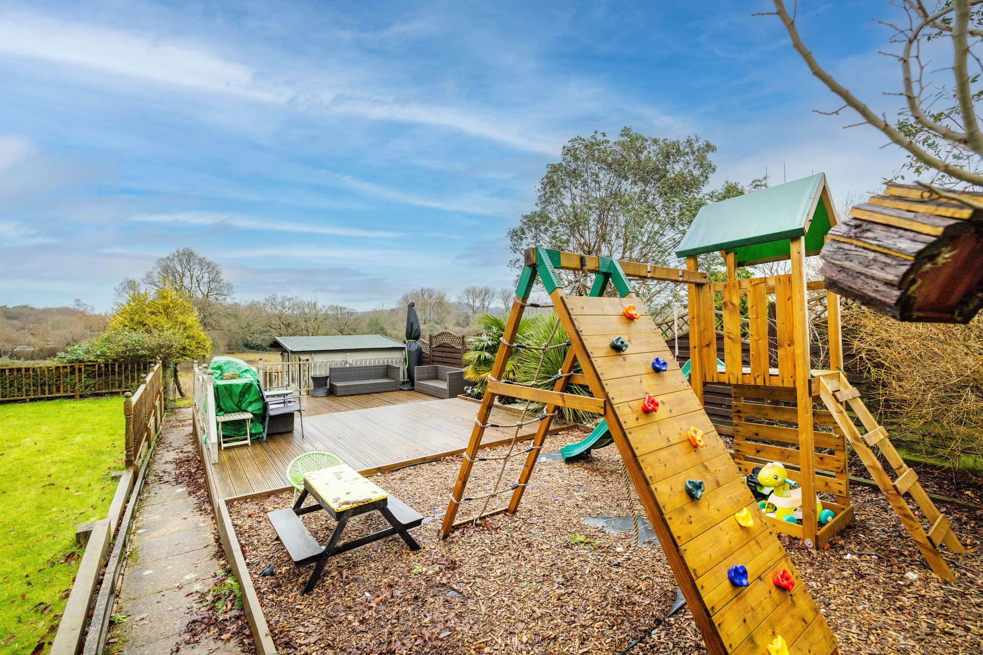 Externally, the stunning garden is a standout feature, offering open field views and arranged across three level sections. The first section has a mature feel with planters, unique pathways, and character features. The second provides a perfect family space with a children’s play area, decking for outdoor dining, an outhouse currently used as a bar, and a large lawn. The final section enjoys uninterrupted countryside views, complete with a seating area and fire pit, ideal for relaxing and entertaining.