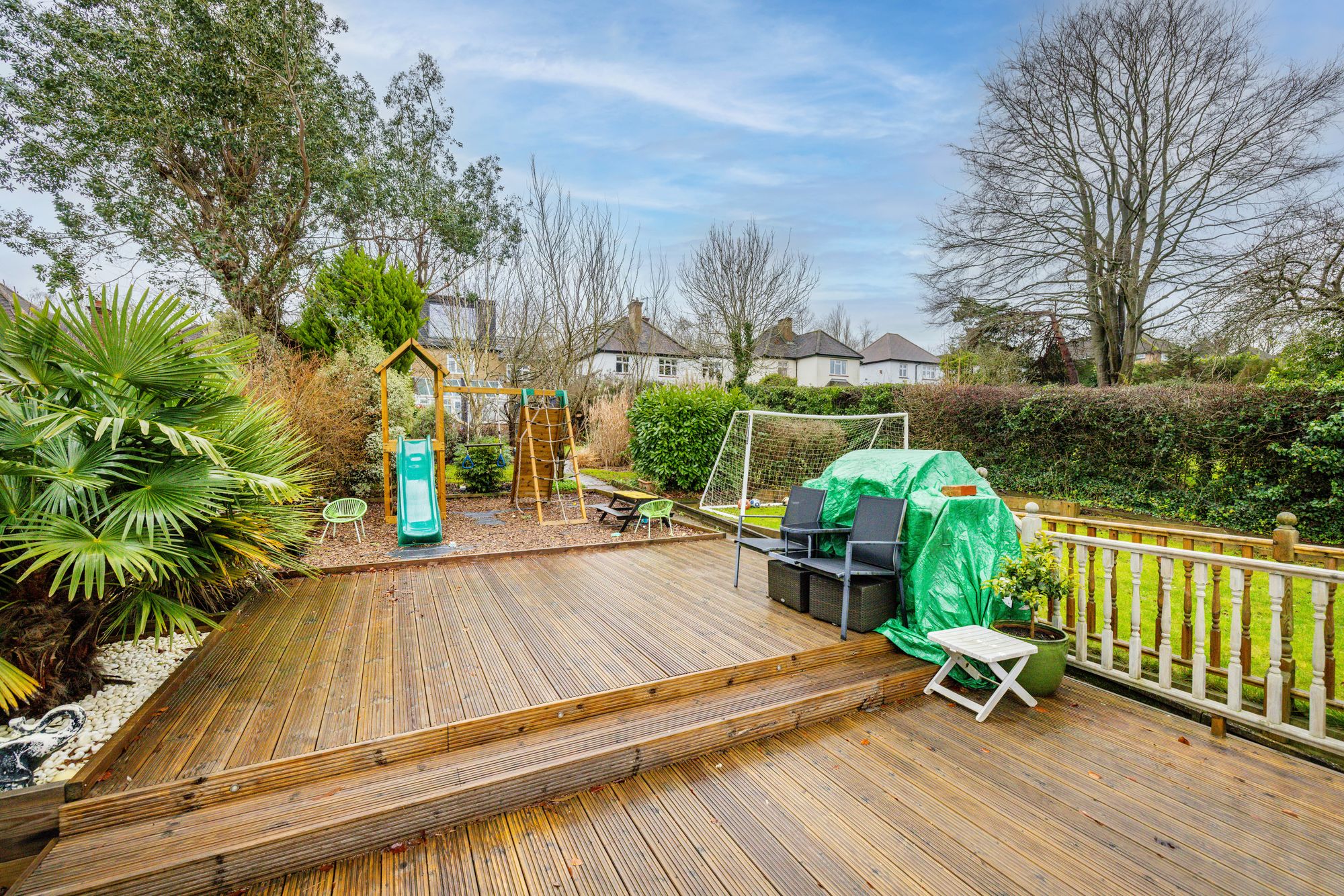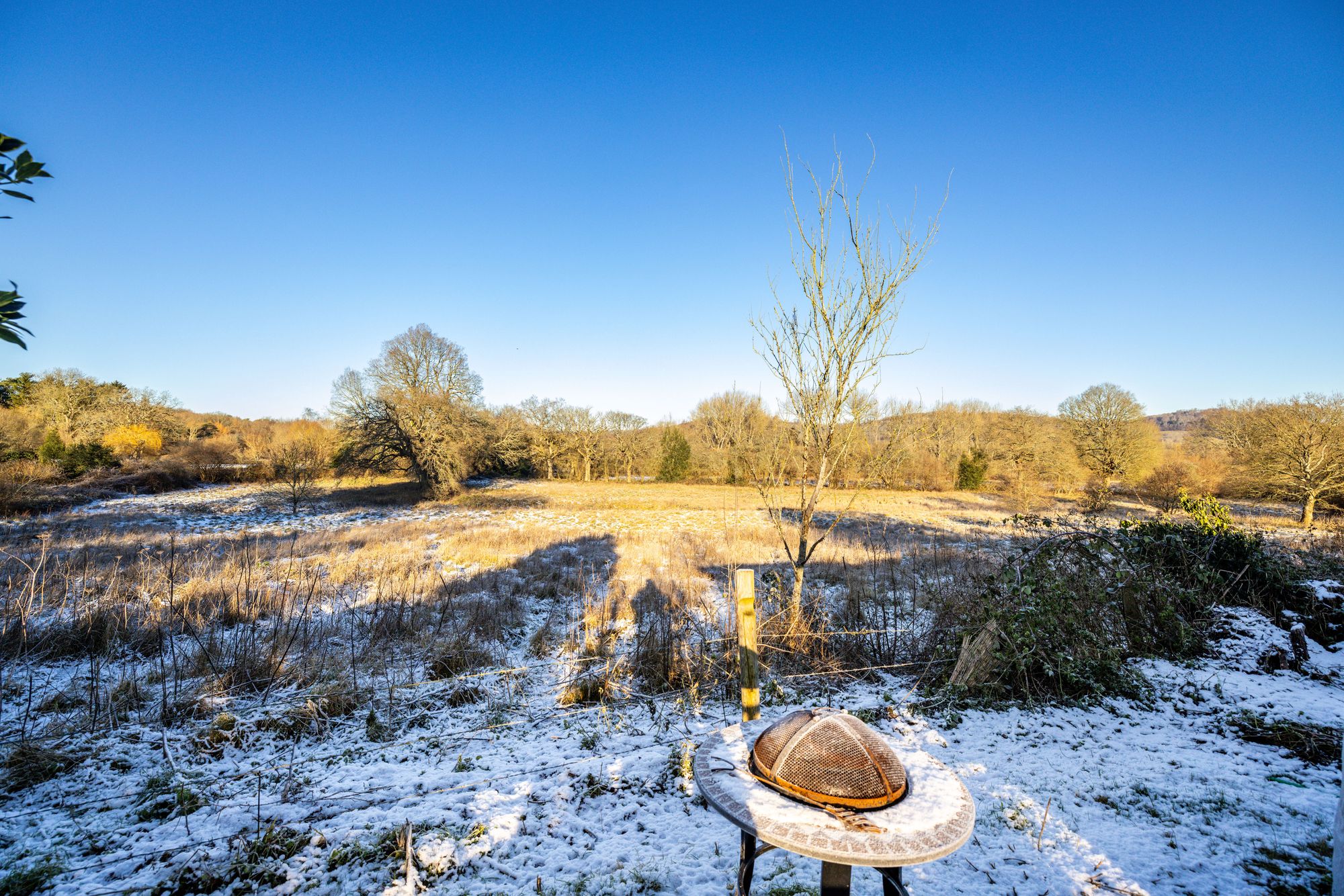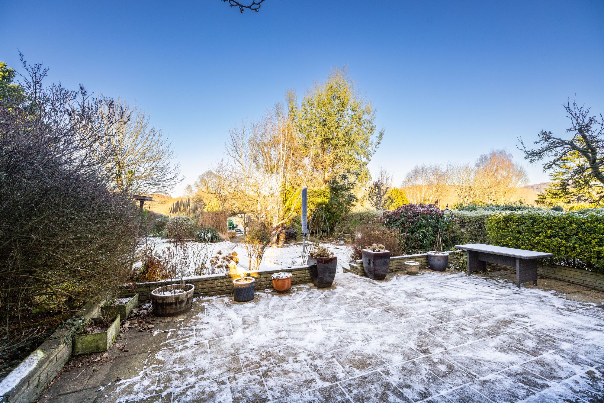 Externally, the stunning garden is a standout feature, offering open field views and arranged across three level sections. The first section has a mature feel with planters, unique pathways, and character features. The second provides a perfect family space with a children’s play area, decking for outdoor dining, an outhouse currently used as a bar, and a large lawn. The final section enjoys uninterrupted countryside views, complete with a seating area and fire pit, ideal for relaxing and entertaining.