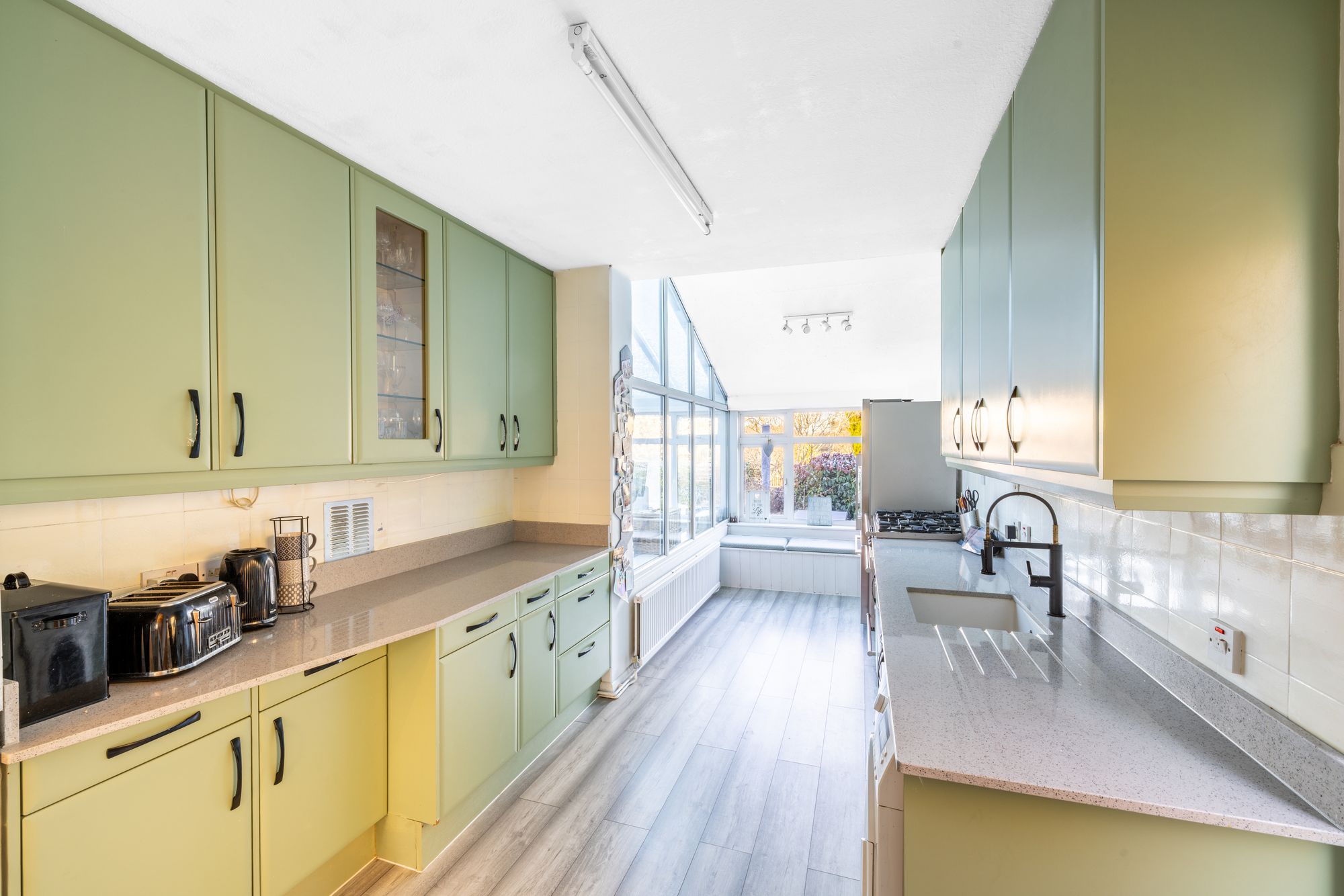 The kitchen is well appointed with quartz worktops and a combination of freestanding appliances, complemented by a separate utility room for added practicality.