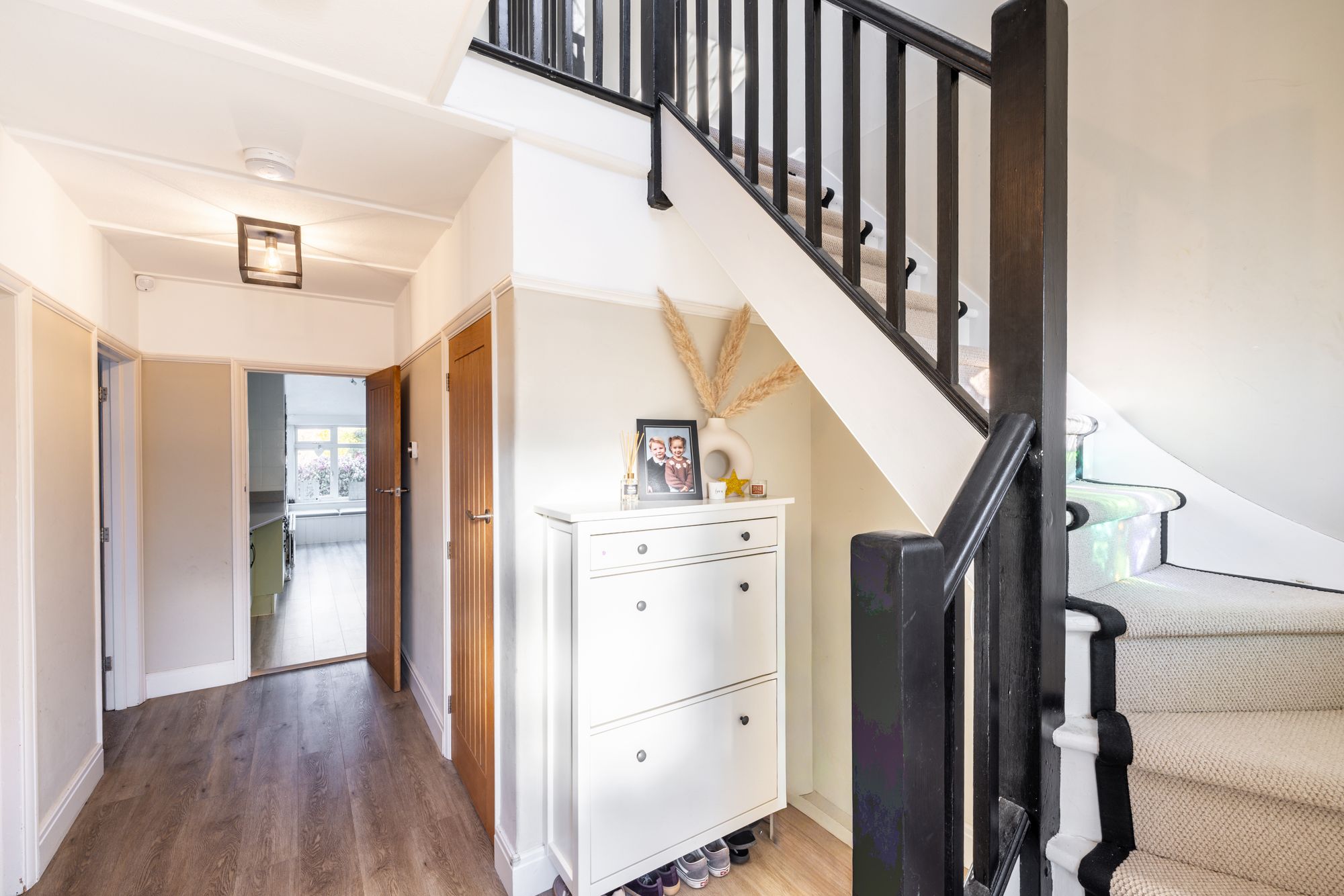 The welcoming entrance hall provides space for coats and shoes and leads to a convenient ground-floor W/C. To the front of the house is a sizeable family living room, enhanced by a bay window that fills the space with light. A separate dining room features a charming fireplace and sliding doors opening into the conservatory/playroom, creating a wonderful flow for entertaining and family life. The conservatory benefits from French doors leading directly onto the garden patio.