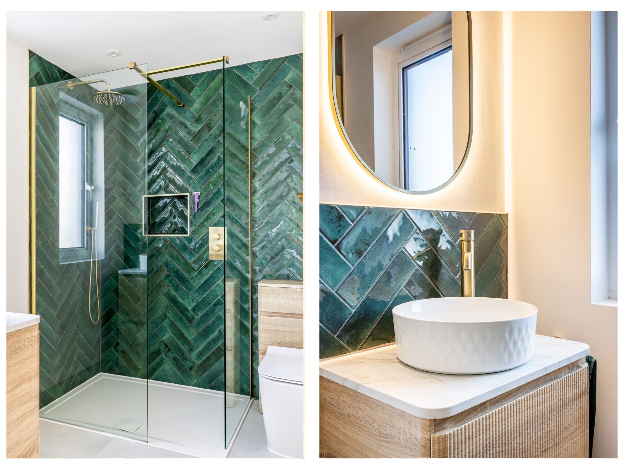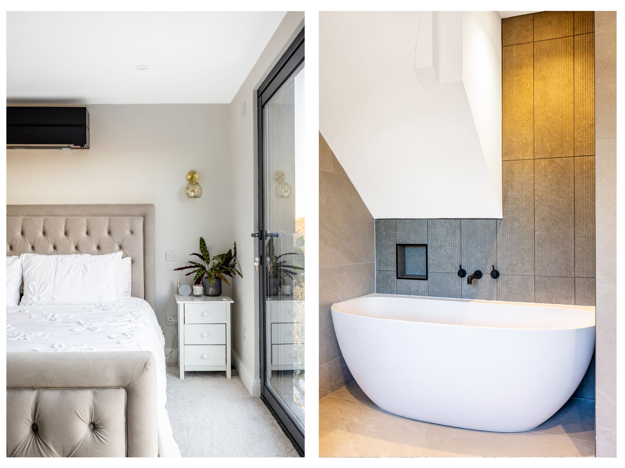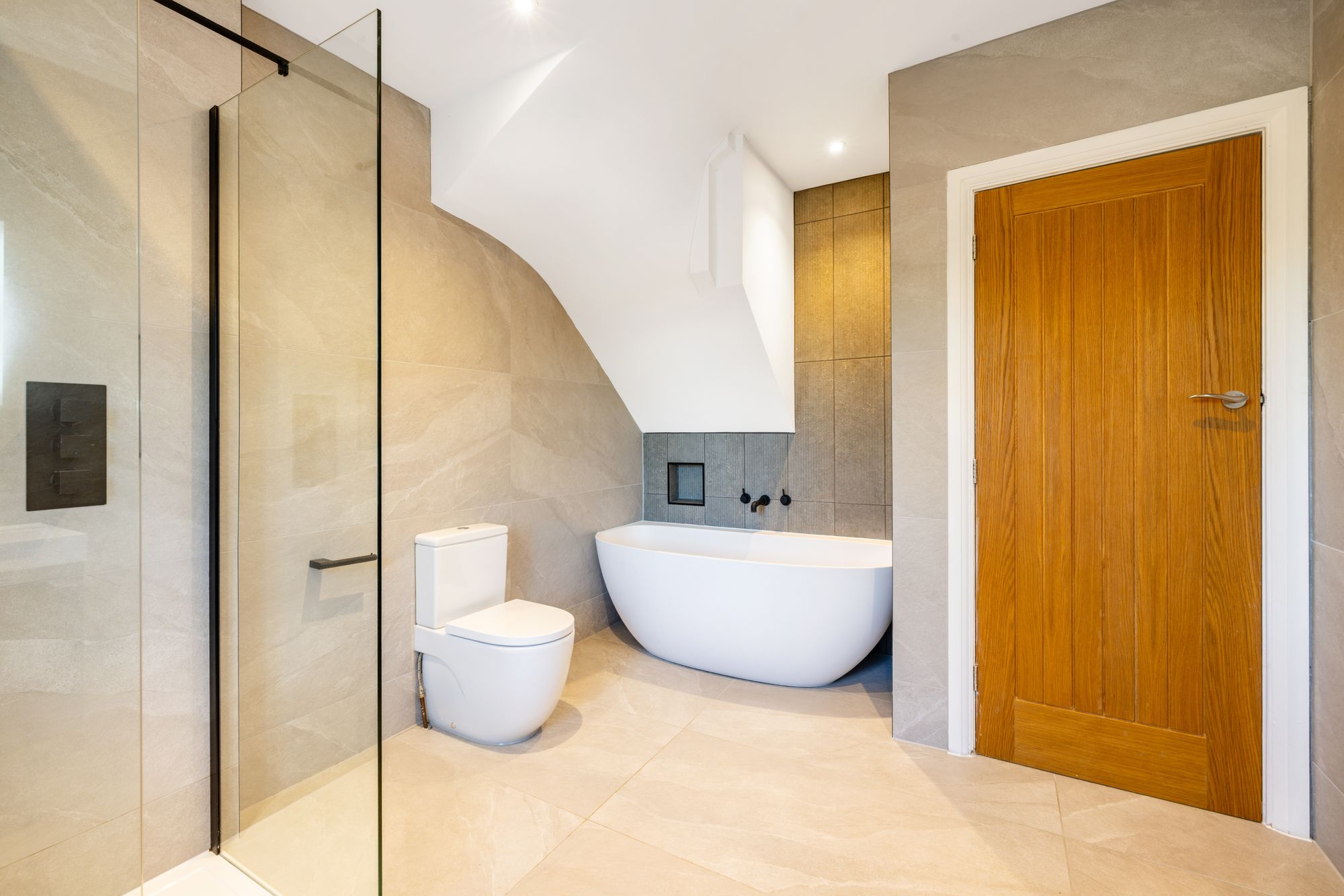 On the first floor, there are three double bedrooms, all well-proportioned. The largest of these benefits from built-in wardrobes, while the remaining two enjoy dual aspects and ample storage. The family bathroom is beautifully finished with floor-to-ceiling tiling, a walk-in shower, and a striking oval double-ended freestanding bath.