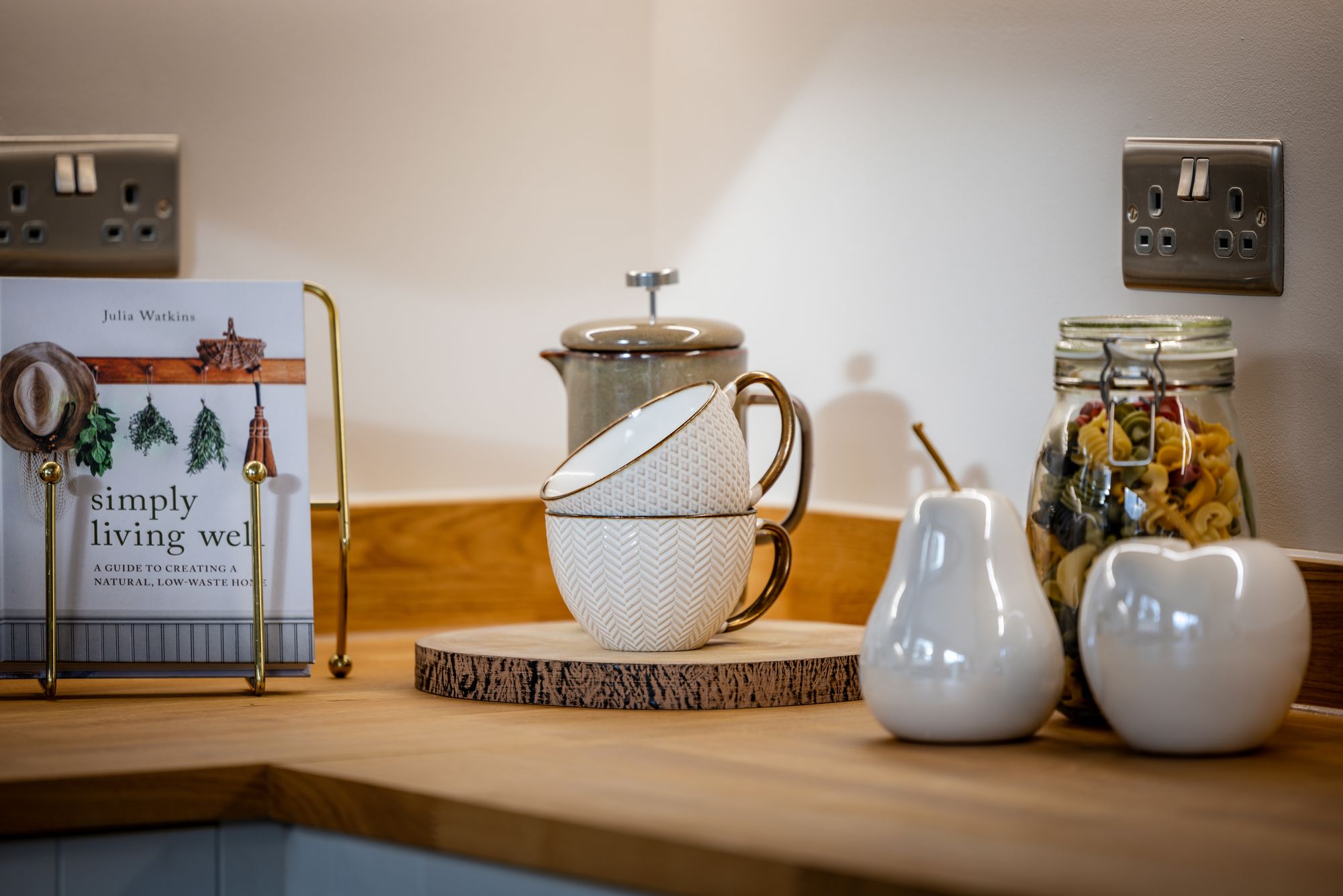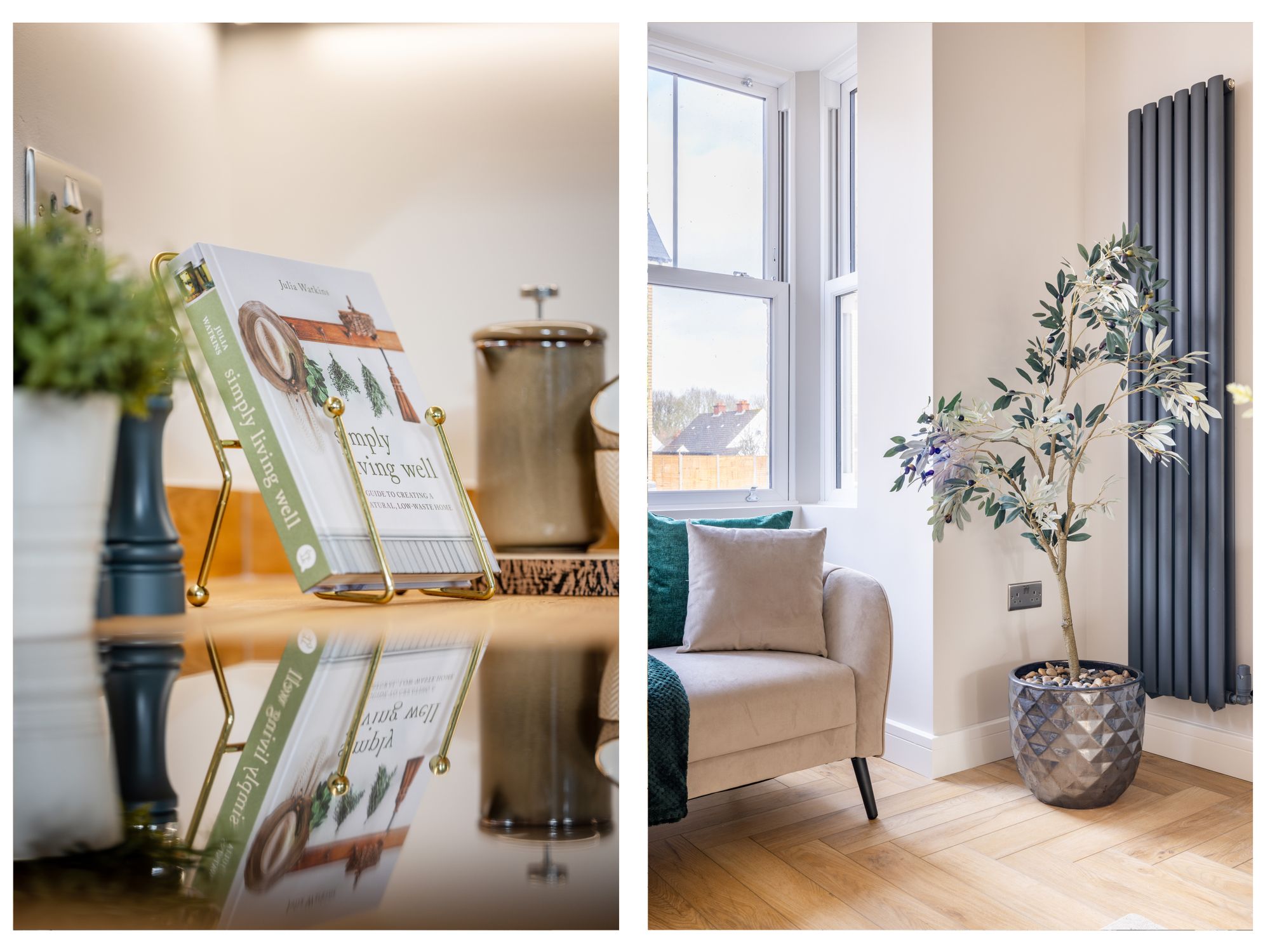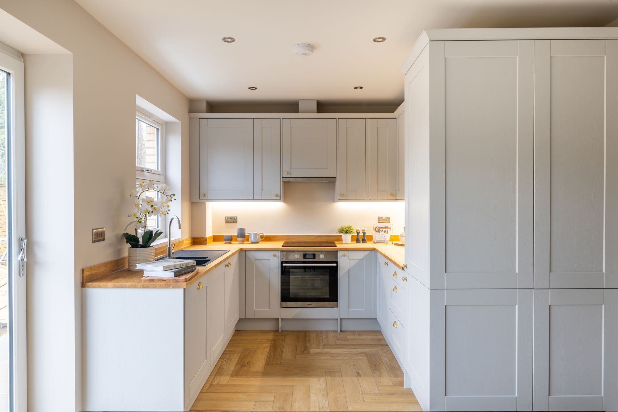 Step inside and you’re welcomed by a bright, inviting hallway laid with elegant LVT herringbone oak flooring that sweeps through the entire ground floor. At the rear of the home sits the showstopping kitchen, designed with contemporary light-grey woodgrain Shaker units and complemented by solid oak worktops, matching upstands and subtle under-cabinet strip lighting. A composite Franke undermounted sink and Reginox tap add a premium touch, alongside a full suite of integrated appliances, including a dishwasher, fridge/freezer, extractor hood, induction hob and multifunction oven.