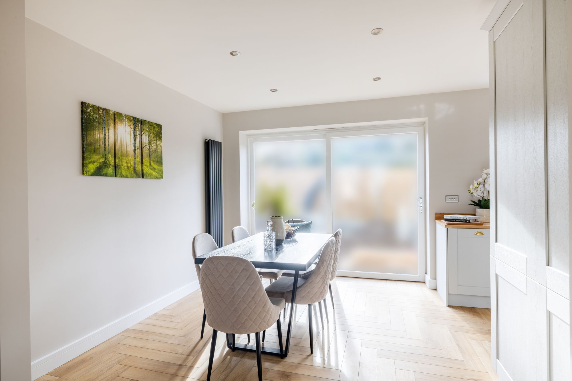 The expansive lounge/diner stretches the full length of the property, bathing the interior in natural light thanks to large sliding doors that open directly onto the private rear garden, perfect for al fresco entertaining, family time or simply enjoying the outdoors. A stylish downstairs WC completes the ground-floor accommodation, ideal for guests.