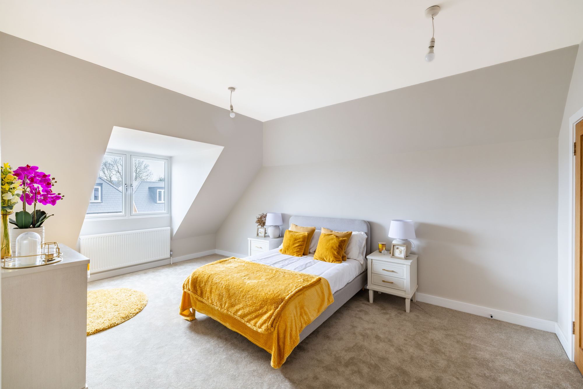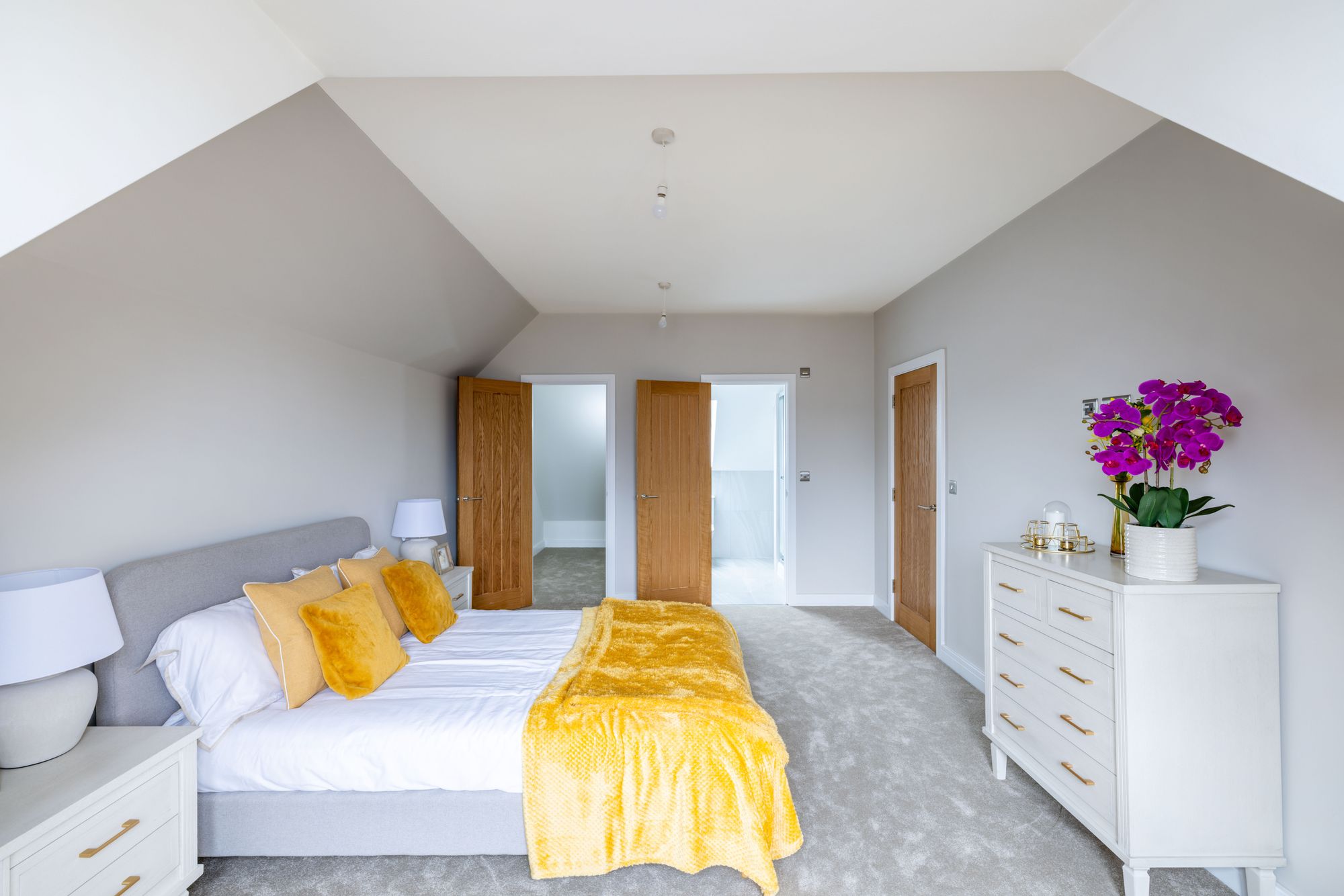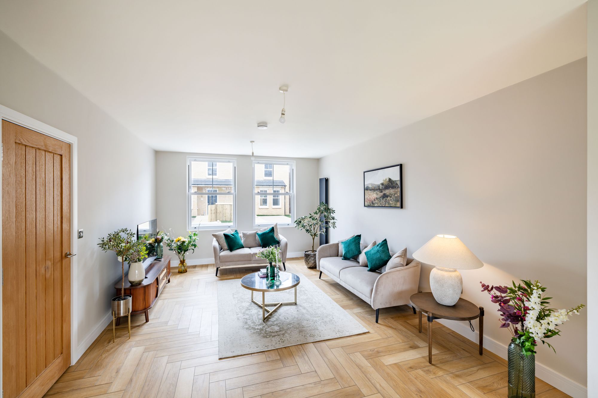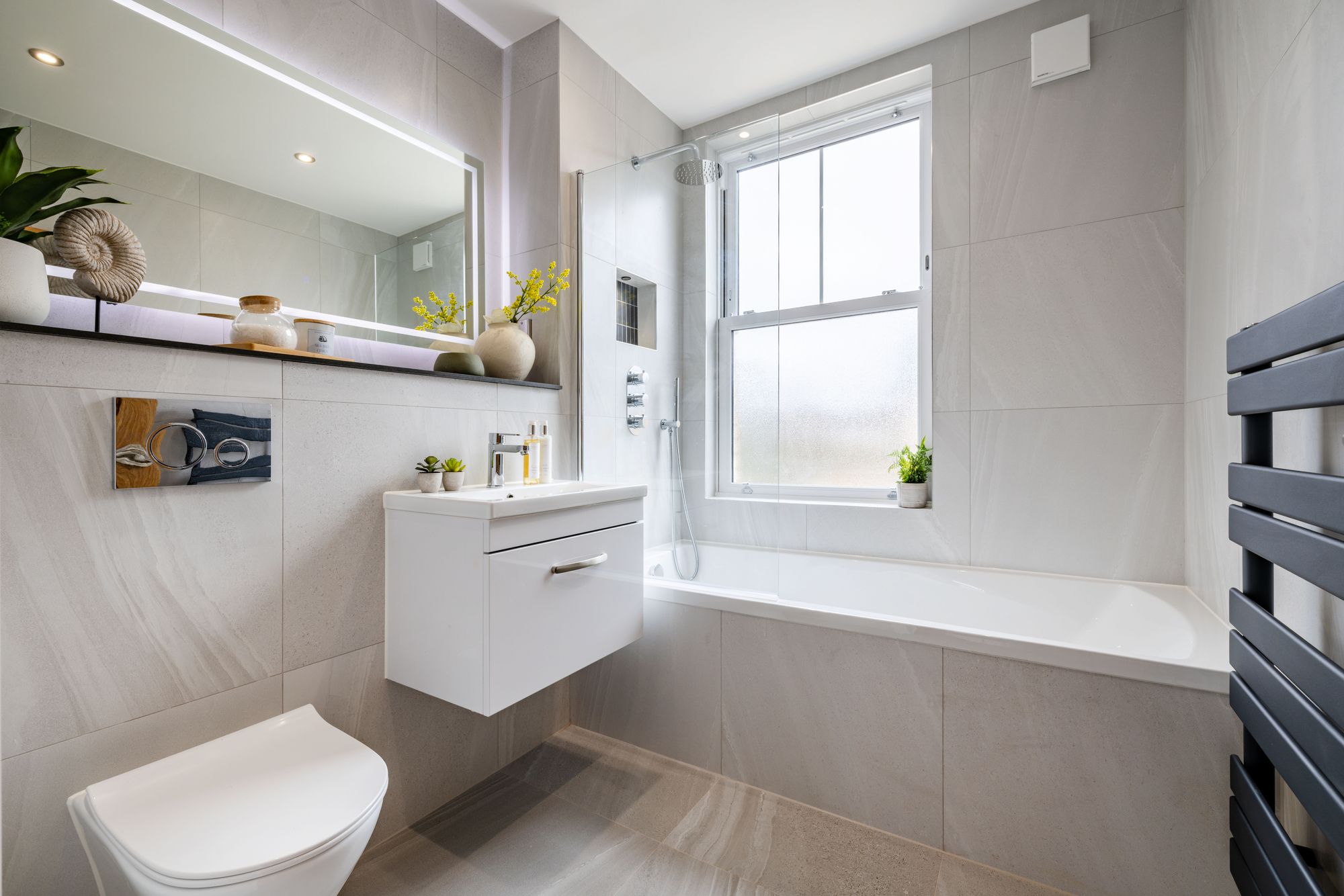 The first and second floors are home to three bedrooms, two bathrooms, additional study and ample storage. All bedrooms have been finished with luxury anti-stain 100% wool carpets. The modern, sleek bathroom suites with white sanitary ware, comprise of a Dunsford bath with chrome bath and shower attachments, a three outlet 2 valve thermostat, and bath screen. There is a wall hung toilet, with a stainless-steel flush plate. A wall hung vanity unit is perfect for hiding away toiletries, a hand wash basin with chrome mixer taps and an LED light mirror above. Immaculately finished with porcelain wall and floor tiles in grey.