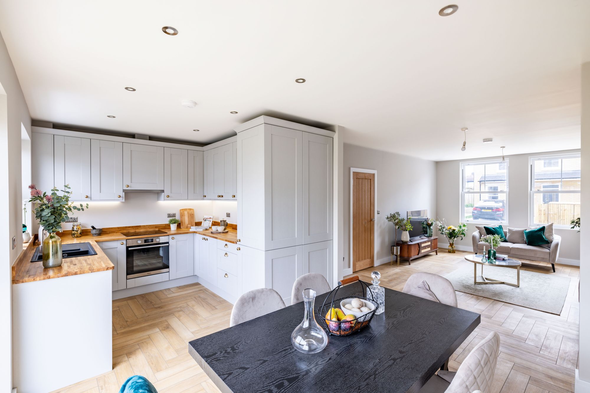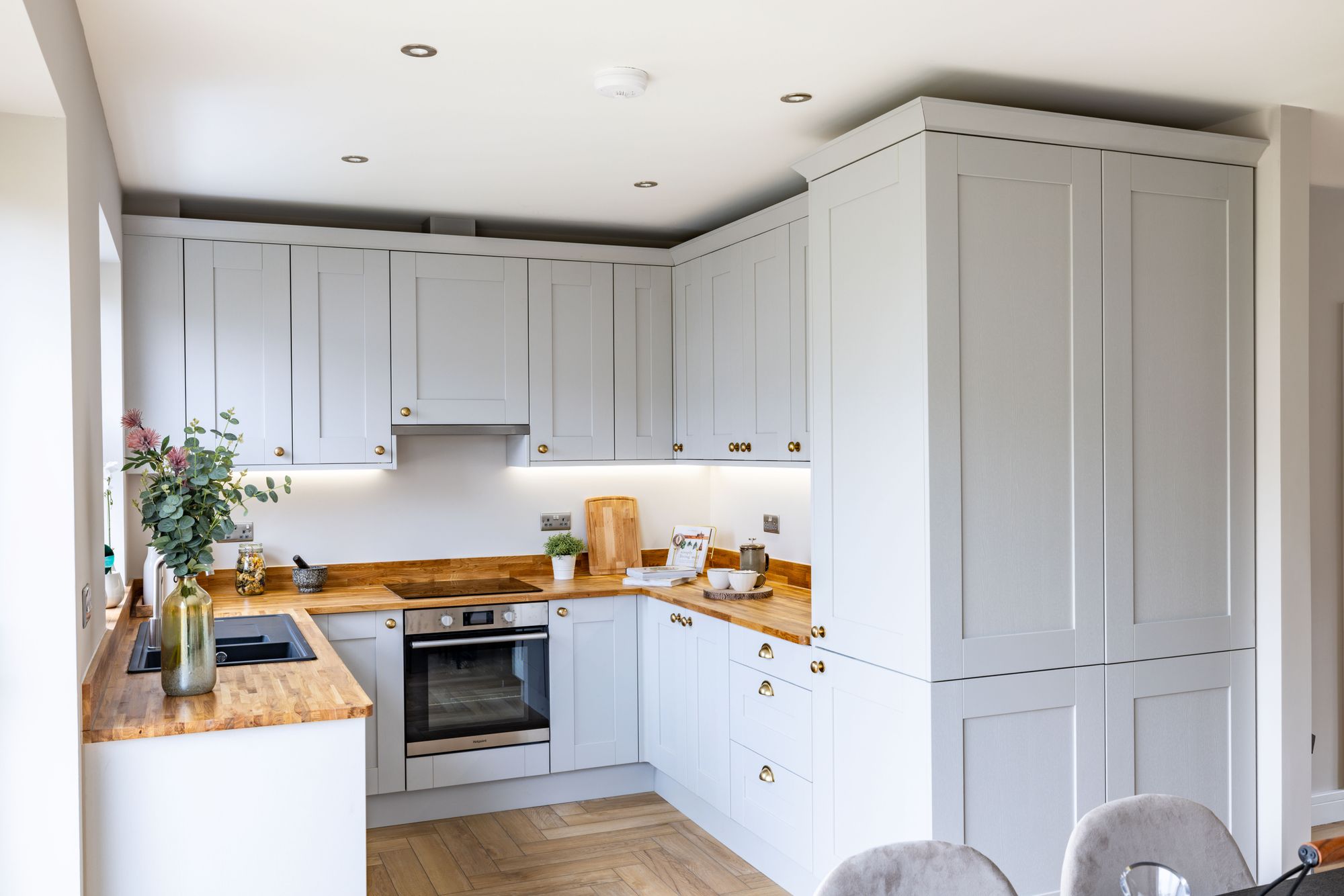 As you walk inside, you are greeted by a welcoming hallway with beautiful LVT herringbone oak flooring, flowing seamlessly throughout the ground floor accommodation. The spacious kitchen, at the rear of the house, has been designed with stunning, contemporary woodgrain light grey Shaker style units. Beautifully paired with solid oak worktops, upstands and finished with strip lighting under the wall units. A composite Franke undermounted sink with a Reginox tap. A range of integrated Hoover and Hotpoint appliances have been fitted including a dishwasher, fridge/freezer, extractor hood, electric induction hob and a multi-function oven. A gorgeous open plan lounge/diner runs the full length of the property is flooded by light via the sliding doors which lead you out to the rear garden, a wonderful addition to your entertaining space or somewhere for children to run around. Further to the downstairs accommodation is a WC, perfect for guest use.