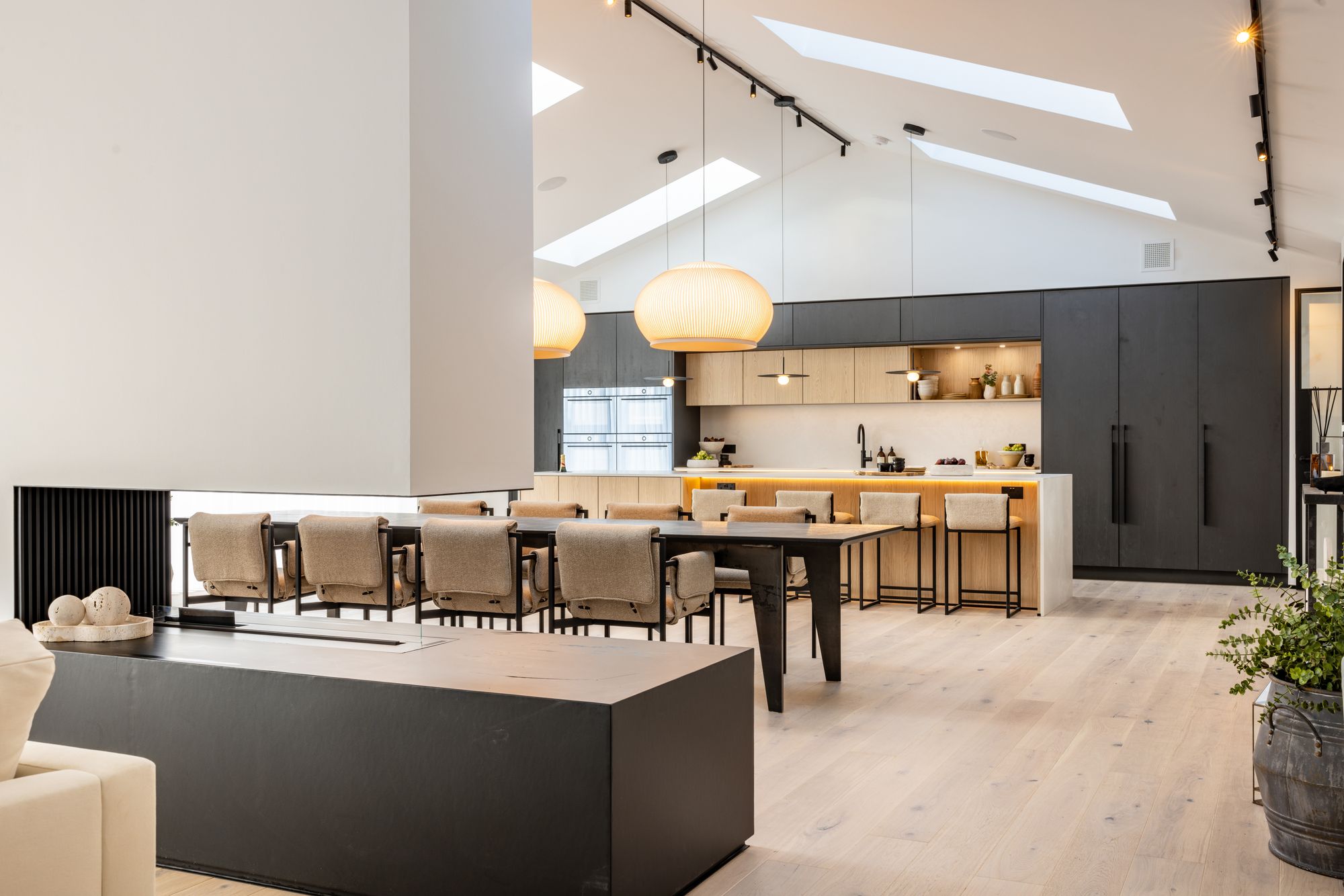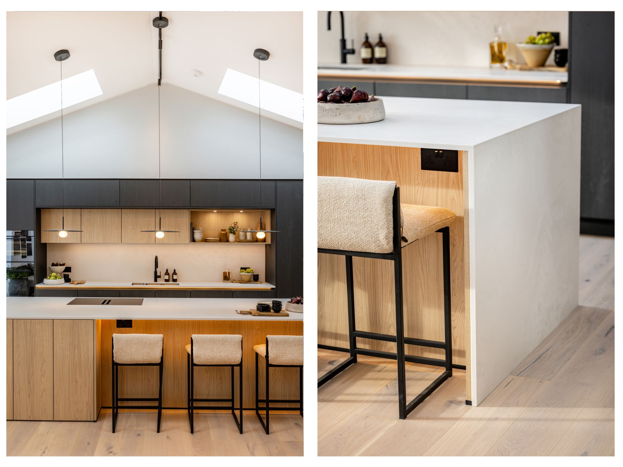 A bespoke kitchen designed by Ornate Kitchens, featuring elegant Caesarstone mineral work surfaces and integrated VZUG appliances. The central island creates the perfect hub for cooking and socialising, while swing doors open out to the garden, blending indoor and outdoor living.