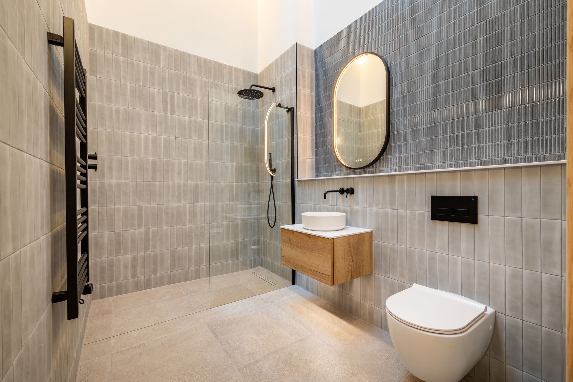 A stylish and modern bathroom designed with comfort and practicality in mind, serving the family bedrooms.