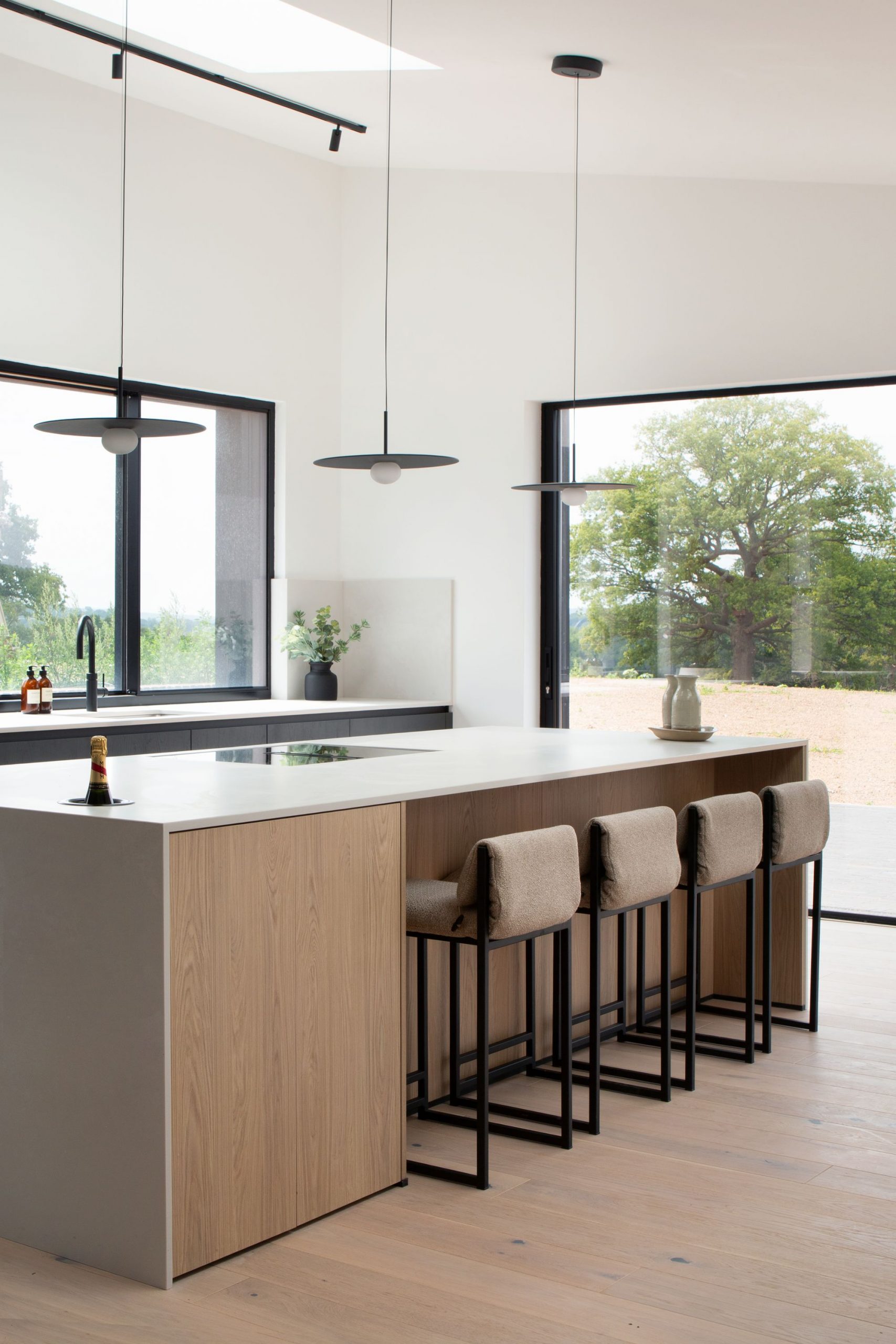 The heart of the home, this bespoke kitchen by Ornate Kitchens showcases sleek Caesarstone mineral work surfaces paired with premium VZUG integrated appliances. A central island offers the perfect spot for casual dining and entertaining, while two sliding doors open out onto a spacious courtyard, blurring the lines between indoor comfort and outdoor relaxation.