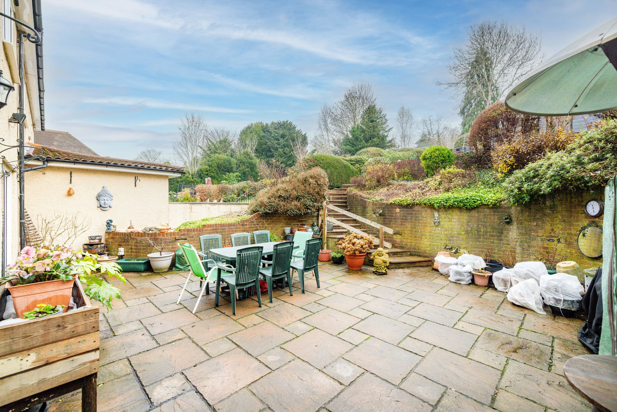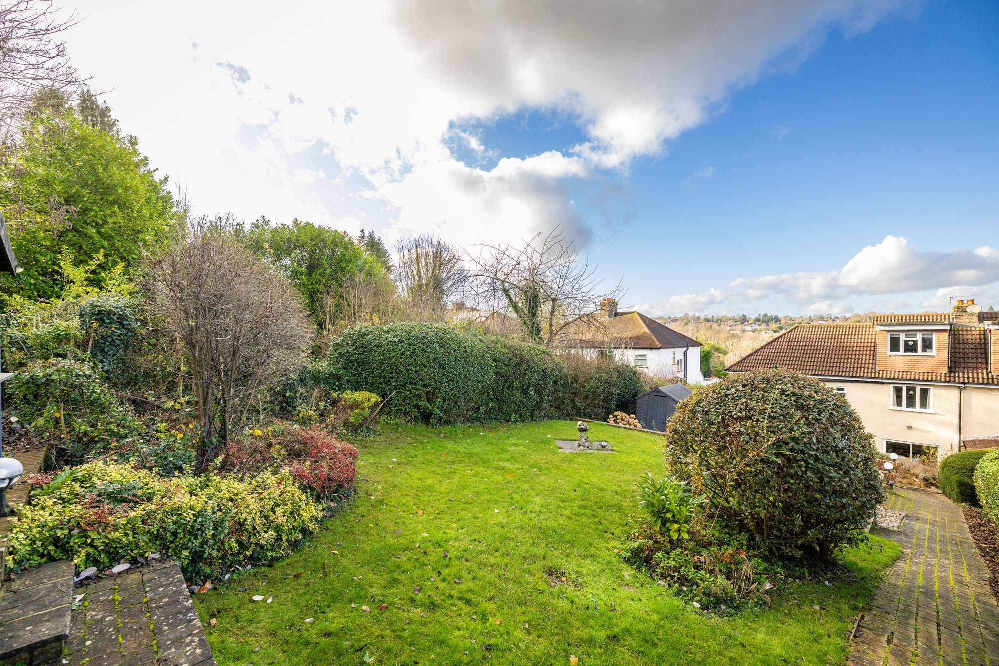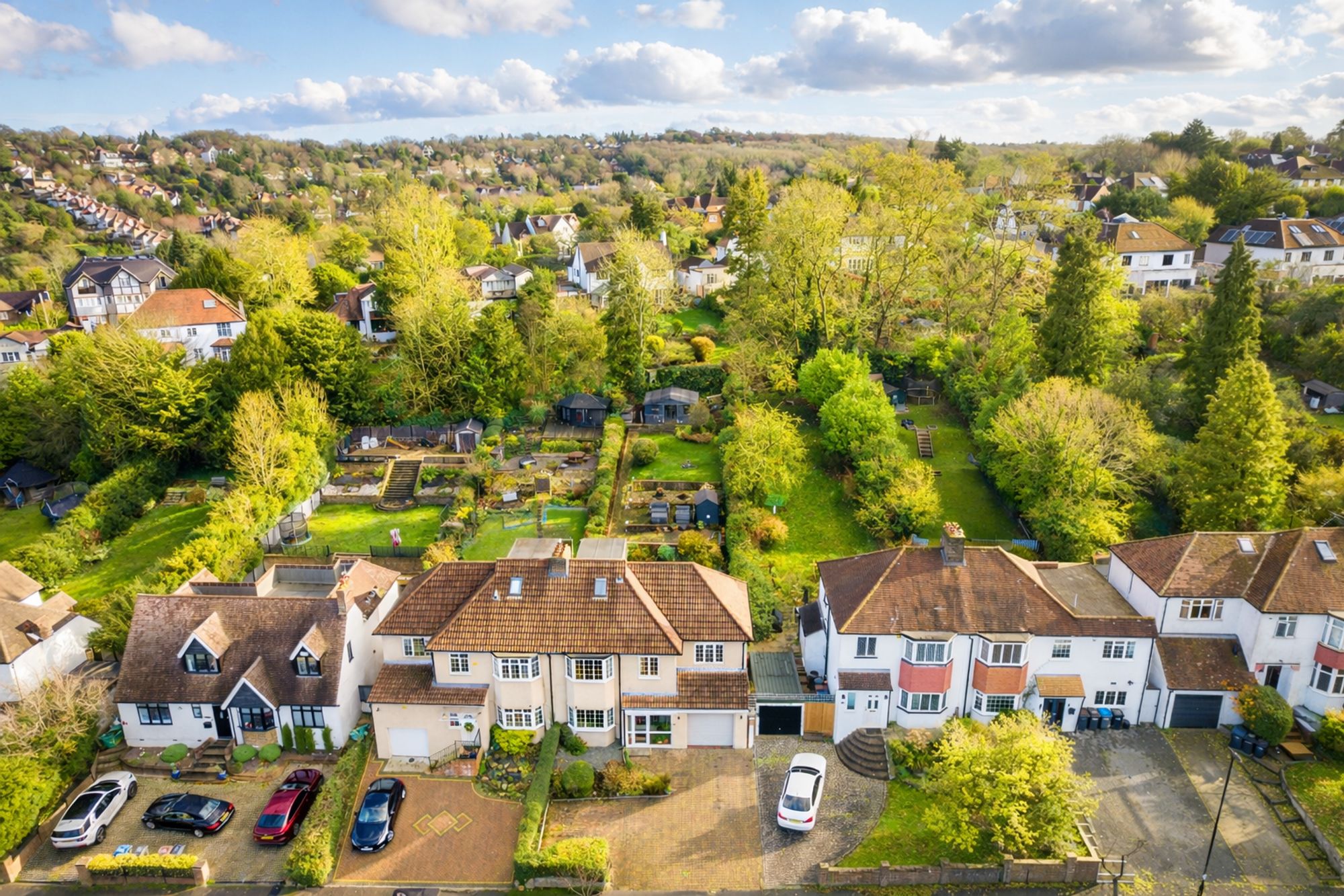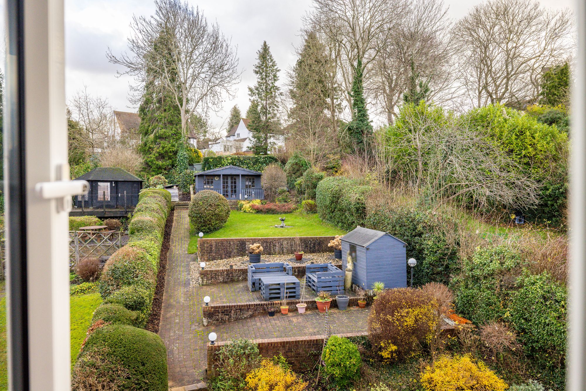 Outside, the landscaped rear garden is arranged over tiered levels, offering both patio and grassed areas, perfect for families, play, relaxation and outdoor entertaining. The garden enjoys sunlight throughout the day, allowing you to “chase the sun” from one area to another. At the end of the garden sits a delightful summer house with power, providing an ideal space for a home office, studio, or additional entertaining area.