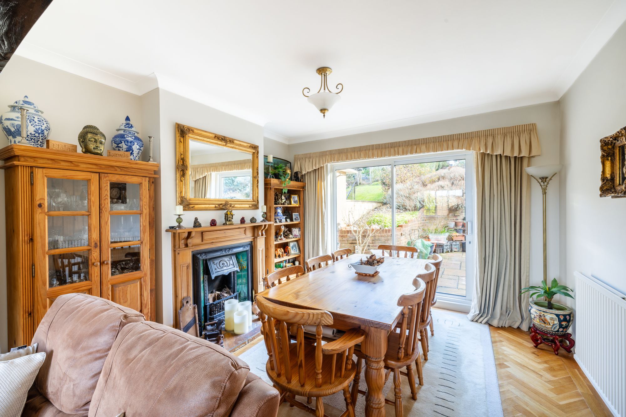 The impressive open-plan living and dining room is a standout feature, boasting a striking bay window an original 1920s fireplace that adds warmth and character and built in surround sound speakers. The large kitchen offers ample worktop space, plentiful storage, a double and single oven and dining area. From here, there is direct access to the garage, which includes a useful utility area with sink, wall units and space for a washing machine, tumble dryer and freezer.
