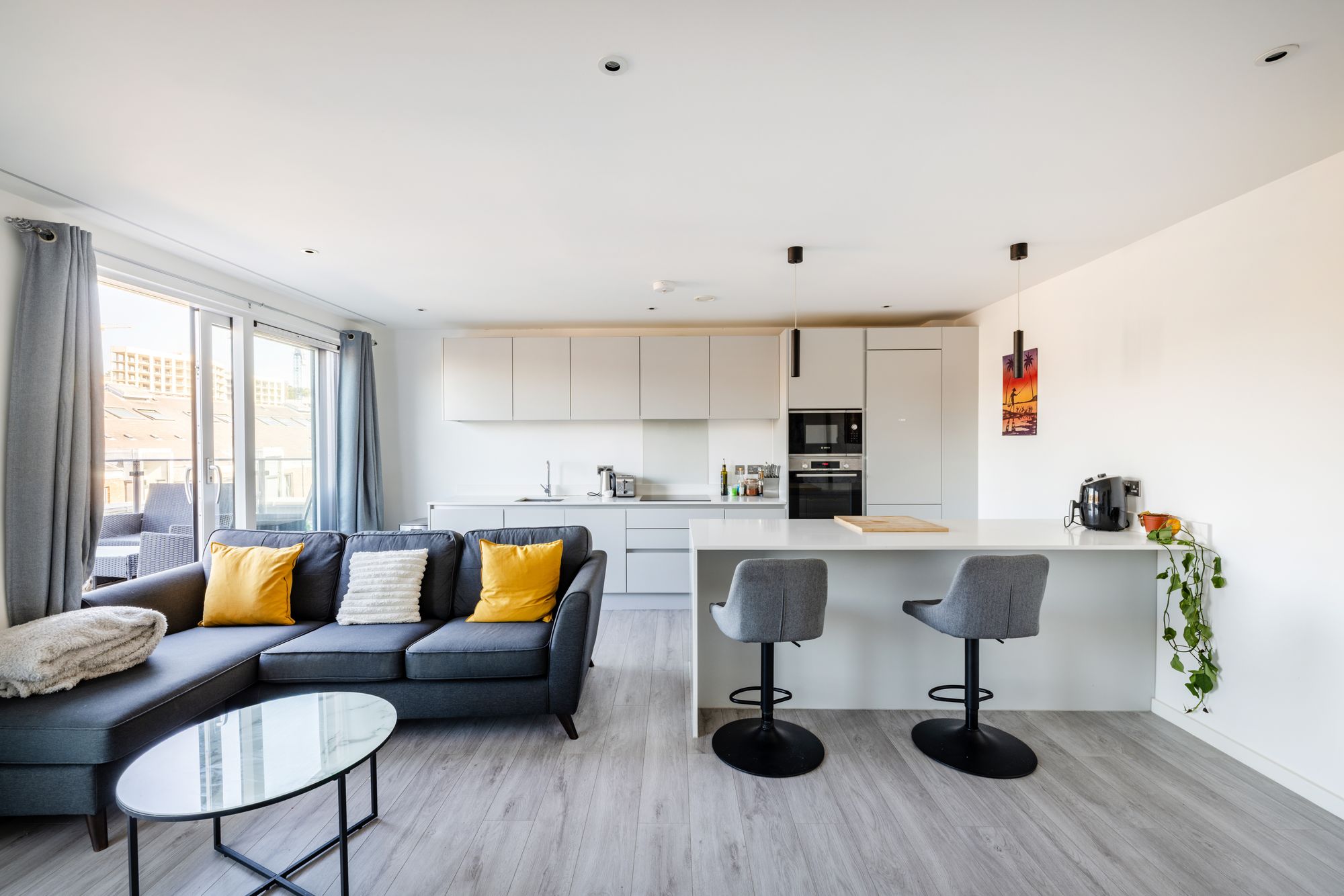 Situated on the third floor and accessed via a secure communal entrance, the property’s accommodation briefly comprises entrance hall, contemporary family bathroom, open-plan kitchen reception room perfect for hosting benefits from a fully fitted kitchen, high quality worktops and direct access to the private balcony. The reception room provides space for both living and dining. The bedroom itself is spacious with an area for large wardrobes and benefits from an abundance of natural light.