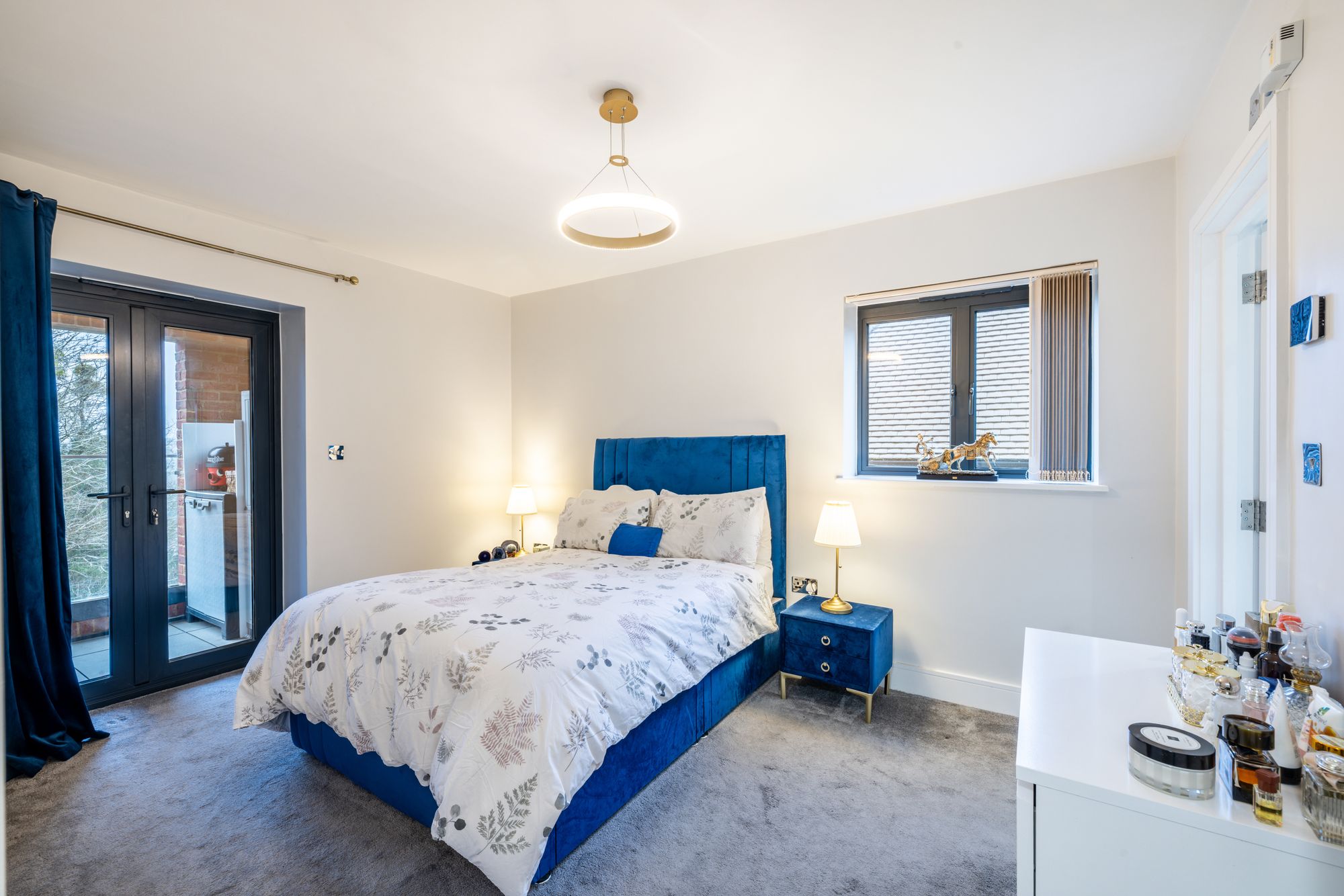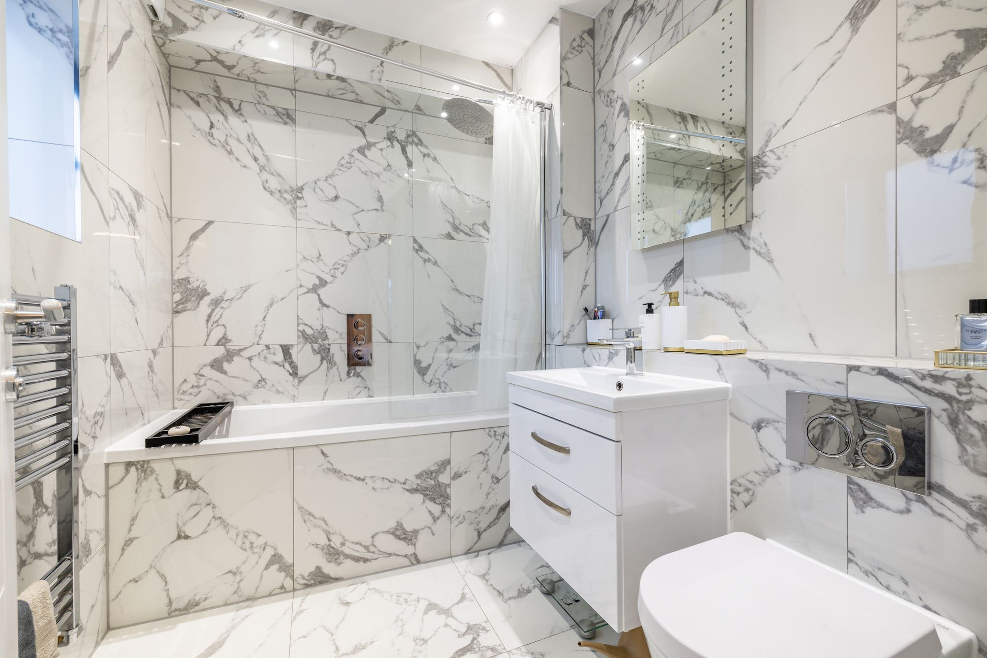 There are three generous double bedrooms, including a spacious principal bedroom which benefits from a stylish en-suite bathroom and direct access to a second balcony located at the rear of the apartment. The remaining bedrooms are served by a modern family bathroom. Both bathrooms are finished to a high standard with elegant marble effect tiling throughout.