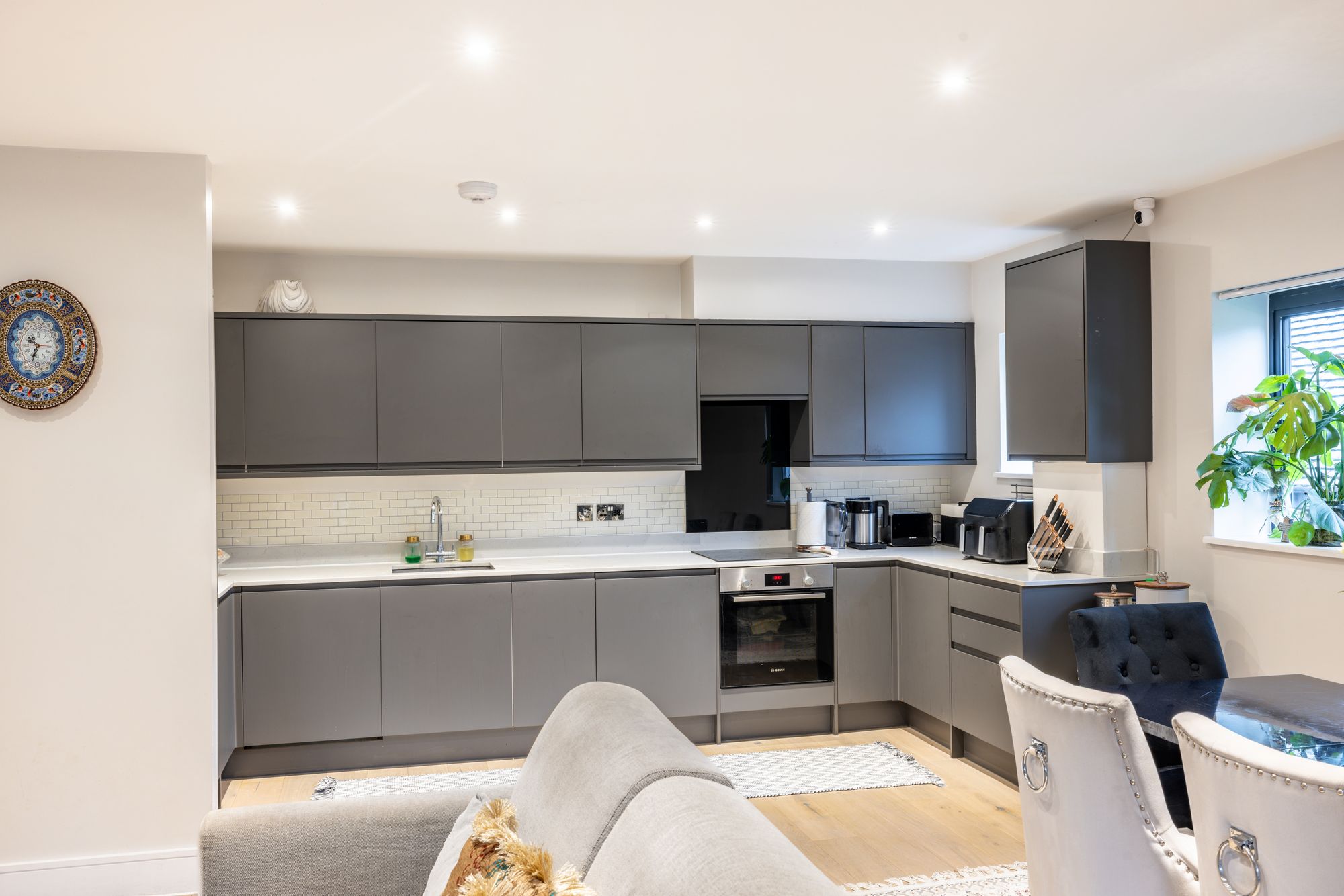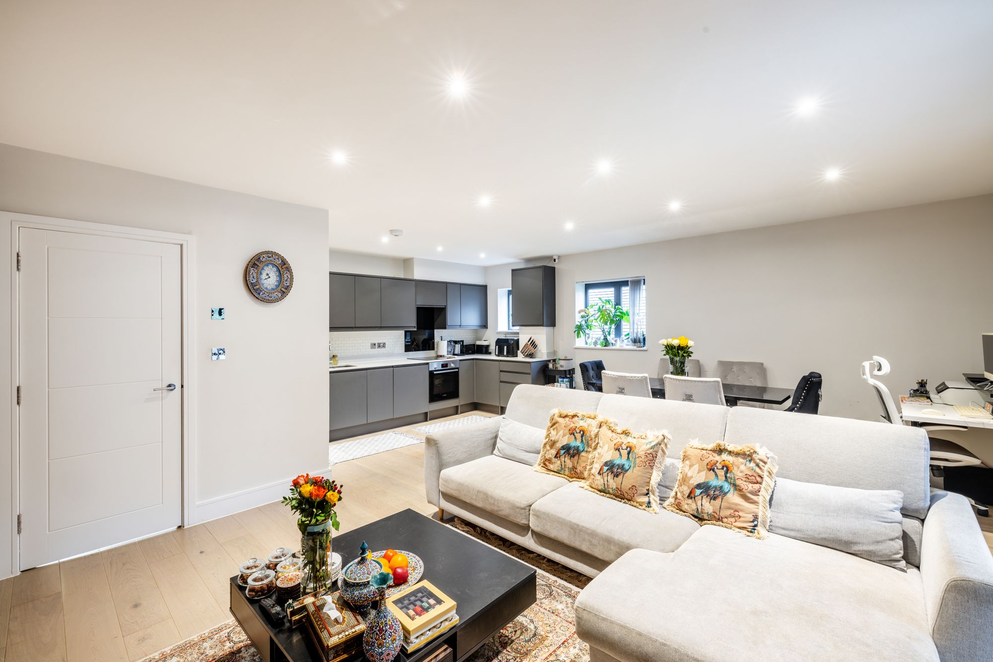 The apartment is accessed via a long, welcoming hallway which leads into an impressive open-plan kitchen, living and dining area. This bright and spacious room is ideal for both everyday living and entertaining, featuring fully integrated appliances, sleek quartz work surfaces, and French doors that open onto a large, covered balcony at the front of the property.