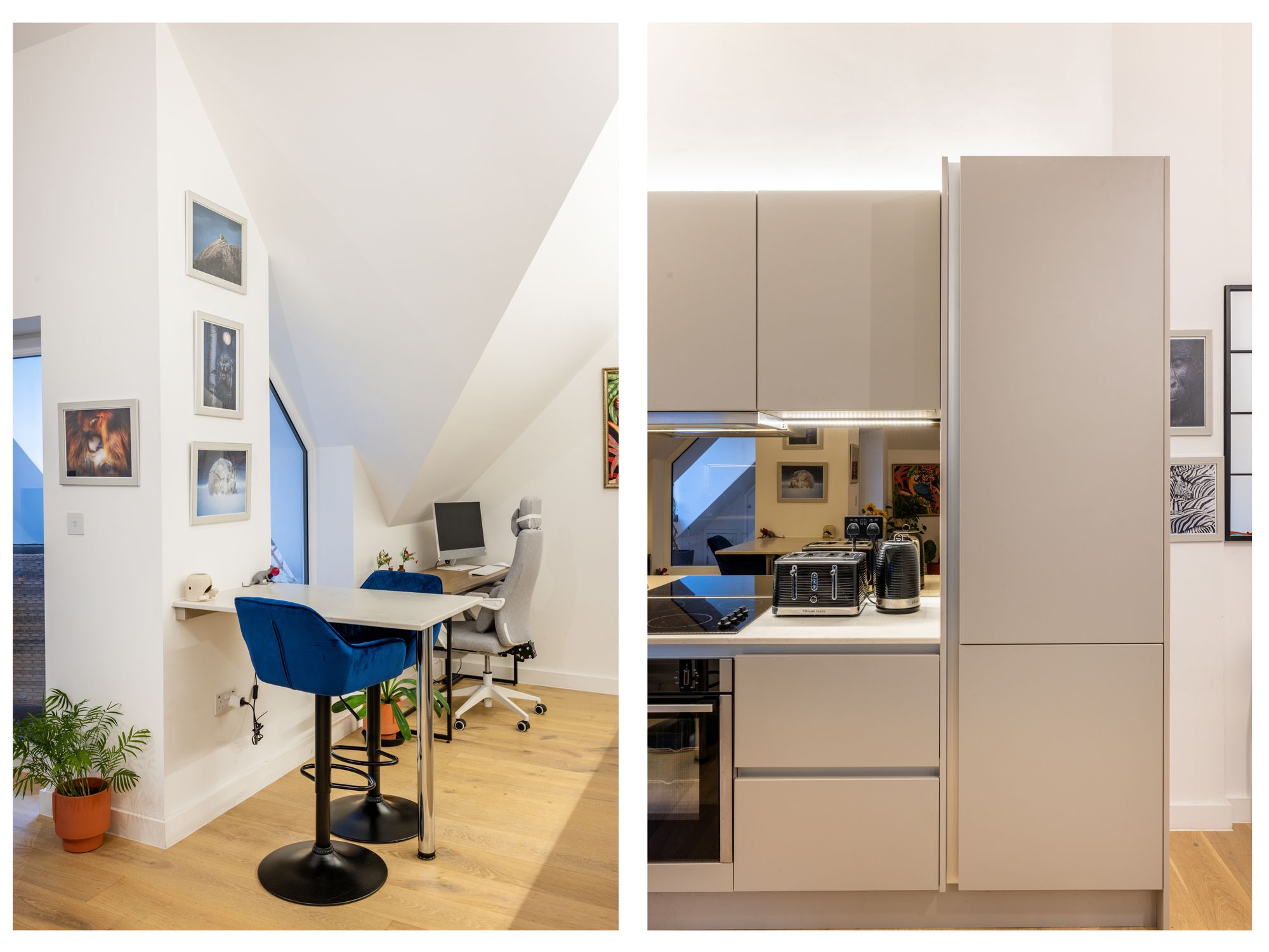 Modern two bedroom top floor apartment built in 2021, featuring high ceilings, open-plan kitchen/living space with balcony, integrated appliances and two spacious bedrooms in Purley.