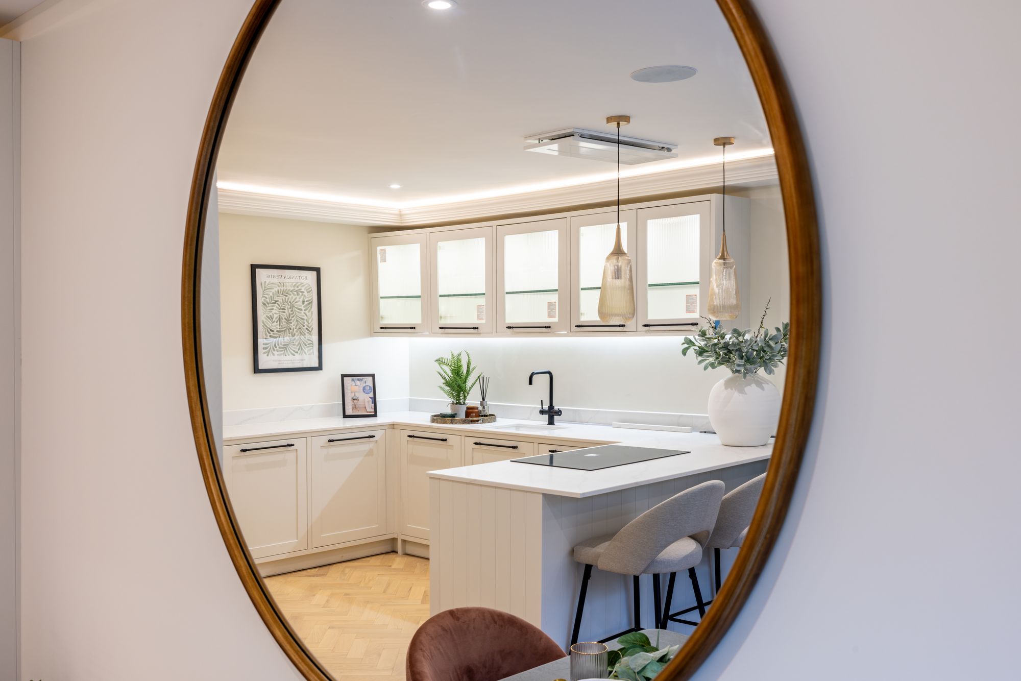 The kitchen itself features a sleek Shaker-style design with soft linen-toned cabinetry and striking Treviso quartz worktops, known for both their durability and elegance. Integrated Neff appliances offer seamless functionality, while a boiling water tap adds everyday convenience.
