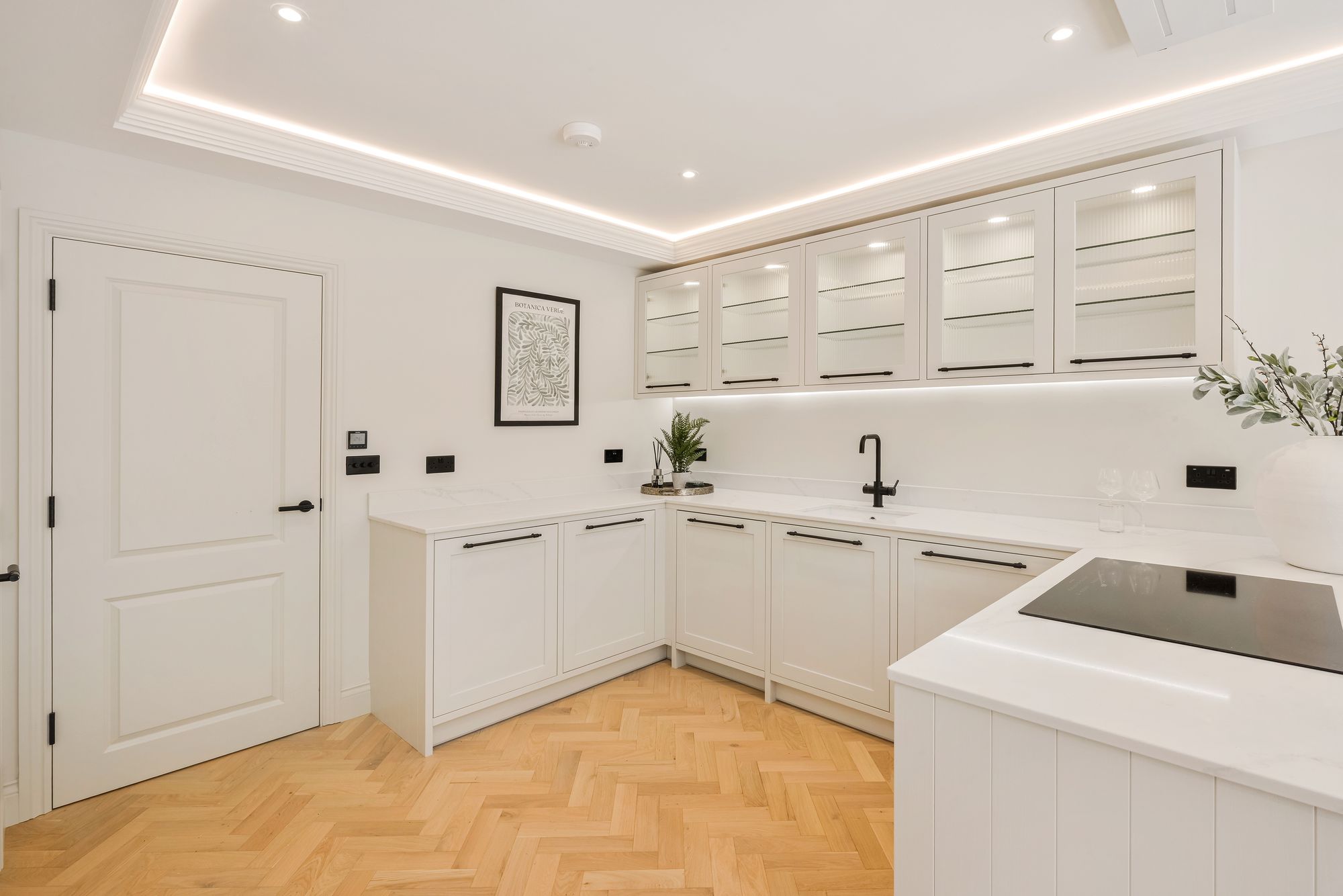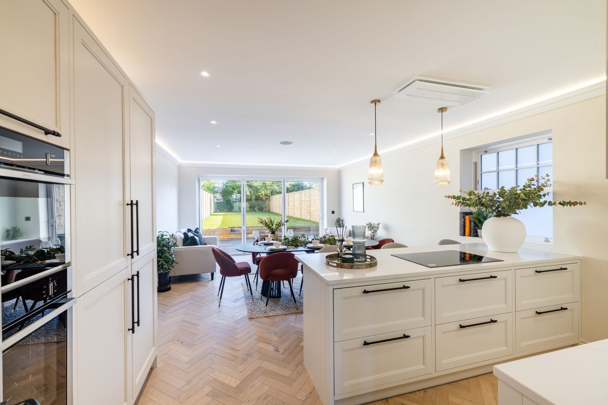At the rear, the open-plan kitchen and dining space is truly the heart of the home, opening out via bifold doors onto a private rear garden complete with low-maintenance composite decking, ideal for entertaining during warmer months. The sleek Shaker-style kitchen blends traditional elegance with contemporary design. Soft linen-coloured units contrast subtly with durable Treviso quartz worktops, creating a refined aesthetic that’s both practical and visually stunning.