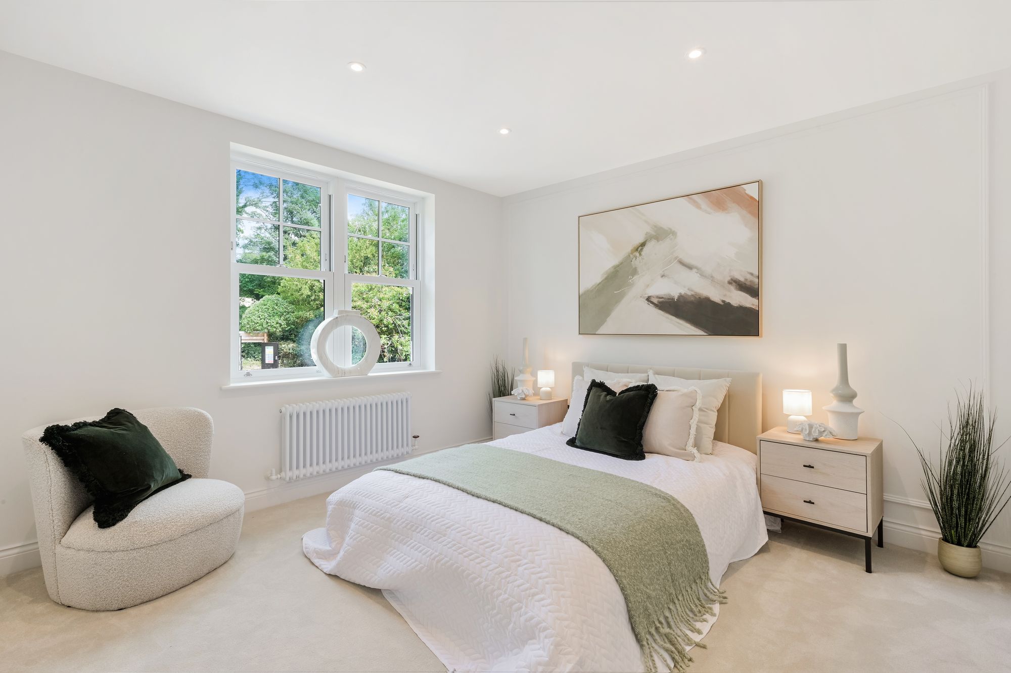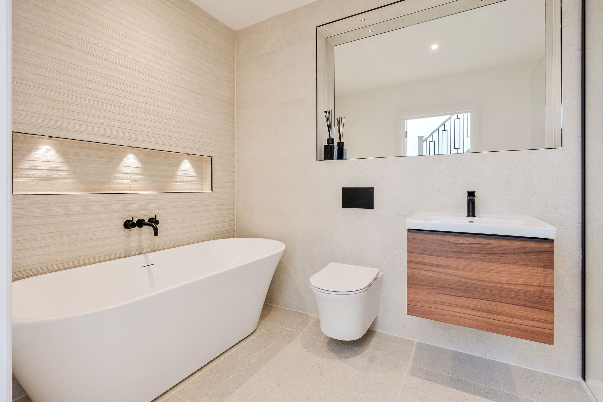 Upstairs, spread across the first and second floors, are four generously proportioned double bedrooms, some featuring luxurious built-in wardrobes. Each room offers plush carpeting and a calm, inviting retreat. The modern family bathrooms have been styled with a contemporary finish, including sleek white Duravit sanitaryware paired with striking black fittings. Expect walk-in showers and/or bathtubs, basin units with mixer taps, and soft-close WCs with flush plates, all enhanced by chrome heated towel rails and Porcelanosa textured tiling.