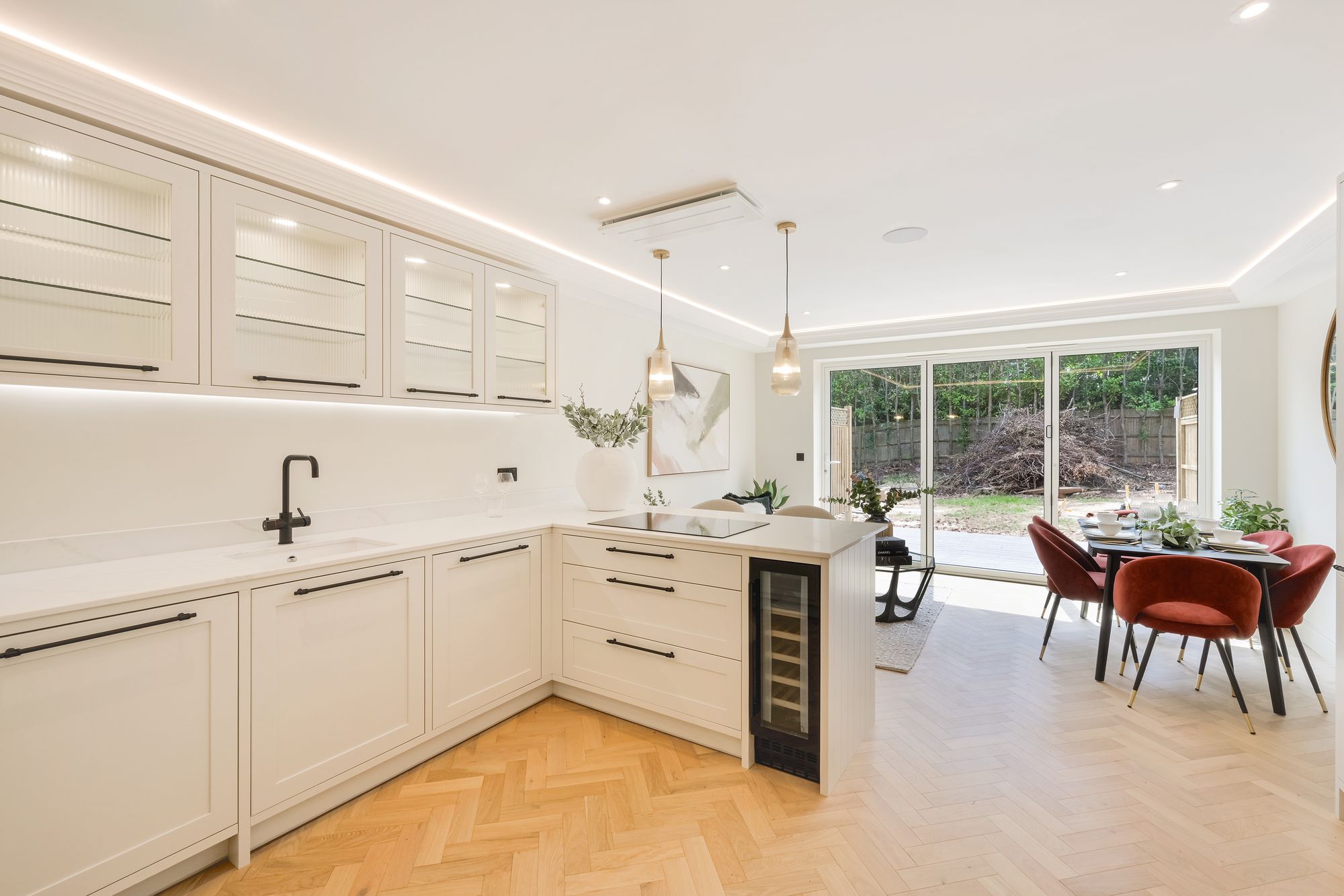 At the heart of the home, the stunning open-plan kitchen/dining area is designed for both everyday living and entertaining. Featuring classic Shaker-style cabinetry in a soft linen tone, Treviso quartz worktops, integrated Neff appliances, and a boiling water tap, this kitchen is both elegant and practical. Bifold doors lead out to a low-maintenance composite decked garden which is ideal for alfresco dining in the warmer months.