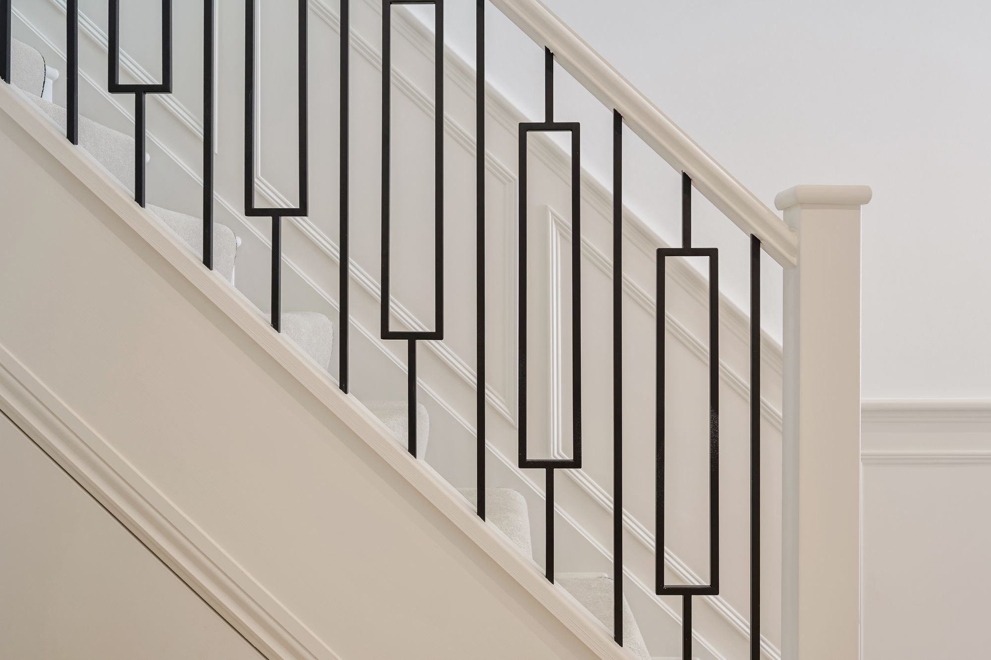 Upstairs, the first and second floors host four generously sized double bedrooms, some with bespoke fitted wardrobes. Plush carpeting and calming tones create a sense of retreat. Bathrooms are sleek and contemporary, fitted with Duravit sanitaryware, black accents, and Porcelanosa textured tiling. Each includes either a walk-in shower, separate bath, or both.
