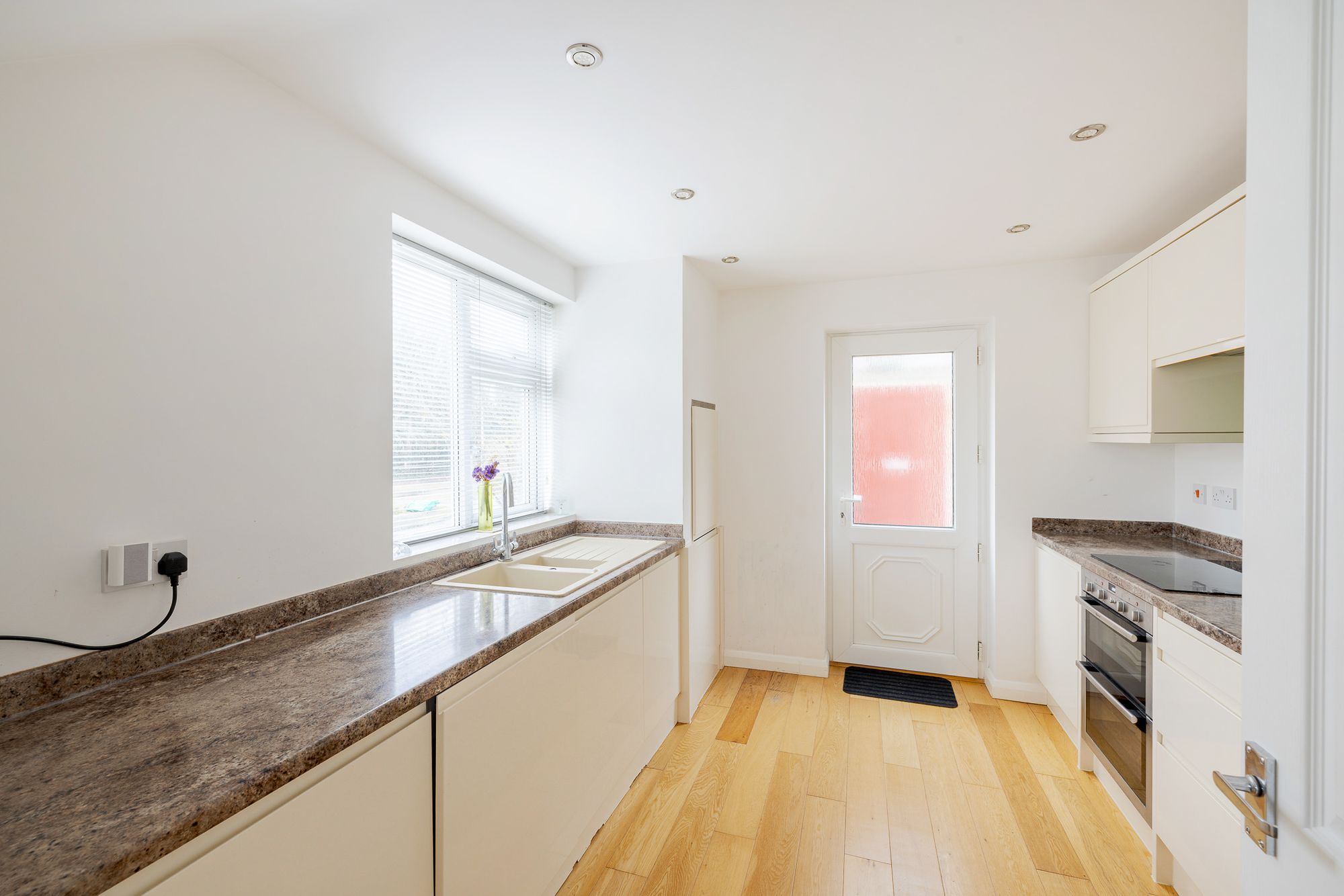 The separate kitchen, presented in good condition, features engineered hardwood flooring, an abundance of countertop space, and built-in appliances. The kitchen also benefits from direct access to the garden patio, adding to the home’s practical flow.