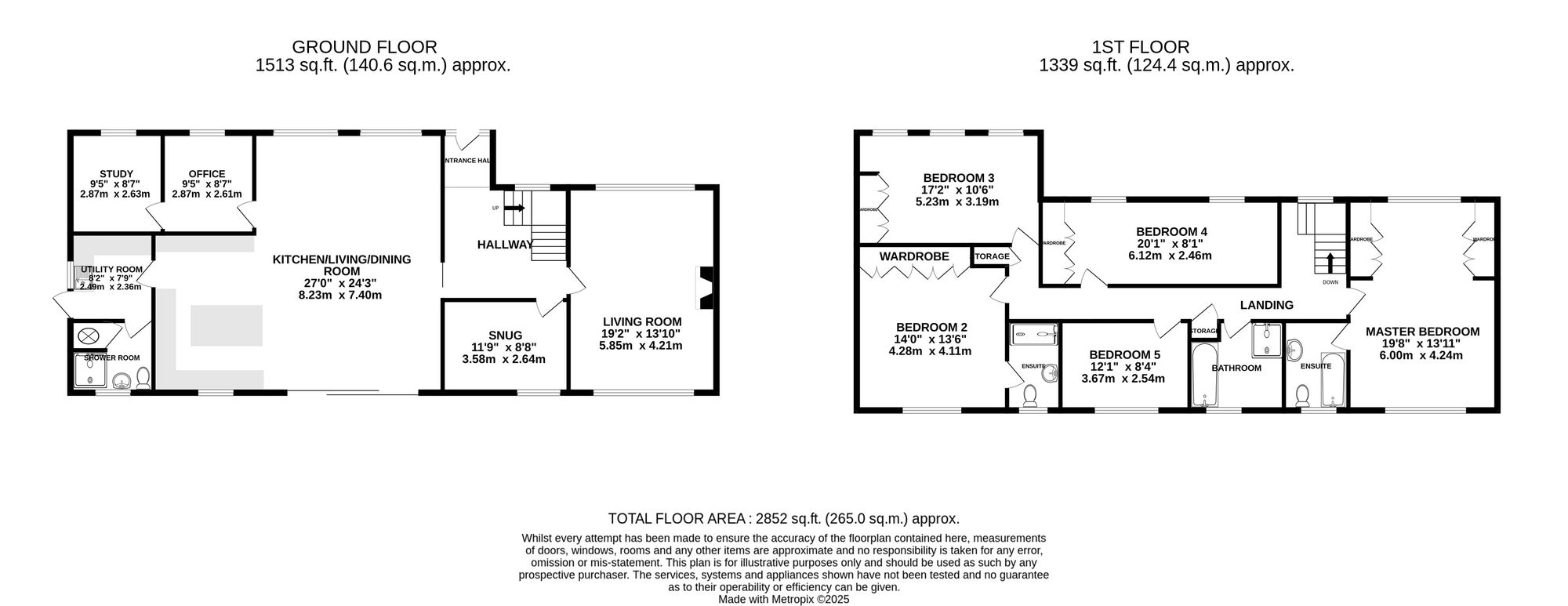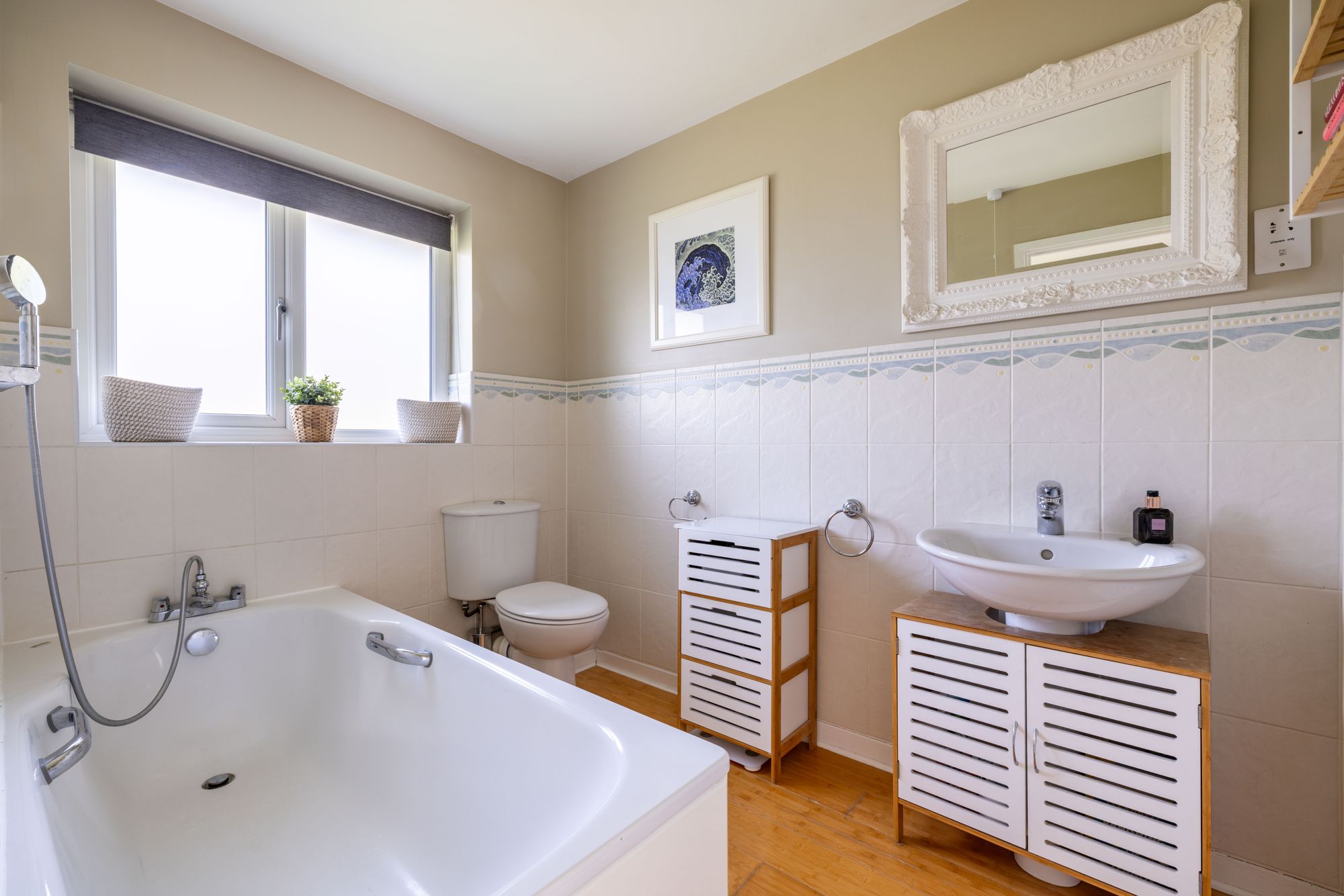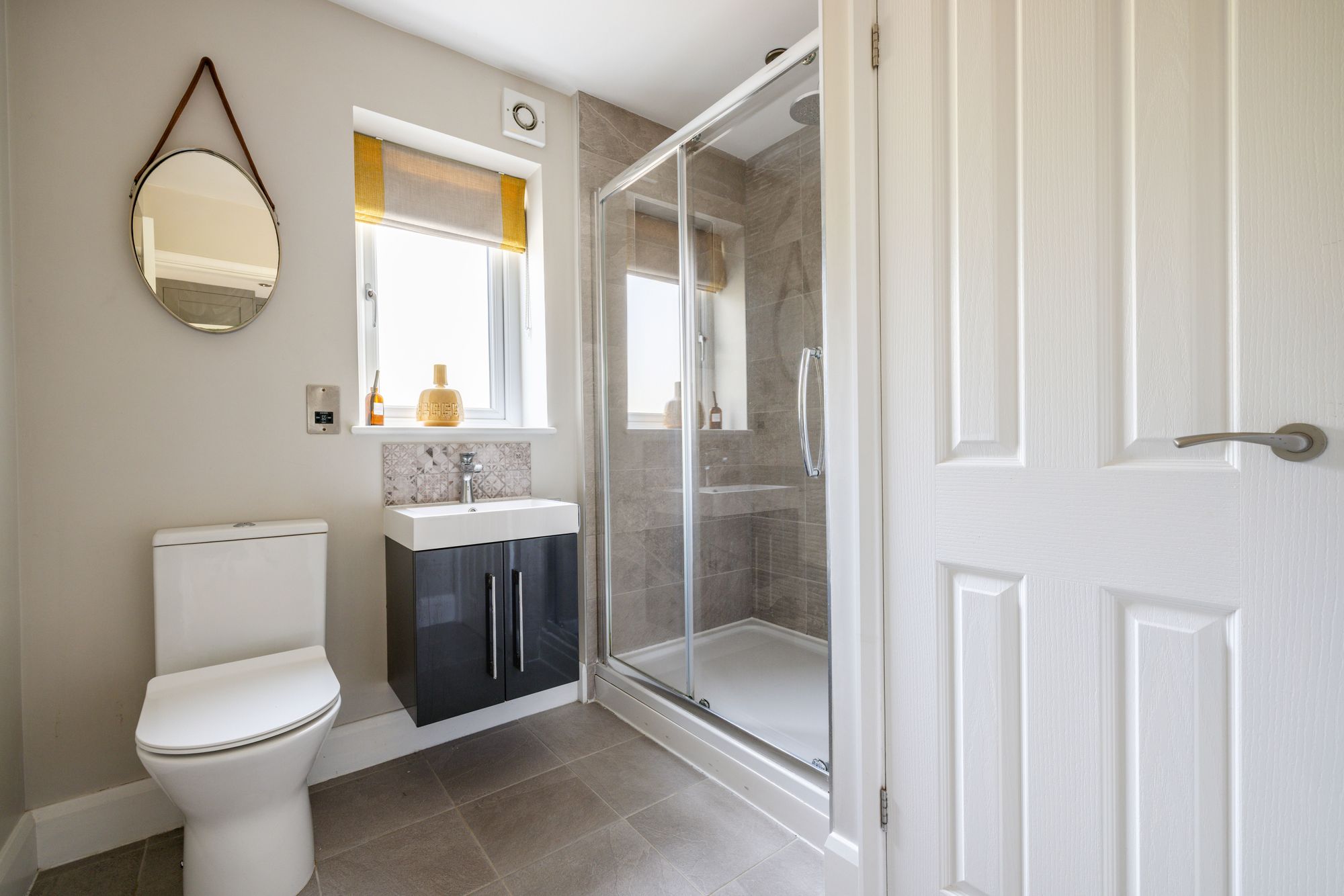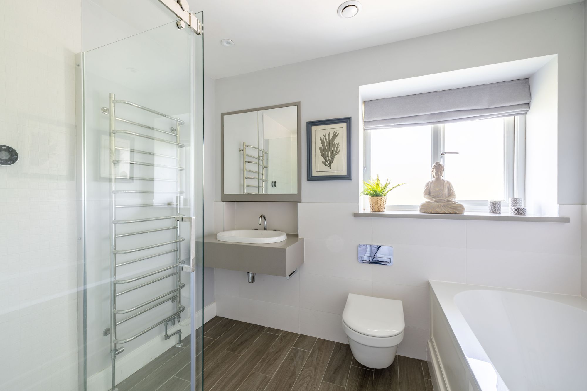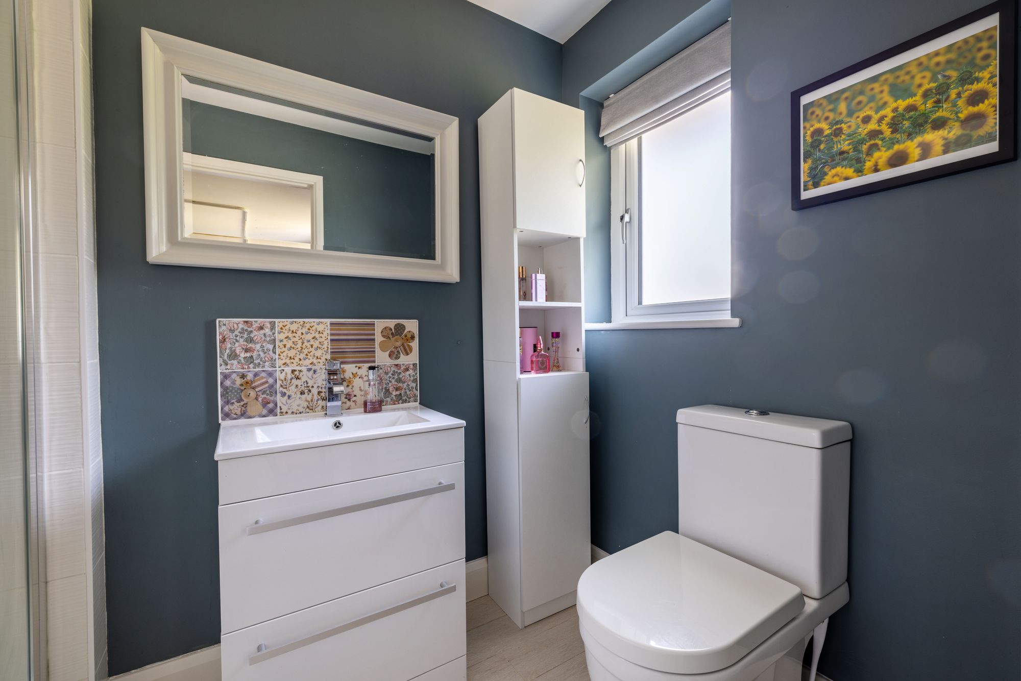 As you ascend the stairs, the master bedroom awaits with its dual aspect views, built-in his and hers wardrobes, and a ensuite bathroom. The second bedroom also boasts ample storage and an ensuite shower room, while the remaining three spacious double bedrooms feature built-in wardrobes for added convenience. The upstairs has an additional family bathroom with shower and a stunning tile design.