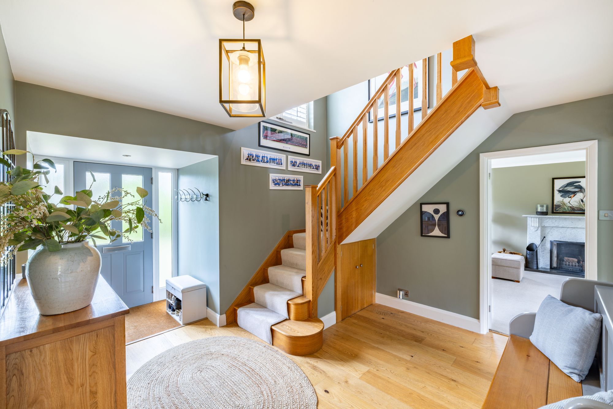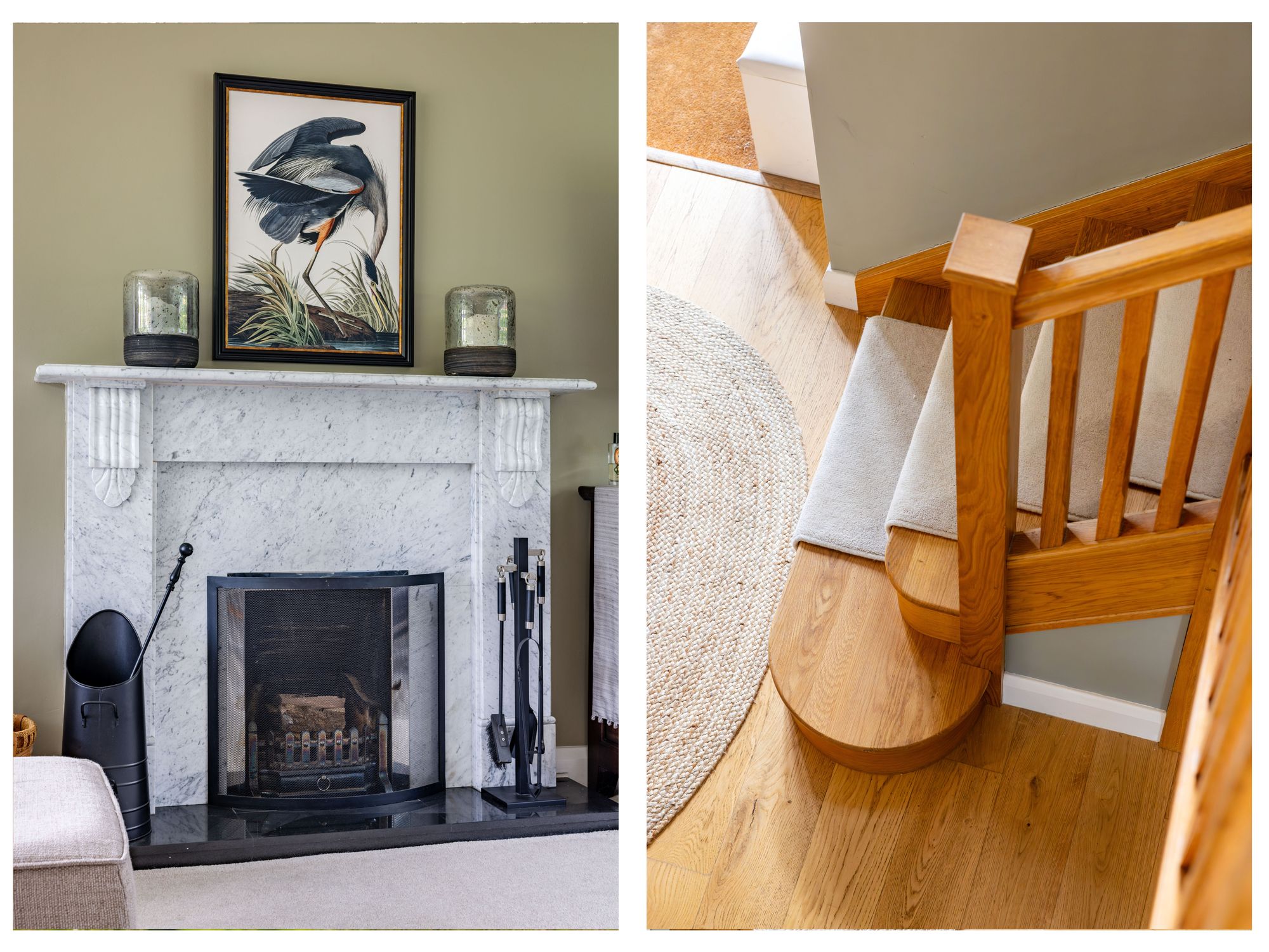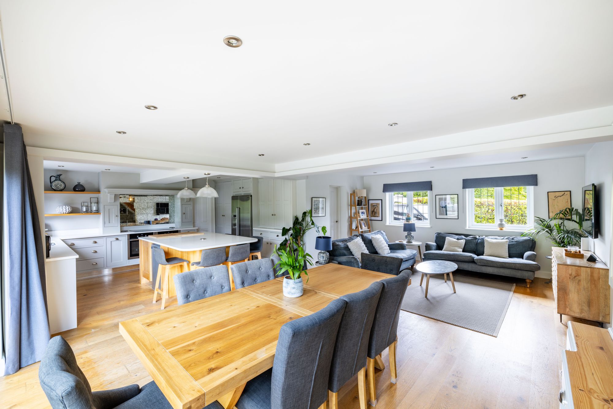 Beyond the grand entrance hall, you’re greeted by a spacious lounge bathed in natural light, boasting a fireplace that exudes warmth and charm. To the right, the open plan kitchen/living/dining area beckons, a real hub of the home. The bespoke hand-crafted kitchen features solid stone worktops, an island perfect for dining and storage, and seamless access to the patio through sliding doors. Off the Kitchen is the utility room and downstairs shower room both newly modernised and bringing further functionality to the down stairs.
