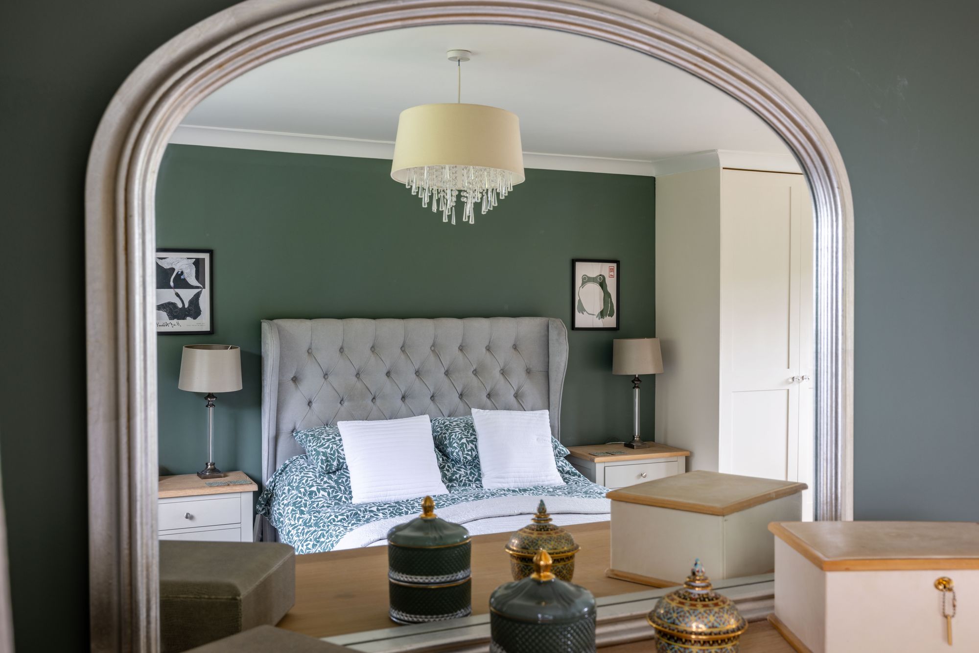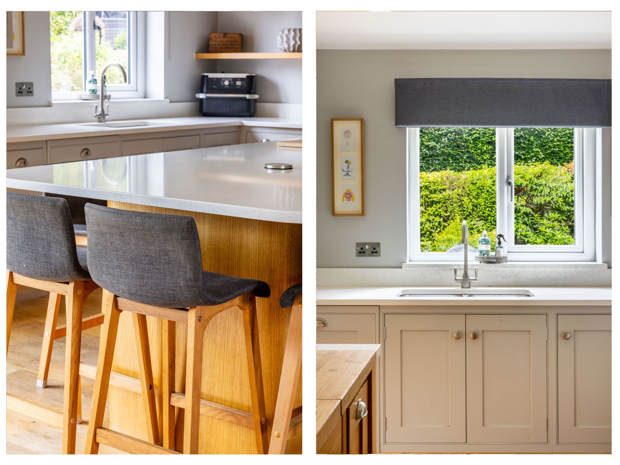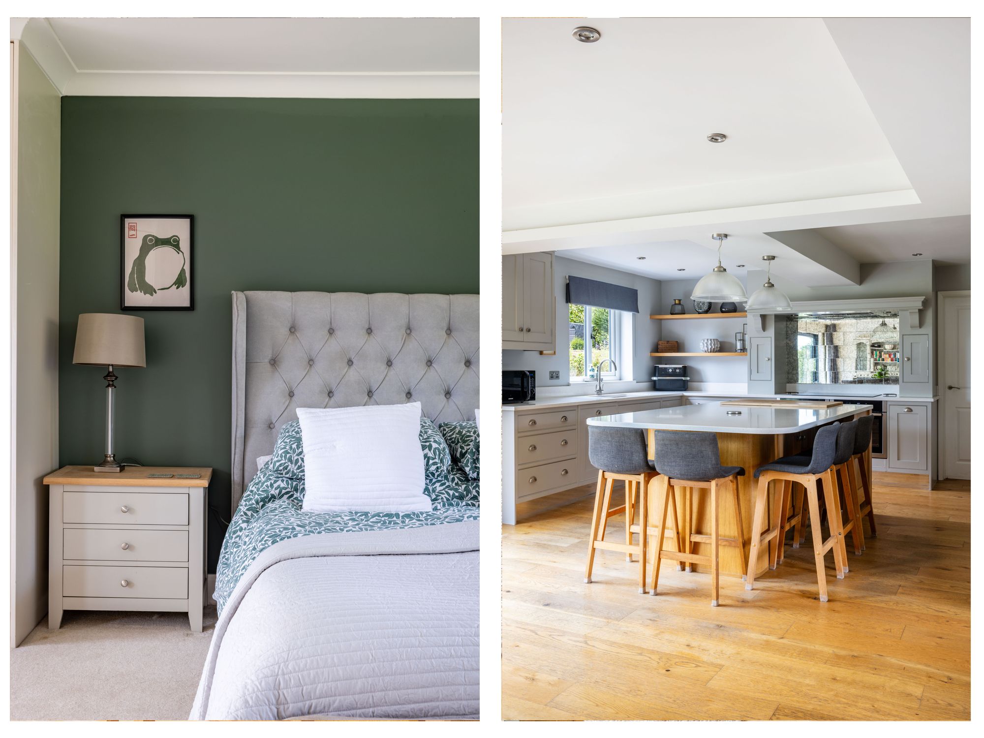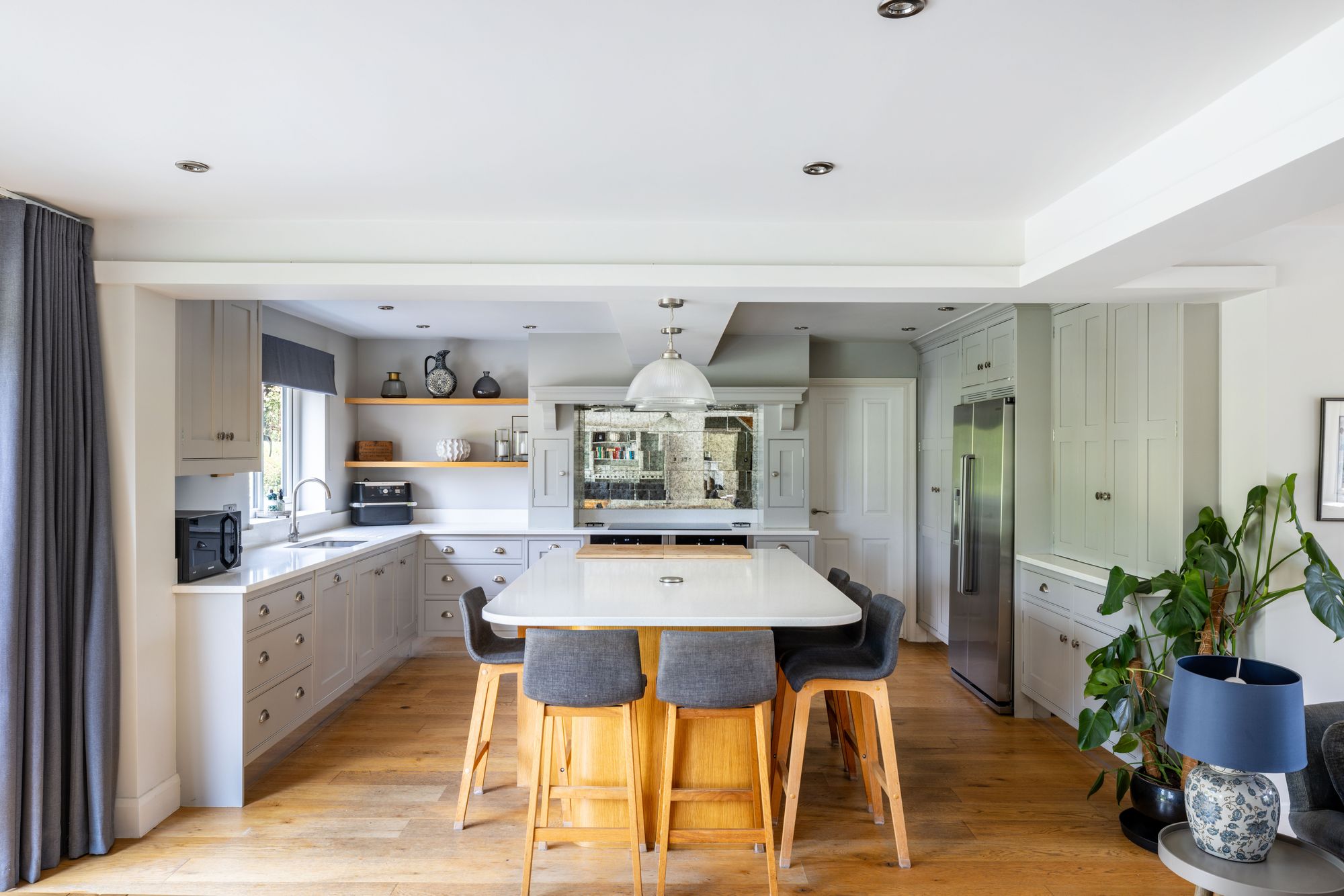 Beyond the grand entrance hall, you’re greeted by a spacious lounge bathed in natural light, boasting a fireplace that exudes warmth and charm. To the right, the open plan kitchen/living/dining area beckons, a real hub of the home. The bespoke hand-crafted kitchen features solid stone worktops, an island perfect for dining and storage, and seamless access to the patio through sliding doors. Off the Kitchen is the utility room and downstairs shower room both newly modernised and bringing further functionality to the down stairs.
