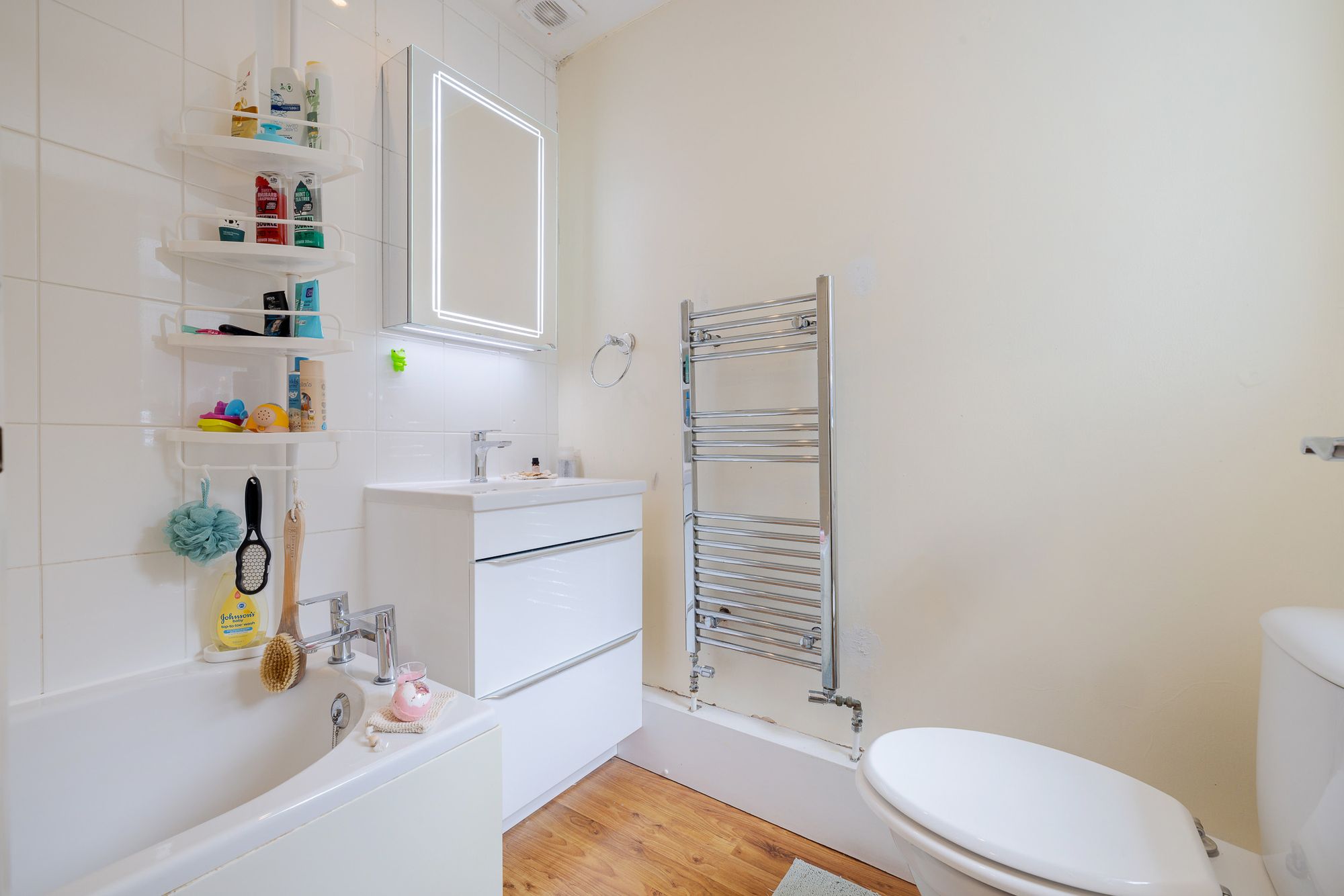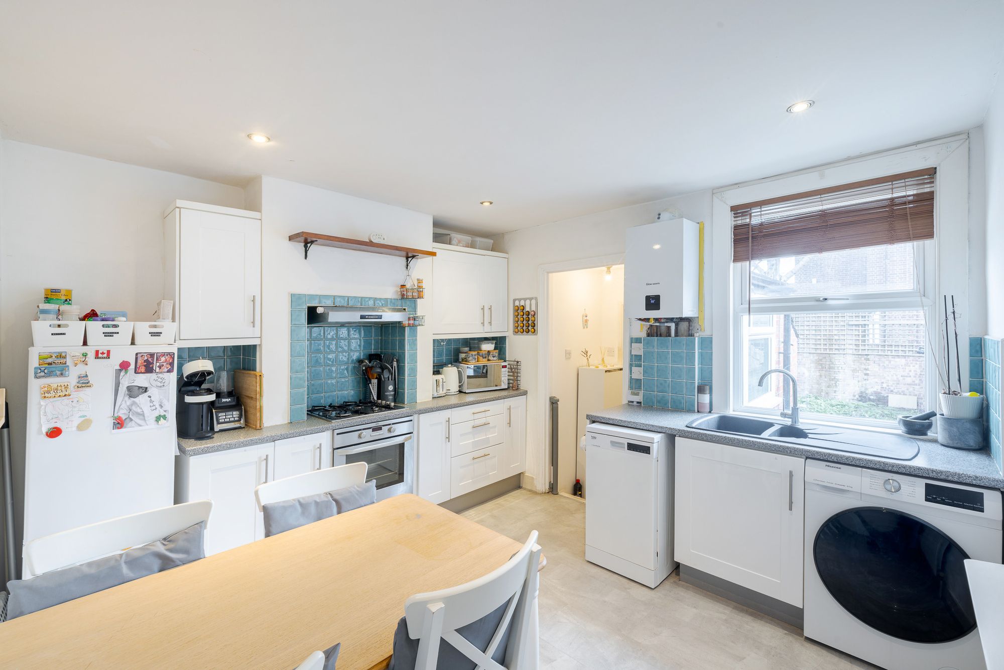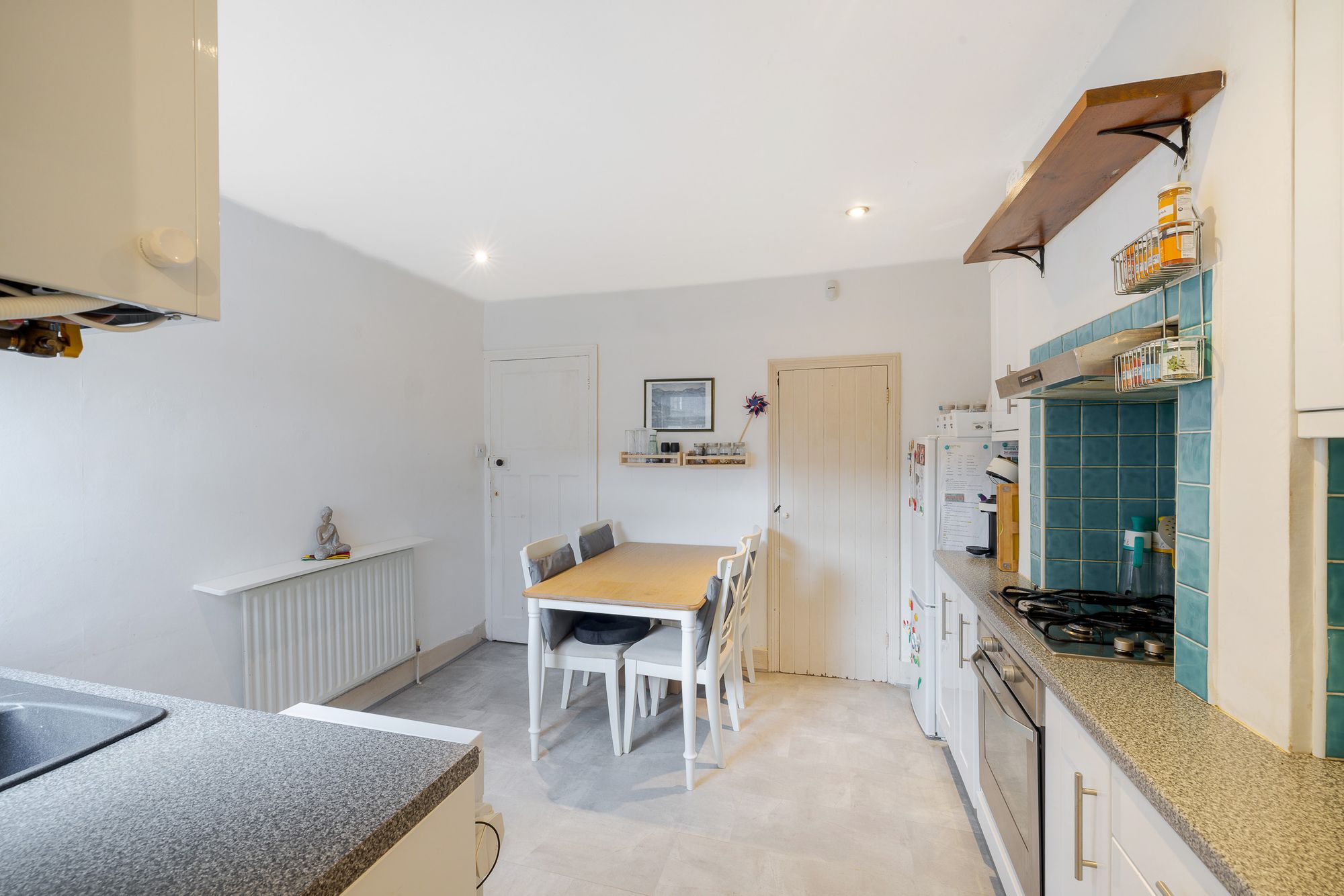 To the rear of the property, the kitchen provides ample storage and worktop space, with room for a small dining table, making it a practical and sociable space. Beyond the kitchen is the downstairs bathroom, and a door between the kitchen and bathroom provides access to the rear garden.
