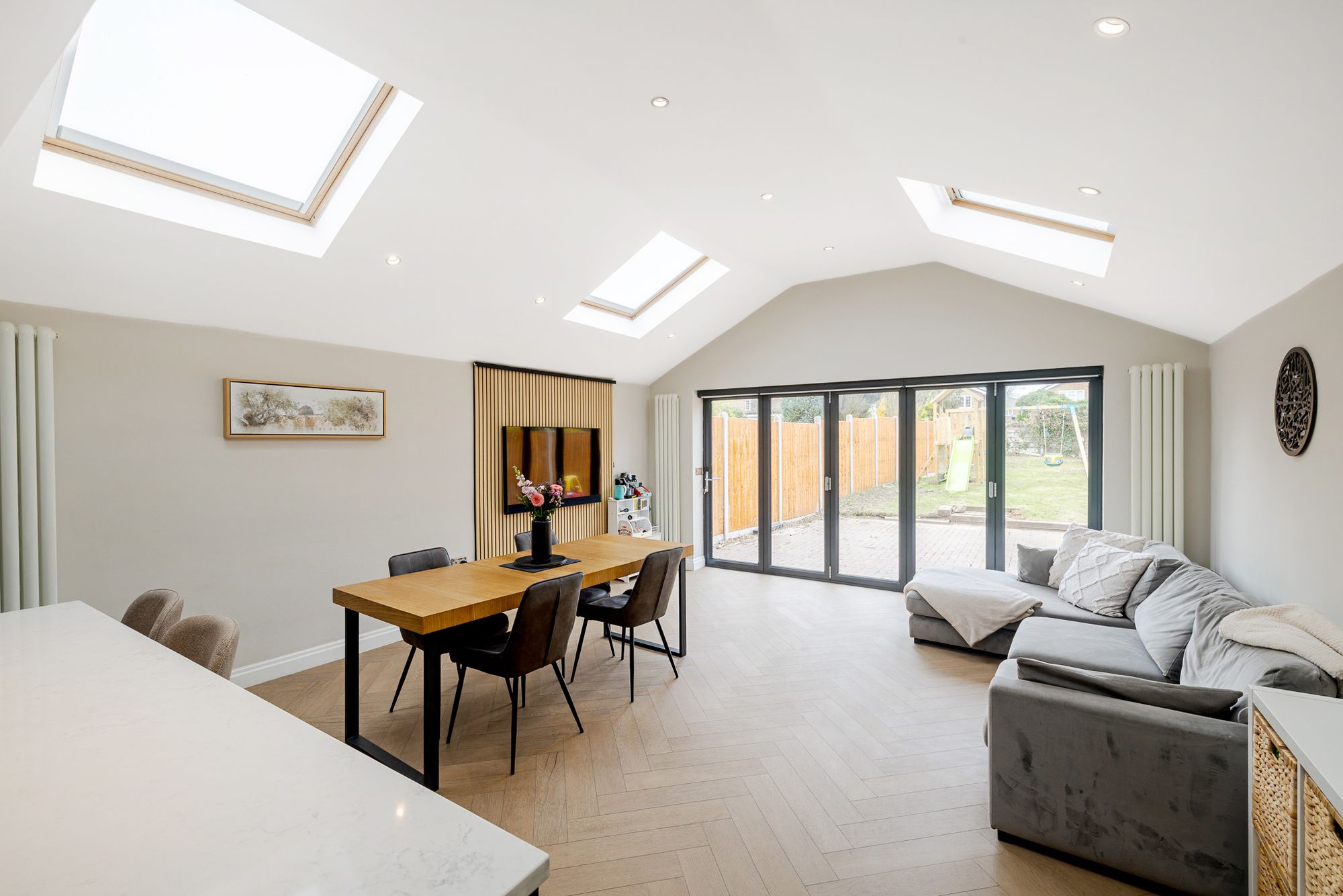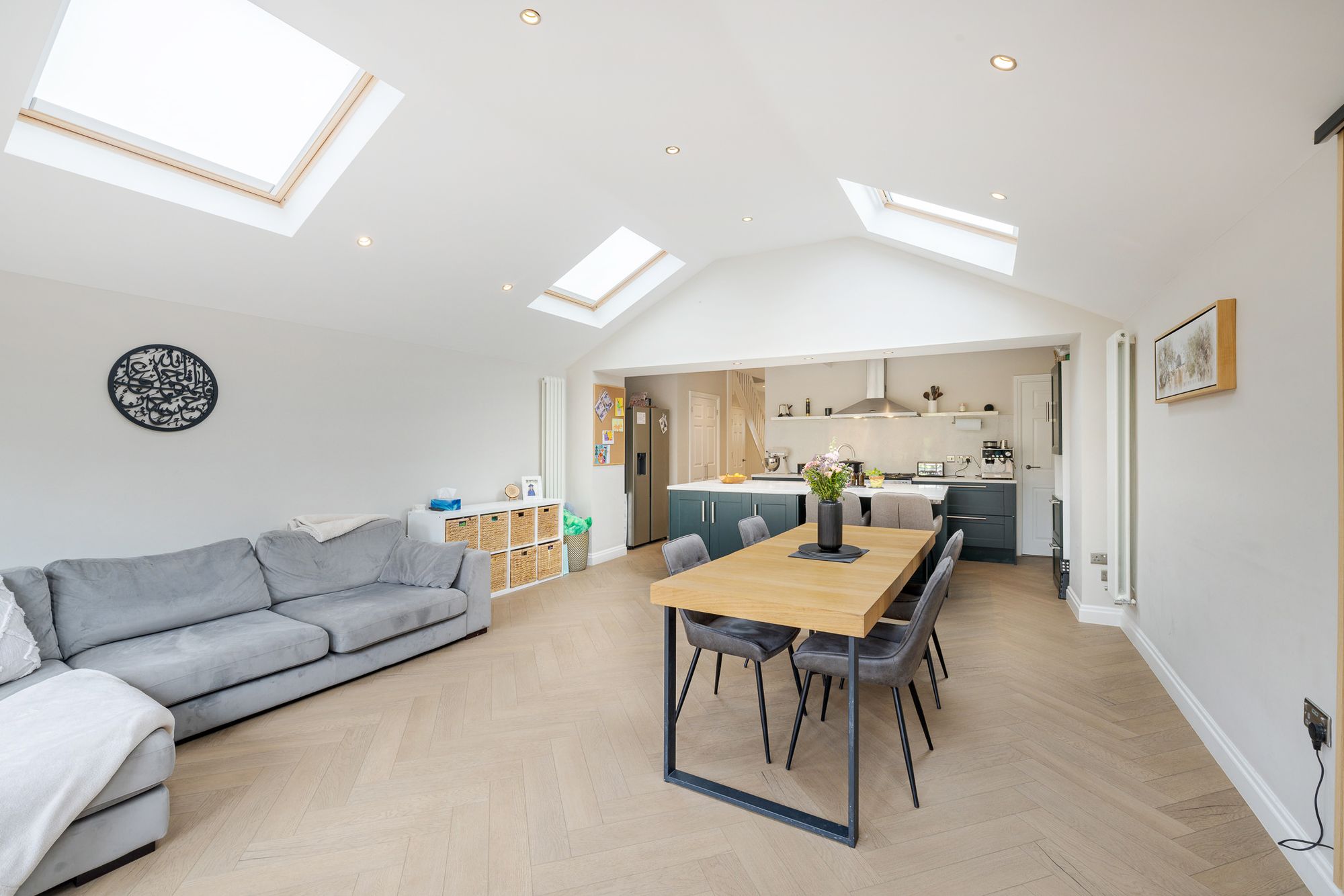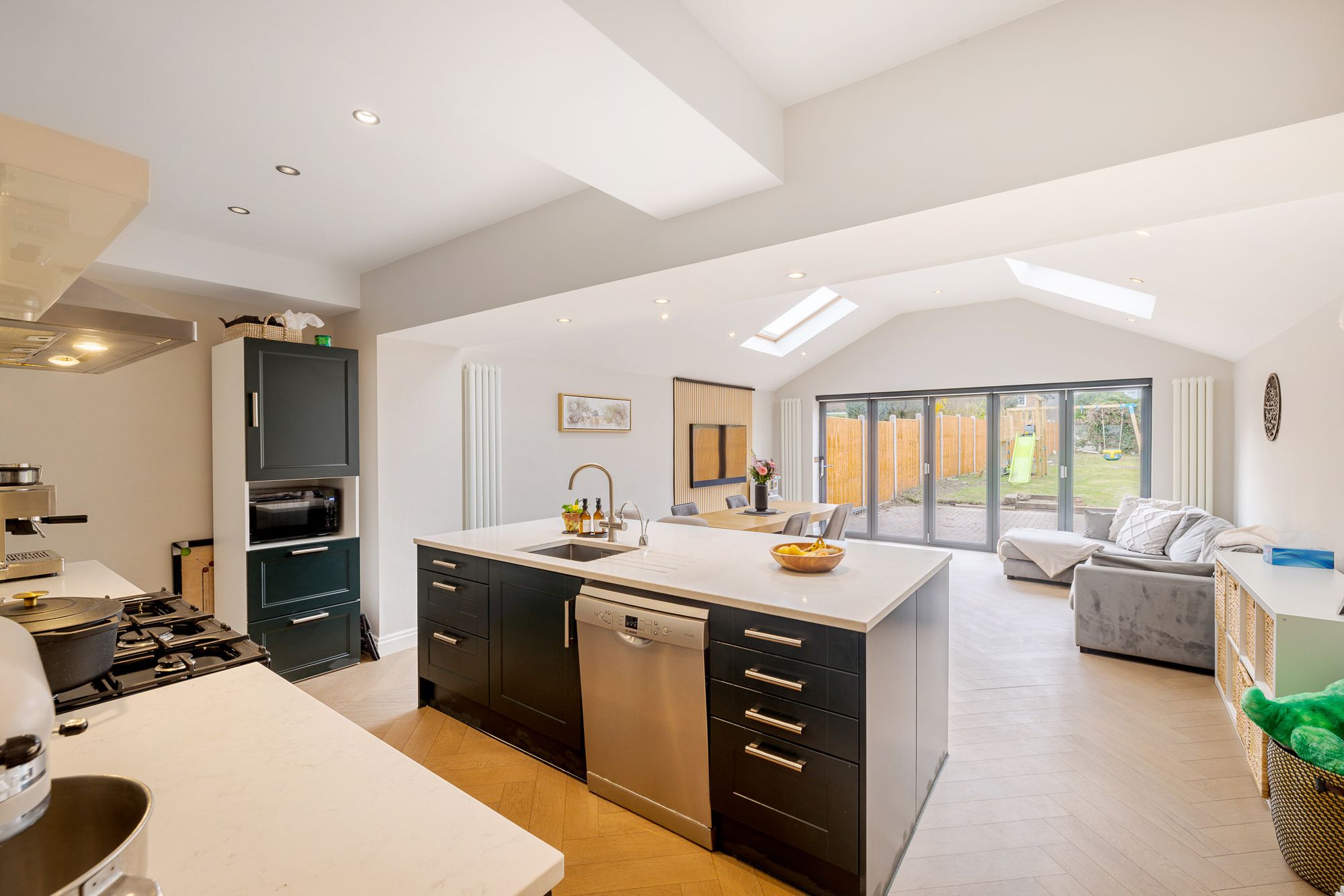 To the rear, the property truly comes into its own with an impressive open-plan kitchen/family room, designed with both style and functionality in mind. The shaker style kitchen is complemented by quartz worktops, a feature island, and an abundance of natural light from skylights above. Bifolding doors open seamlessly onto the garden, making this an ideal space for entertaining and everyday family life, with ample room for both dining and relaxing. Herringbone flooring runs throughout the entire ground floor, adding a touch of elegance and continuity.